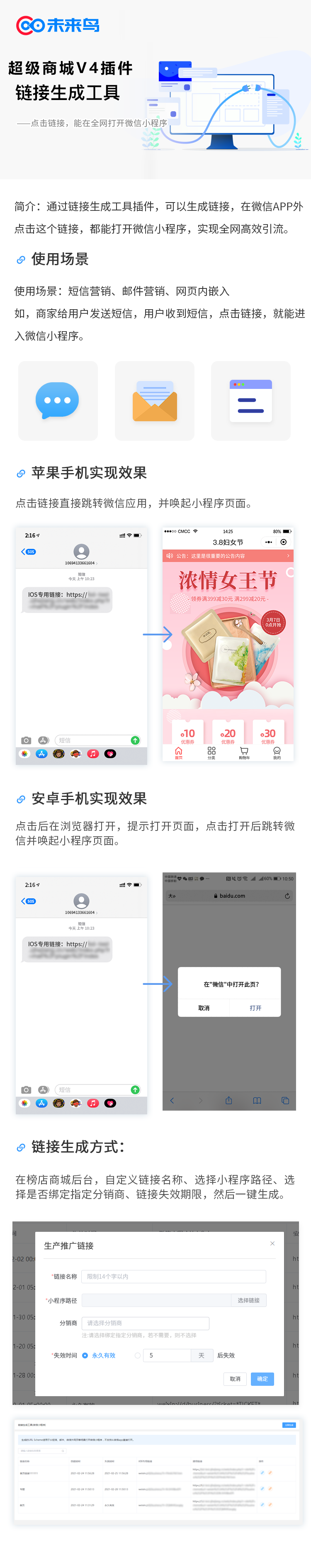 #### 关于微信链接生成工具  #### 1、进入微信链接生成工具,点击生成链接,填写相关信息   #### 2、点击复制通用链接或者IOS链接粘贴到微信或者短信即可