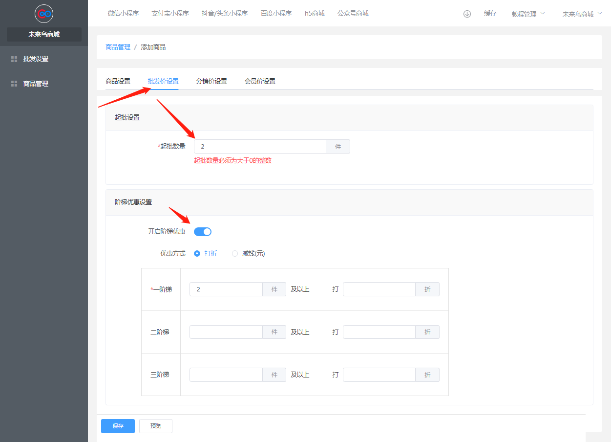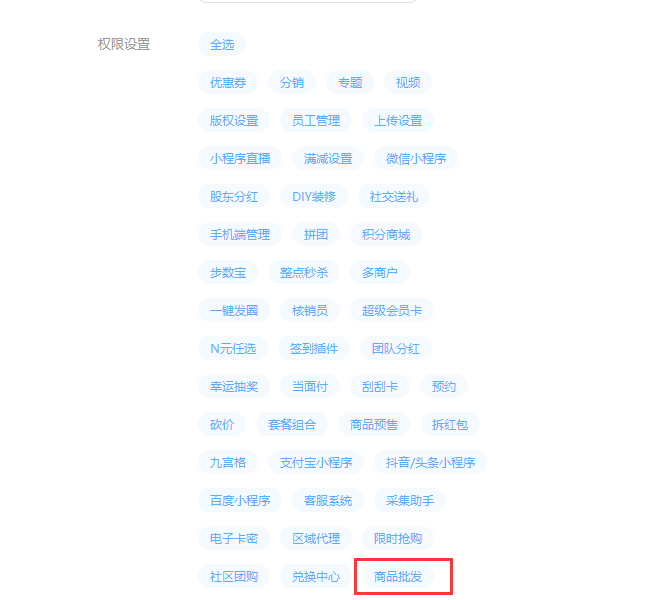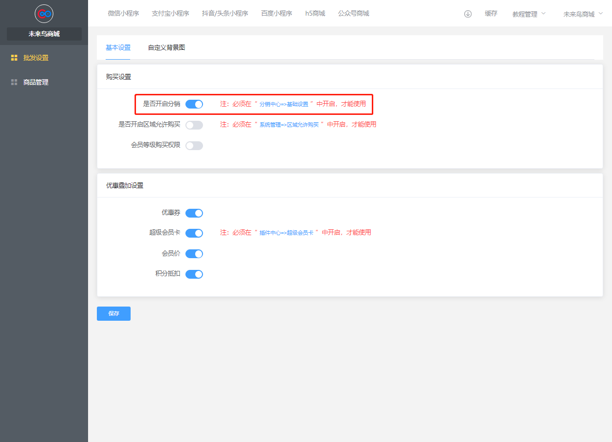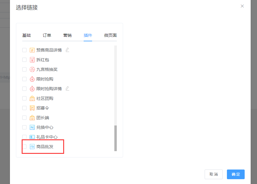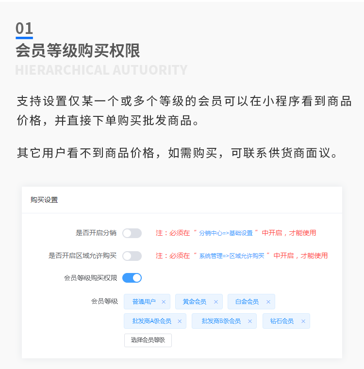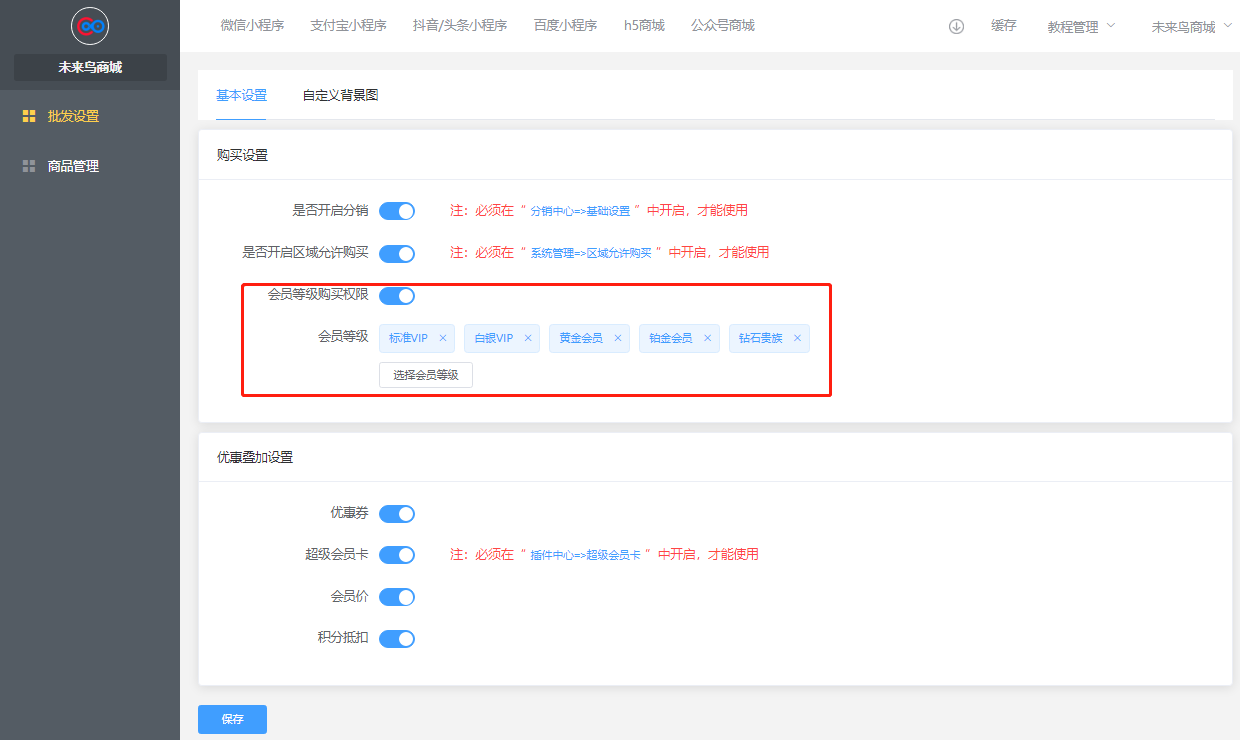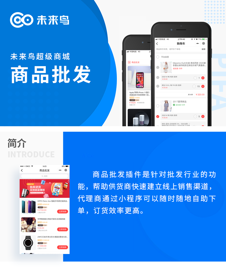 ### 关于商品批发       ### 1 产品简介 定义: 批发是买家购买的商品越多,享受的商品单价越低的购买方式。商家对商品设置不同的阶级价格, 促成买家购买更多的商品。 目的: 商家:一单多卖 买家:购买多件商品是,价格更优惠 使用场景: 批发商和零售商的交易场景 ### 2 功能说明 1.批发商品 批发商品需从商城拉取后,编辑商品的批发价格。若商品的批发价未设置,则不在小程序端显示 该商品,也不能被DIY组件选取(添加商品弹窗的选中框灰掉)   2.加购和下单 批发商品可加入商城购物车,与商城商品一起下单 3.优惠叠加 4.选择链接 选择链接到插件中,增加商品批发插件(导航图标、图片魔方、标签栏、用户中心)  5.其他兼顾项目 主题色、售罄商品遮罩效果、插件商品分享海报 6.分销 参与分销商、团队分红、股东分红和区域代理的佣金计算  7.其他补充说明 后台订单管理-订单列表中,增加商品批发插件的筛选 不支持电子卡密商品  8.购买权限 可以设置特定会员等级的用户才能查看价格跟购买,其他用户只能看到面议  9.前端展示 需要小程序前端4.3.53版本才能点击进入批发首页跟操作批发功能 需要给用户插件权限