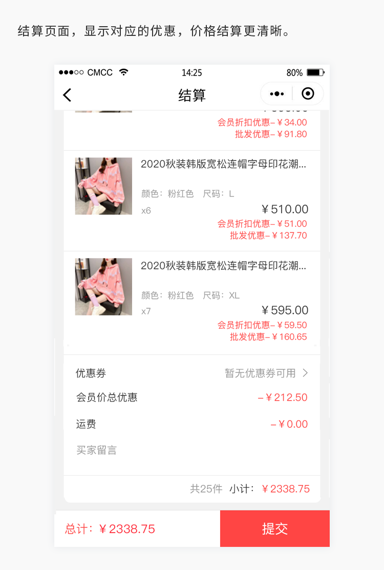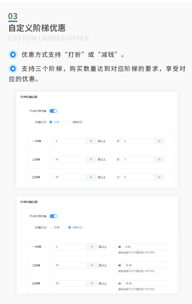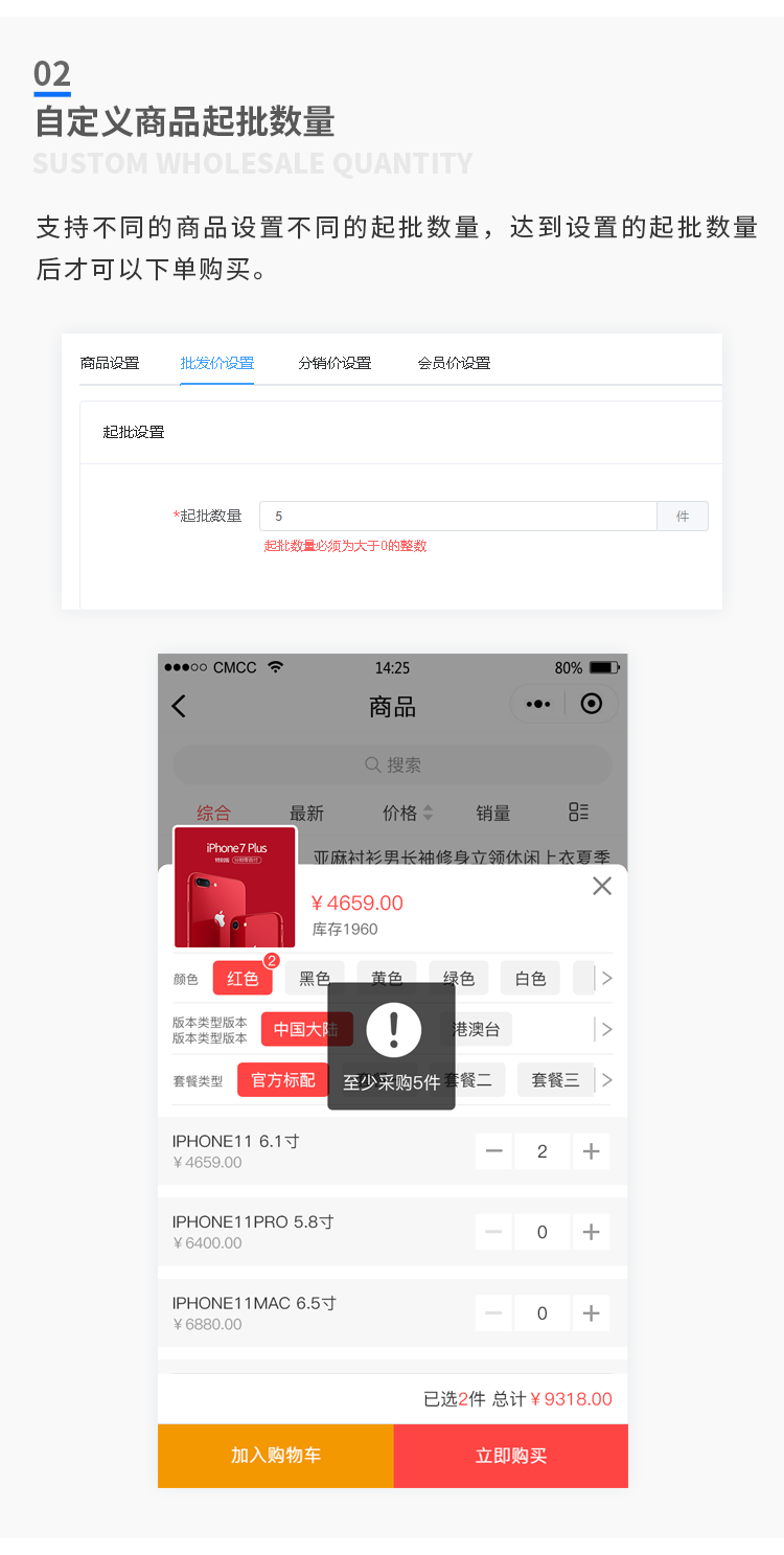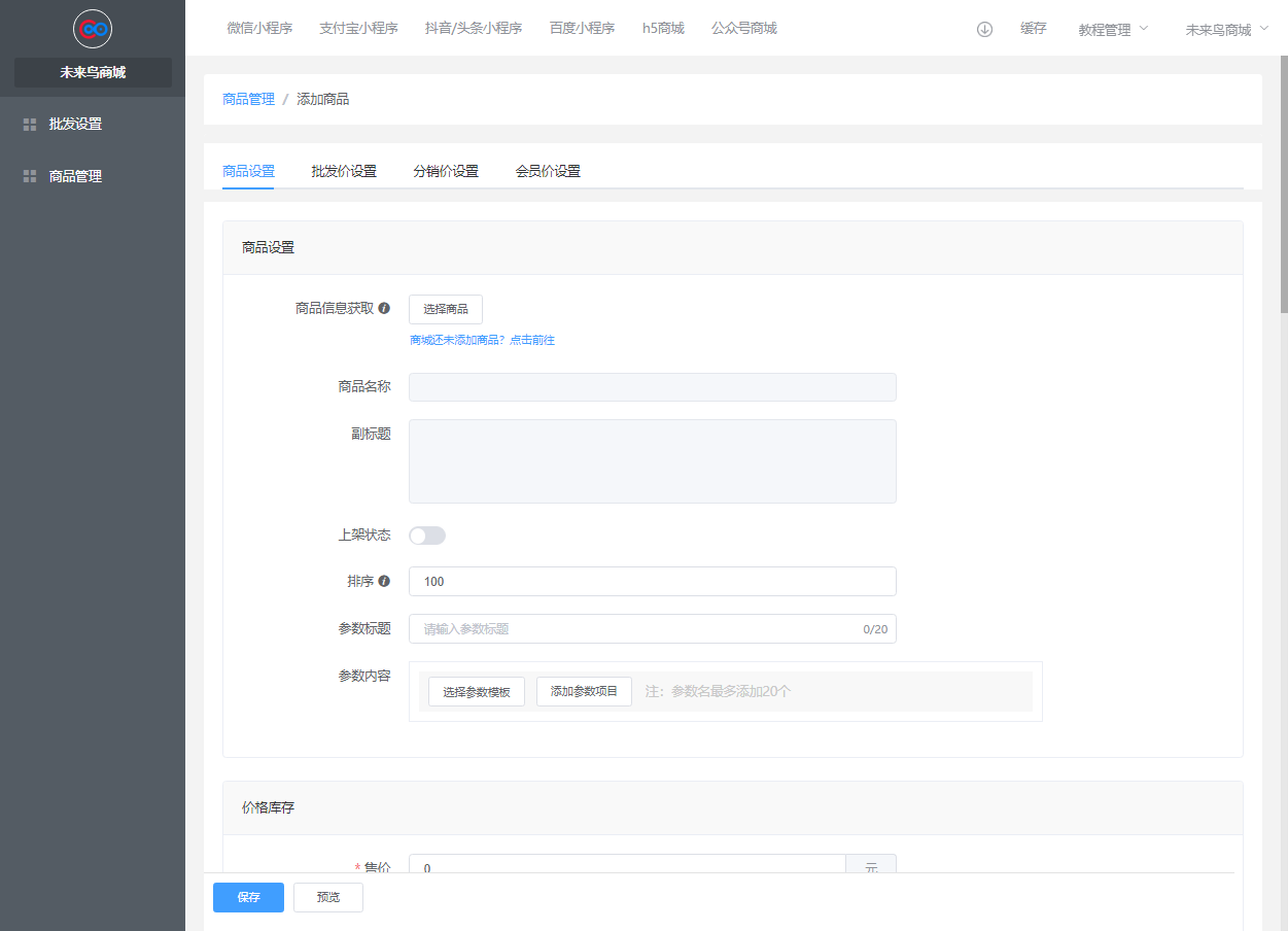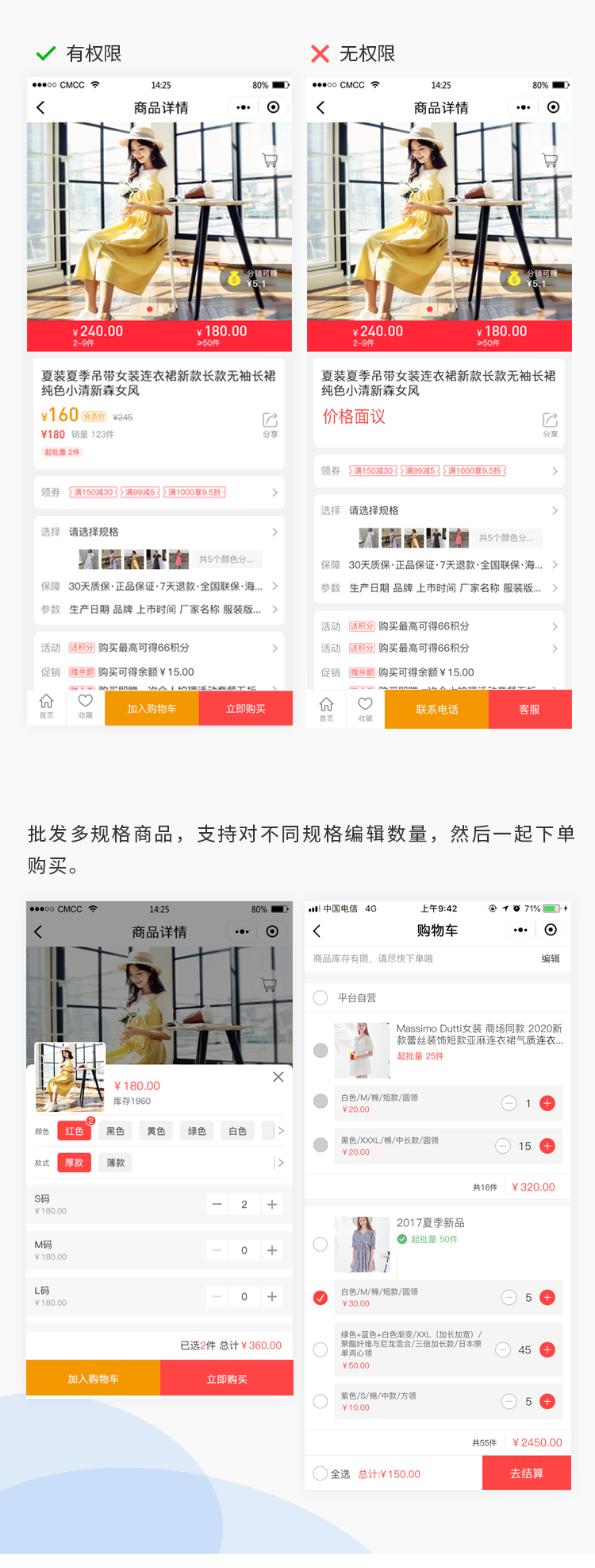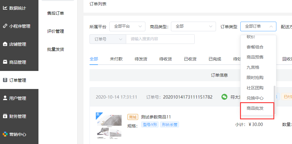 ### 关于商品批发       ### 1 产品简介 定义: 批发是买家购买的商品越多,享受的商品单价越低的购买方式。商家对商品设置不同的阶级价格, 促成买家购买更多的商品。 目的: 商家:一单多卖 买家:购买多件商品是,价格更优惠 使用场景: 批发商和零售商的交易场景 ### 2 功能说明 1.批发商品 批发商品需从商城拉取后,编辑商品的批发价格。若商品的批发价未设置,则不在小程序端显示 该商品,也不能被DIY组件选取(添加商品弹窗的选中框灰掉)   2.加购和下单 批发商品可加入商城购物车,与商城商品一起下单 3.优惠叠加 4.选择链接 选择链接到插件中,增加商品批发插件(导航图标、图片魔方、标签栏、用户中心)  5.其他兼顾项目 主题色、售罄商品遮罩效果、插件商品分享海报 6.分销 参与分销商、团队分红、股东分红和区域代理的佣金计算  7.其他补充说明 后台订单管理-订单列表中,增加商品批发插件的筛选 不支持电子卡密商品  8.购买权限 可以设置特定会员等级的用户才能查看价格跟购买,其他用户只能看到面议  9.前端展示 需要小程序前端4.3.53版本才能点击进入批发首页跟操作批发功能 需要给用户插件权限