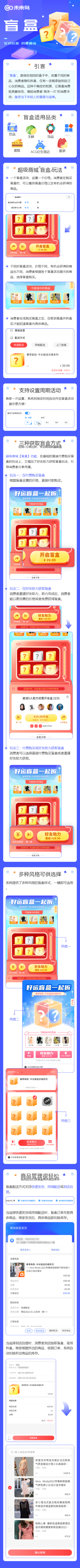 ## 1、关于盲盒  ### 1、介绍 盲盒起源于日本的福袋,已成为潮流玩具中受众面最广、热度最高的品类。 盲盒玩法指的是商家在盒子中放入不同商品,以随机拆盒巧妙利用消费者的赌徒心理,为消费者的每一次购买植入惊喜。在打开盒子前,消费者不知道盒子里面装的到底是什么,因此能够激发消费者好奇心,撩起“再来一次”的消费冲动。 适用品类:万物皆可盲盒,美妆、饰品、蛋糕、饮料甚至连生鲜都可以做盲盒。 ### 2、购买规则 ##### 获取规则1:付费购买, 盲盒售价:盲盒为包邮商品,如果支持快递发货,可考虑将配送费计入售价内。 一个活动设置1个价格。顾客在购买的时候能看到价格和可能抽中的盲盒商品是什么。 ##### 获取规则2:好友助力,消费者发起好友助力,助力完成后,以更低的价格购买盲盒。 助力有效期:15分钟至24小时之间。若设置24小时,助力需要在24小时内成团,超时则助力失败。 助力人数:2至50人之间,建议5人以下;可根据拉新成本和盲盒价值做判断,超过5人有被微信封禁的风险。 助力售价:助力成功后,发起助力人可以使用优惠价格获得盲盒。盲盒为包邮商品,如果支持快递发货,可考虑将配送费计入售价内。 助力方式:新老用户均可,同一用户同一活动只能助力一次; 仅新用户,为店铺获取新用户,指在活动期间授权的新用户; 获取数量:购买/获取盲盒数量的上线。本规则是为了防止羊毛党,建议把这里设置一定的数量,例如5个,但是不要设置1个,避免顾客买上瘾的时候无法来操作。 ### 3、配送方式: 快递发货&同城配送,到店自提。 快递发货&同城配送系统自动分配商品,在未发货之前可以修改商品,赠送的卡券优惠券都已发货时候的商品为准赠送; 自提核销店铺:具体哪家门店支持核销,可以不是盲盒活动适用售卖店铺。 到店核销有效期:即开盒后多长时间内,顾客到店核销有效,过期则无法核销,用户无法申请退款,订单状态变成已关闭,只有后台能操作退款,退款之后订单变成已取消。 核销的时候核销员根据当场开盒结果选择商品核销 ### 4、库存扣除规则: 库存分为盲盒库存/实际库存 盲盒库存即为设置的盲盒数量,实际库存为所有选的商品(对应规格下)的总库存,在小程序端哪个小就显示哪个库存; 快递/同城,下单扣除盲盒库存+对应商品库存;核销订单,先扣除盲盒库存,不扣除商品库存,当核销之后根据选择的核销商品扣除商品库存; 当核销过期后台操作退款,订单变成已取消之后,返回盲盒库存; ### 5、退款售后: 盲盒商品不支持货到付款,并且付款之后无法申请退款或者申请售后,仅支持联系客服处理纠纷 注意:退款只能在商家端操作强制取消或者强制售后,用户无法申请 ### 6、.流程图:   ## 二、功能介绍  ### 1.基础设置   ### 2.活动管理       ### 3.活动数据  快递发货&同城配送,到店自提。 快递发货&同城配送系统自动分配商品,在未发货之前可以修改商品,赠送的卡券优惠券都已发货时候的商品为准赠送; 自提核销店铺:具体哪家门店支持核销,可以不是盲盒活动适用售卖店铺。 到店核销有效期:即开盒后多长时间内,顾客到店核销有效,过期则无法核销,用户无法申请退款,订单状态变成已关闭,只有后台能操作退款,退款之后订单变成已取消。 核销的时候核销员根据当场开盒结果选择商品核销;