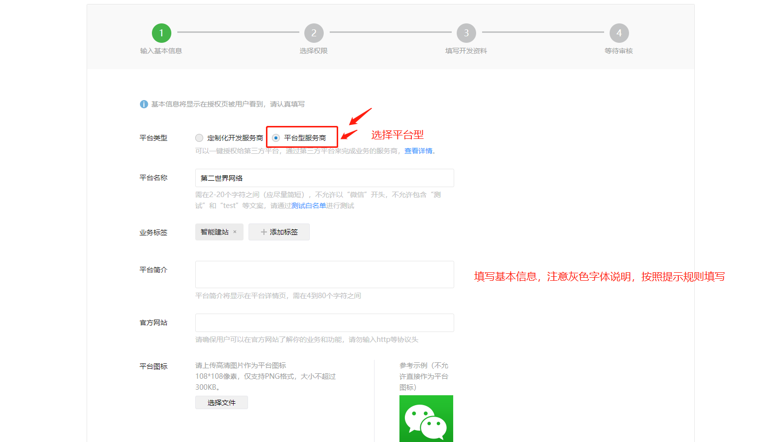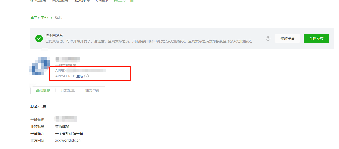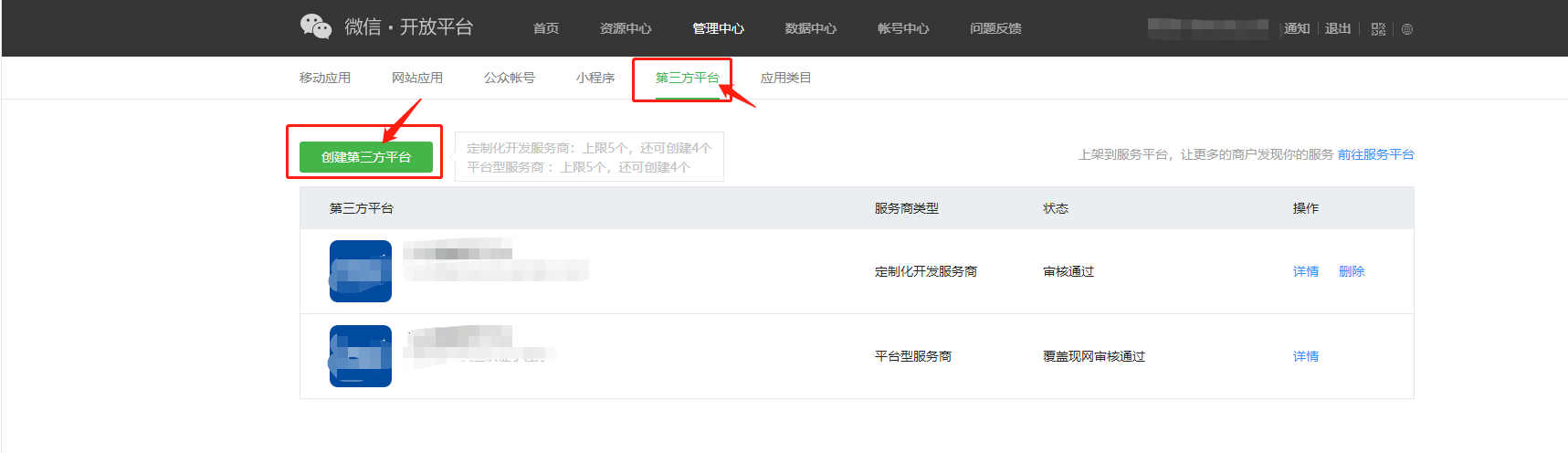 ## 第三方开放平台创建的具体步骤入如下 【创建第三方开放平台-微信官方教程】:[https://developers.weixin.qq.com/doc/oplatform/Third-party\_Platforms/how\_to\_apply.html](https://developers.weixin.qq.com/doc/oplatform/Third-party_Platforms/how_to_apply.html) 1、注册微信开放平台网址:[https://open.weixin.qq.com/](https://open.weixin.qq.com/) 2、创建第三方平台步骤:    1、对照自己系统后台给出的信息,复制填写到公众平台申请信息表单;    2、提审之后获取appid和秘钥填写到后台对应位置;     3、配置小程序端注册页顶部图片以及自定义注册协议  4、快速注册页面链接 /pagesOther/minRegist/minRegist 可以添加到底部菜单,DIY按钮/图片等任一可以添加链接的位置;  5、小程序端快速注册    6、后台提交信息审核 用户在小程序端提交表单后,后台操作提交审核; 后台注册记录和小程序端我的申请列表展示审核状态,若驳回会展示驳回原因; 被驳回申请无法直接修改,需要重新提交信息再次快速注册。  成功提审则进入审核中状态,可以查看进度,用户收到核验通知按步骤操作即可;  小程序端个人注册列表(申请过一次后才会展示进入列表的按钮);
