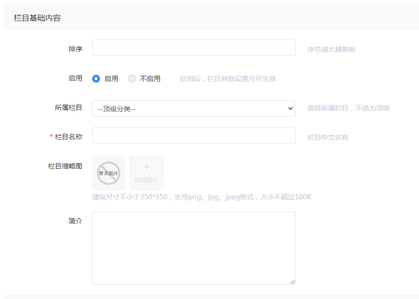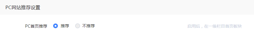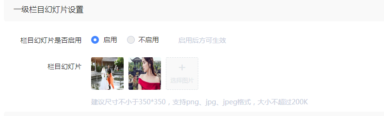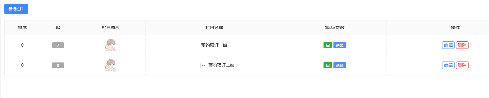 ## **商品栏目** 预约预订商品需设置二级栏目,新增商品时也支持选择二级栏目;  ### **新增栏目**  ### **一级栏目幻灯片设置** 一级栏目幻灯片启用后,幻灯片(即:轮播图)显示在一级栏目列表页顶部;  ### **PC网站推荐设置** PC首页推荐设置"开启",该栏目显示在PC端一级拉努首页版块;