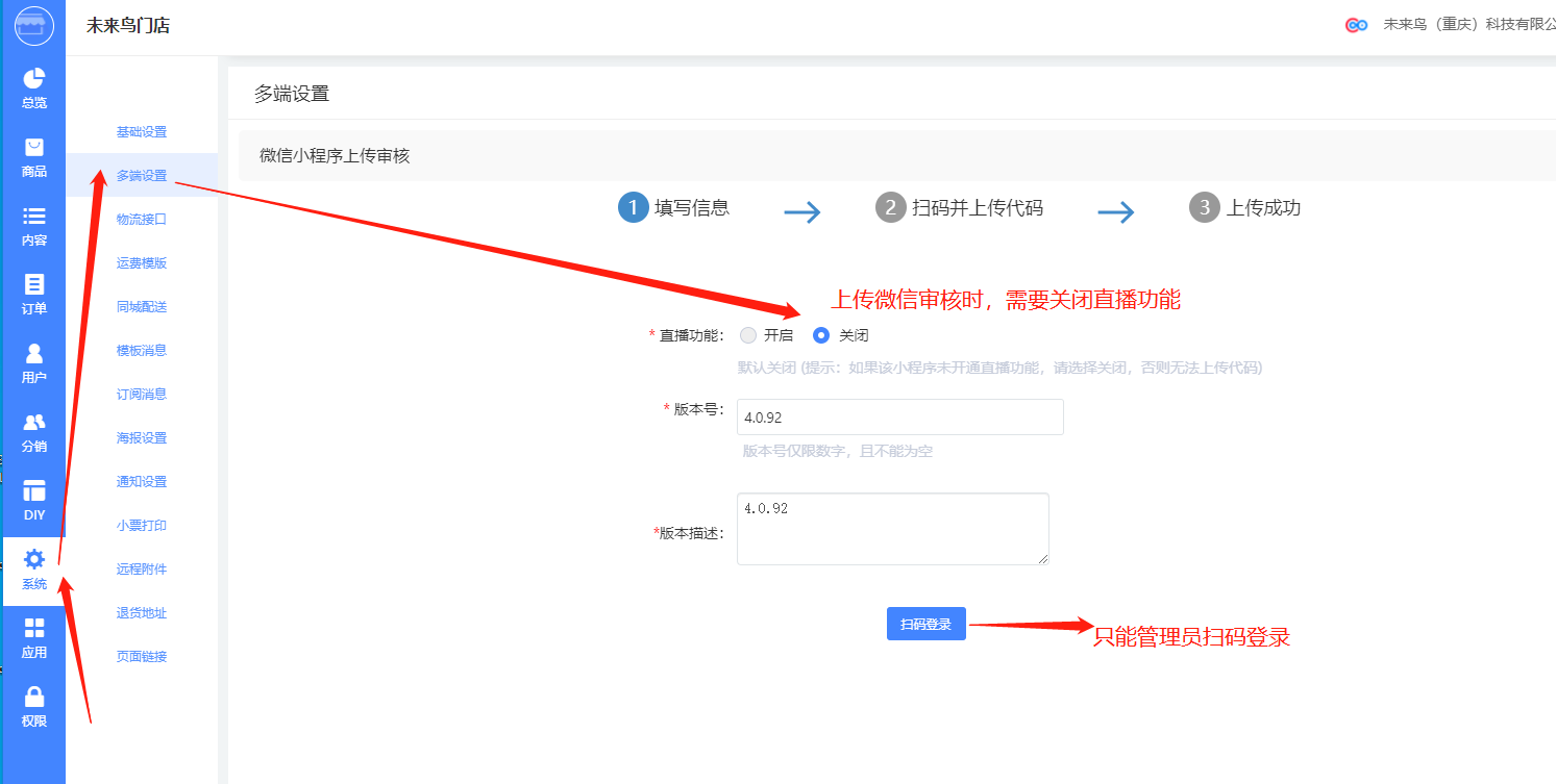### 一.选择模版或进行DIY设计 1.进入小程序管理后台,点击设计,进入页面装修,选一个模板选择启用模板  ## 二.添加商品栏目和商品 1.进入小程序管理后台,商品 商品栏目,添加栏目   2.添加商品,填写商品信息,提交保存即可   ## 三.提交审核并上传发布 1.进入小程序管理后台,点击系统 多端设置 微信小程序点击上传审核   2.微信公众平台登录小程序,进入后,点击管理,版本管理找到我们提交的版本,提交审核  3.待审核通过后,管理员提交全量发布  ## 四.支付收款和退款测试 小程序发布上线后,在商城选择一款商品,购买测试一下能否正常支付和退款,如果不能,需要重新检查微信支付配置