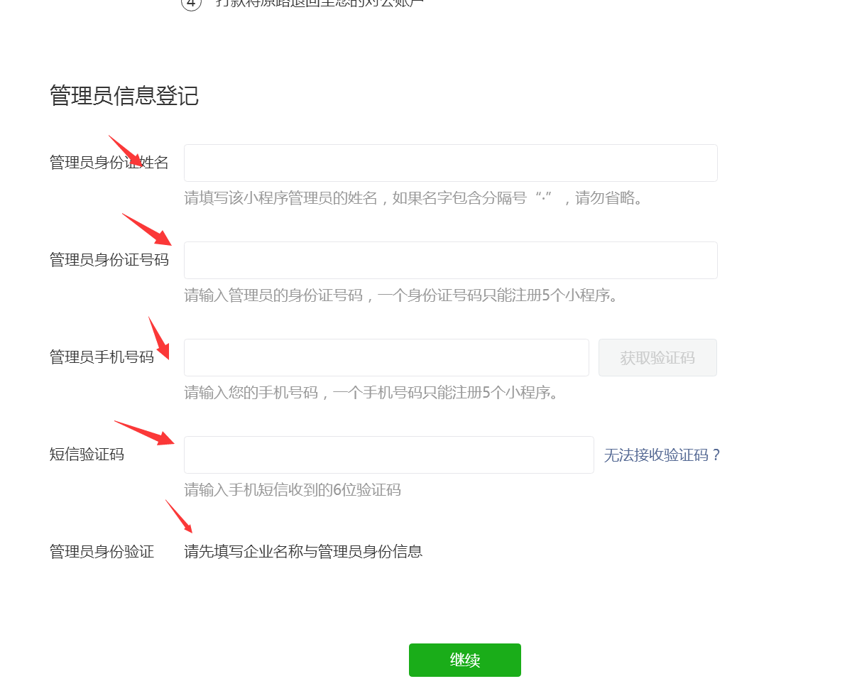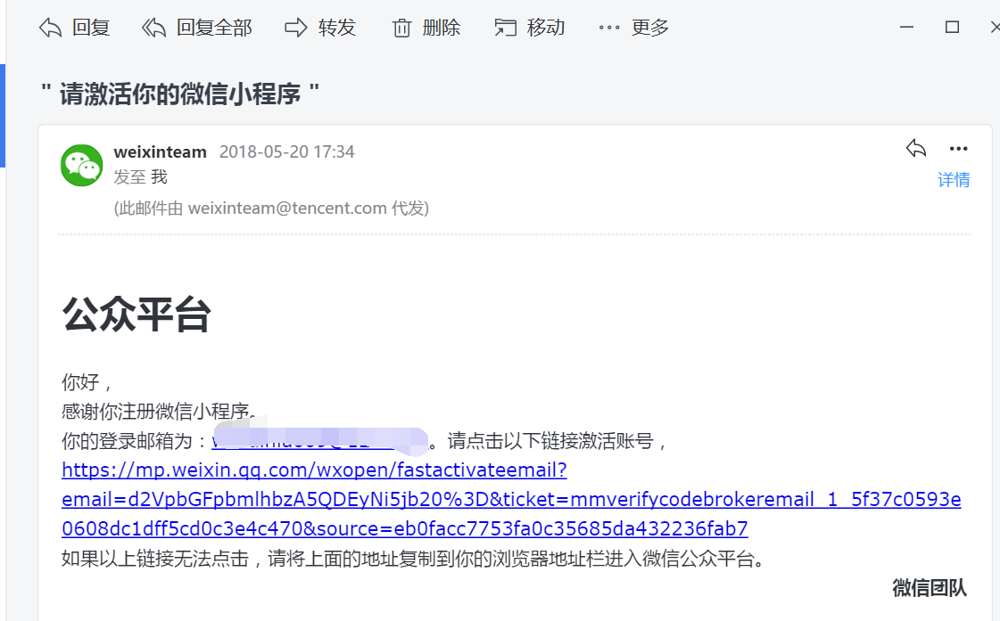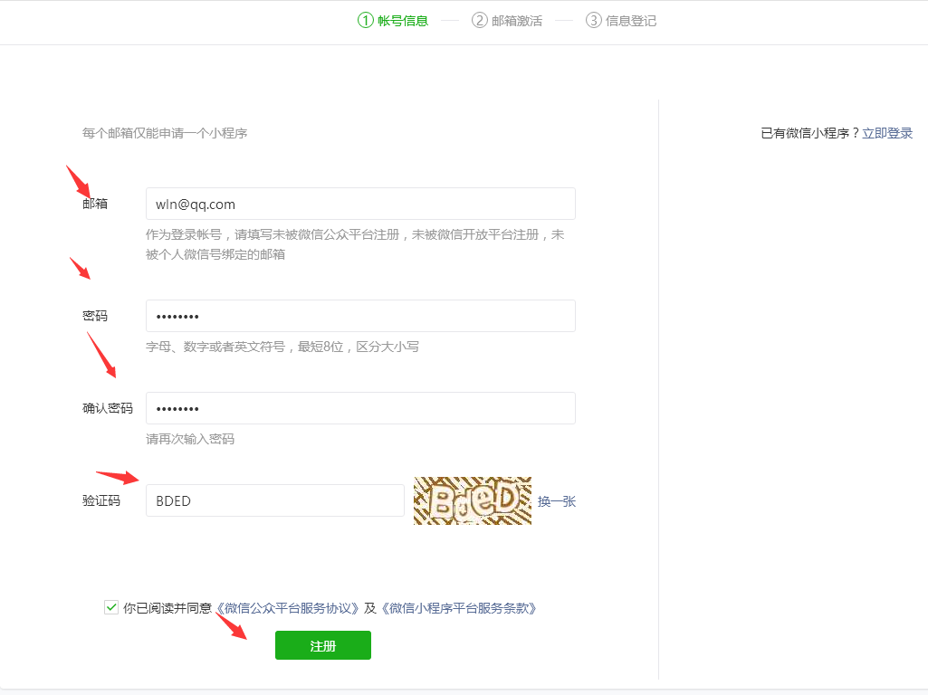 ### 一、传统新申请认证小程序账号 #### 1.申请帐号 进入微信公众平台官方网站 [https://mp.weixin.qq.com](https://mp.weixin.qq.com/ "https://mp.weixin.qq.com") 点击右上角的 立即注册  #### 2.在选择注册账号类型的页面,点击左下方的“小程序”。  #### 3.填写需要注册的邮箱、密码以及验证码后,点击“注册”按钮。注意:需要之前没有在公众号注册过的邮箱,每个邮箱仅能申请一个小程序,填写完成以后会发送一封确认邮件到邮箱。 建议使用网易邮箱注册,不建议使用QQ邮箱,因为QQ邮箱在你的QQ很久没登录的情况下会被注销 当然了,如果你有正常使用的QQ邮箱,且没有绑定微信任意帐号,也是可以用来注册微信开放平台的!  #### 4.登录注册用的邮箱,激活账号。  #### 5:打开你的网易或者QQ邮箱,进入邮件点击那个连接激活小程序帐号,激活完成后即可使用邮箱帐号密码登录小程序  #### 6:接下来填写主题类型、企业名称、营业执照注册号等主体信息。注意:目前主体只限于“个人/企业/政府/媒体/其他组织” 注意:个人注册的没法认证。没有办法添加业务域名,也没有办法开通支付功能,如果只是简单的测试使用,可以选择以个人为主体。 注意:我们的客户请注意,请选择,企业,政府,媒体,或其他组织,不要选择个人,否则小程序将无法使用 请按照您的营业执照来填写具体 注册方式,请选择微信认证,因为你选择了向腾讯公司小额打款验证,完了还是需要交300元的认证费用给腾讯,而且对公帐号转款手续费也不低!  #### 7,接下来填写管理员姓名、身份证号和手机号码等信息。确认无误后,点击“继续”。 注意:管理员信息可以不和营业执照上的法人一样!如果没有特殊情况,请填写法人即可!  #### 8,信息完善后,扫码支付300元认证费微信官方收,微信第三方核实打款验证,核实信息无误认证才会通过