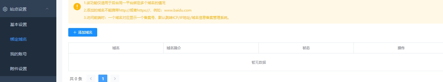 请务必在站点设置-绑定域名-添加当前访问域名 > 1、请务必知晓,绑定的域名末尾不需要"/",也不需要携带http,否则不能正常打开网站 ; > 2、这里的域名根据服务器要求进行腾讯云备案; > 3、域名可以是顶级/二级域名,也可以是站点域名(任何域名均可)