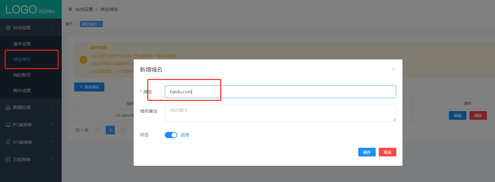 ### 一.系统后台设置(给用户绑定域名也是同样操作教程) > 1.进入域名管理后台-找到解析-添加域名解析 > 2.系统后台-站点设置-绑定域名-添加域名-域名不要携带http或https  ### 二.根据自己域名是否需要开启https,选择性配置 第一种情况不需要开启https的域名绑定流程 > 如果需要开启SSL,请找客服购买和安装并部署SSL,证书和安装服务费用为999元/年