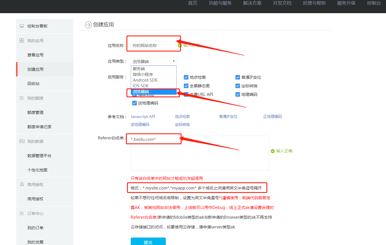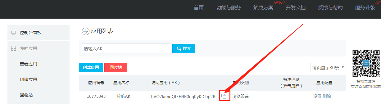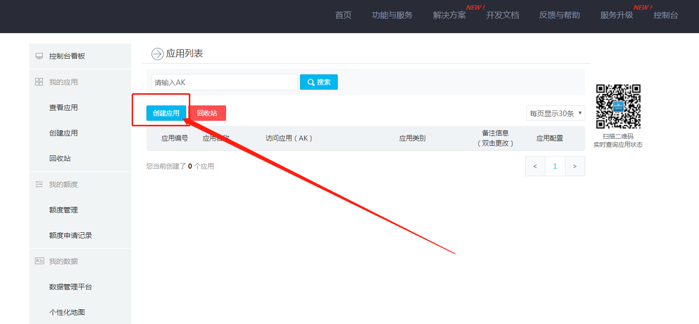 申请地址:http://lbsyun.baidu.com/apiconsole/key 点击直达 1、登录后如图点击创建应用  2、创建应用选择浏览器端 其他参数根据提示填写  3、创建完后,到应用中心复制ak秘钥  4、复制后粘贴到后台(站点设置-基本设置-联系方式-百度AK)