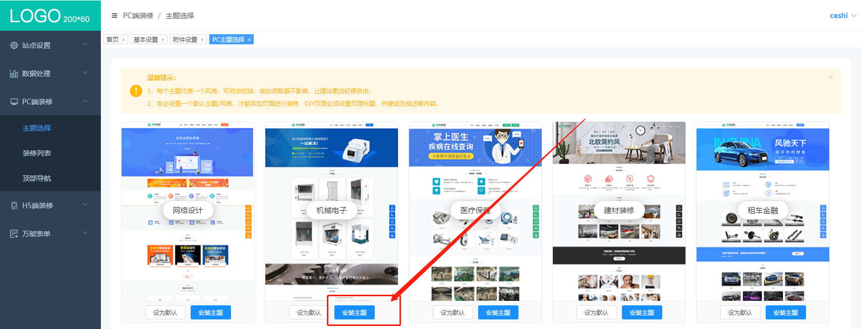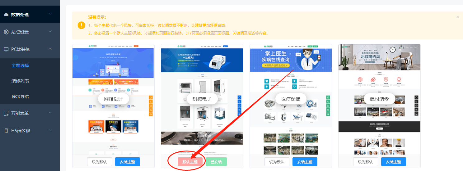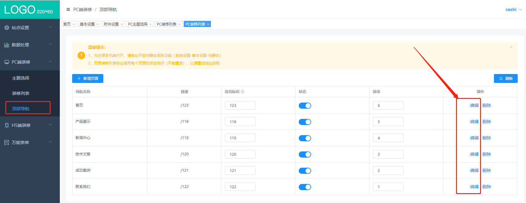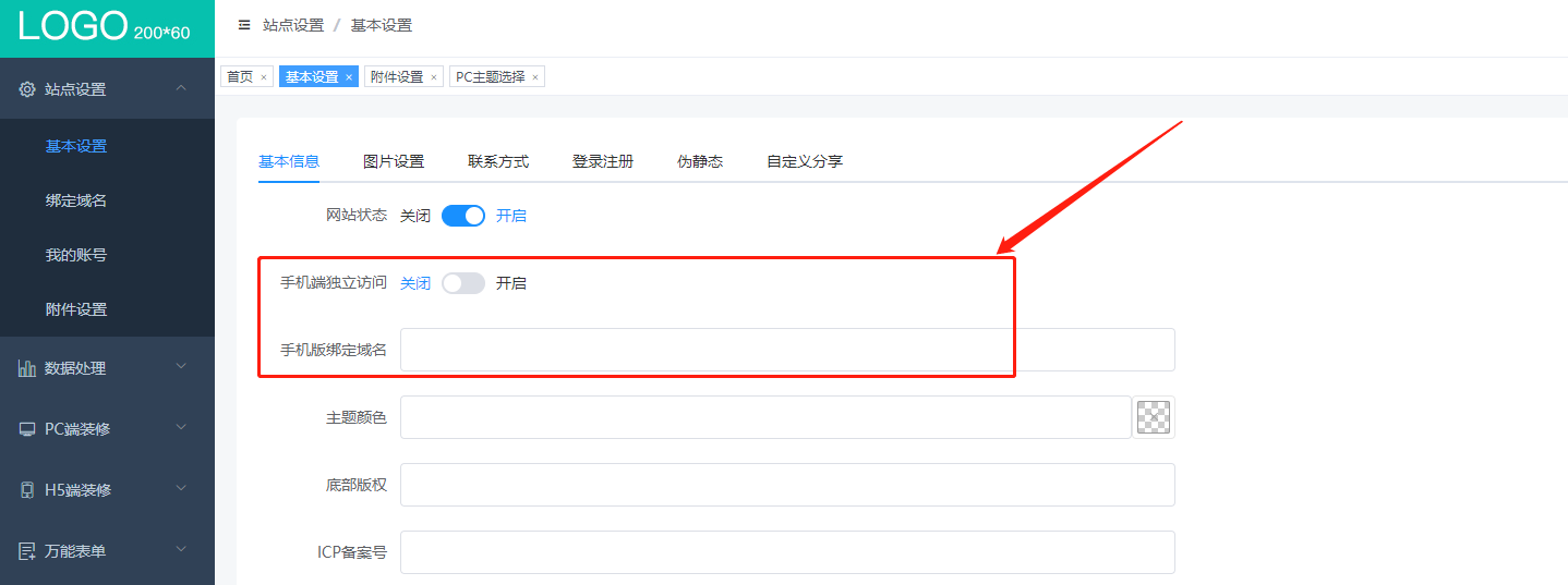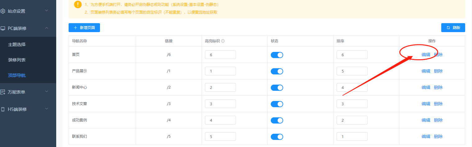 > 通过注册后,即可登录进行站点设置 ### 一、站点基本信息完善 #### 1.基本设置 站点设置-基本设置-基本信息完善 (该手机端独立访问开关默认关闭就行,系统默认PC手机自适应的,假如使用H5插件制作了H5链接,可以直接复制链接填写到该手机版绑定域名处)  #### 2.登录注册 按钮处建议开启登录按钮,方便快速键入后台,也可以直接在域名后台+/admin直接回车进入  ### 二.伪静态设置 > 开启程序内伪静态开关  ### 三.绑定域名 #### 1.域名的绑定 ```css 1、请务必知晓,绑定的域名末尾不需要"/",也不需要携带http,否则不能正常打开网站 ; 2、这里的域名根据服务器要求进行备案,目前我司服务器是腾讯云,请务必使用腾讯云备案; 3、域名可以是顶级/二级域名,也可以是站点域名(任何域名均可) 4,到域名服务商处,把域名解析到我司服务器中 当前服务IP如下 请解析 wwww 和@ A记录到IP 42.192.36.223 ``` https://cms.date163.com/attachment/images/4/2022/07/a9pz5Pu1GtZp255PF9R3b22zI5m23v.png  #### 2.域名接入 > 签订服务合同以后,请联系售前客服进行发布工单进行域名的接入 ==每个客户可以接入1个域名(www和@为视为一个域名),每增加一个域名,每次增收100元技术服务费== ### 四、附件设置 进入站点设置-附件设置-选择合适自己的存储类型-配置对应参数-提交即可 > (建议使用七牛云储存,每个月的免费额度够用)  五、找到PC端装修-选择一个主题安装-设为默认-自定义地址标识-修改导航链接 1.进入PC端装修主题列表  2.选择主题并安装数据(这里选第二套主题,点击安装主题)  3.安装后,设置为默认主题即可  4.设置默认主题后,进入装修列表,填写网页标识(填写的自定义地址标识支持字母,数字+下划线,且每个账号下不能重复出现相同标识),点击保存,其它页面依照此方法自定义一下标识即可  5.装修列表里面务必设置一个默认首页,否则前端输入域名打开会提示未找到页面  6、修改导航默认地址(启用伪静态后的地址)-进入顶部导航页面-编辑菜单  7、修改顶部导航跳转地址(直接点击选择默认地址即可,这里也可以填写完整的外部链接,需携带http://),其他导航菜单参照填写即可  操作完以上步骤后,即可通过访问域名正常访问网站了!