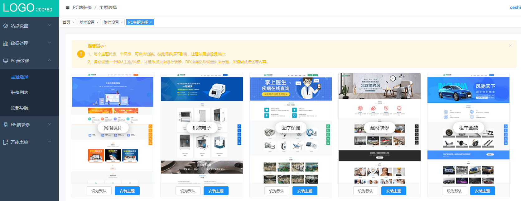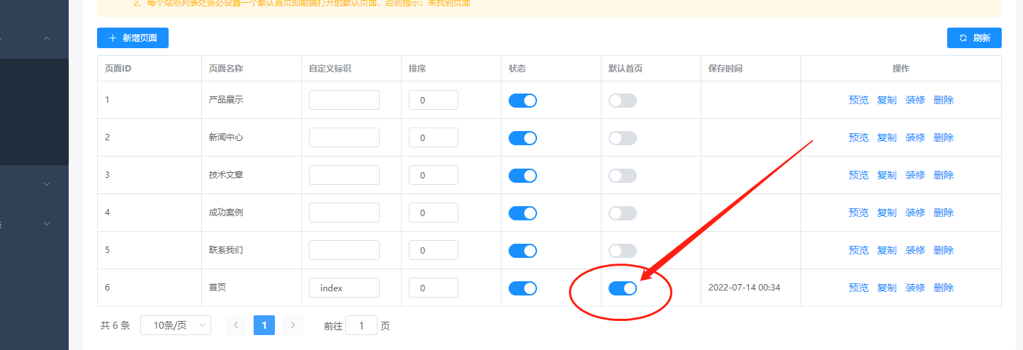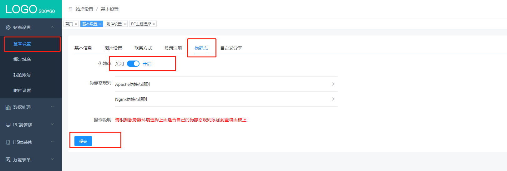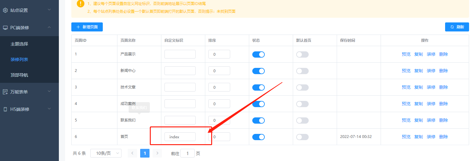 > 通过注册后,即可登录进行站点设置 ### 一、站点基本信息完善 #### 1.基本设置 站点设置-基本设置-基本信息完善 (该手机端独立访问开关默认关闭就行,系统默认PC手机自适应的,假如使用H5插件制作了H5链接,可以直接复制链接填写到该手机版绑定域名处)  #### 2.登录注册 按钮处建议开启登录按钮,方便快速键入后台,也可以直接在域名后台+/admin直接回车进入  ### 二.伪静态设置 > 开启程序内伪静态开关  ### 三.绑定域名 #### 1.域名的绑定 ```css 1、请务必知晓,绑定的域名末尾不需要"/",也不需要携带http,否则不能正常打开网站 ; 2、这里的域名根据服务器要求进行备案,目前我司服务器是腾讯云,请务必使用腾讯云备案; 3、域名可以是顶级/二级域名,也可以是站点域名(任何域名均可) 4,到域名服务商处,把域名解析到我司服务器中 当前服务IP如下 请解析 wwww 和@ A记录到IP 42.192.36.223 ``` https://cms.date163.com/attachment/images/4/2022/07/a9pz5Pu1GtZp255PF9R3b22zI5m23v.png  #### 2.域名接入 > 签订服务合同以后,请联系售前客服进行发布工单进行域名的接入 ==每个客户可以接入1个域名(www和@为视为一个域名),每增加一个域名,每次增收100元技术服务费== ### 四、附件设置 进入站点设置-附件设置-选择合适自己的存储类型-配置对应参数-提交即可 > (建议使用七牛云储存,每个月的免费额度够用)  五、找到PC端装修-选择一个主题安装-设为默认-自定义地址标识-修改导航链接 1.进入PC端装修主题列表  2.选择主题并安装数据(这里选第二套主题,点击安装主题)  3.安装后,设置为默认主题即可  4.设置默认主题后,进入装修列表,填写网页标识(填写的自定义地址标识支持字母,数字+下划线,且每个账号下不能重复出现相同标识),点击保存,其它页面依照此方法自定义一下标识即可  5.装修列表里面务必设置一个默认首页,否则前端输入域名打开会提示未找到页面  6、修改导航默认地址(启用伪静态后的地址)-进入顶部导航页面-编辑菜单  7、修改顶部导航跳转地址(直接点击选择默认地址即可,这里也可以填写完整的外部链接,需携带http://),其他导航菜单参照填写即可  操作完以上步骤后,即可通过访问域名正常访问网站了!