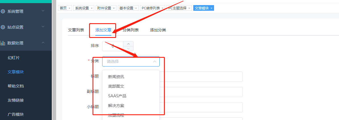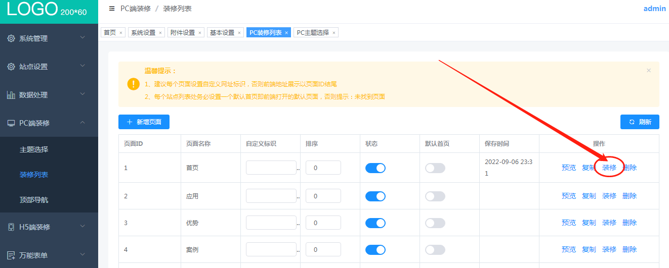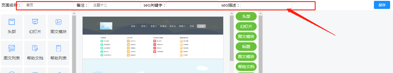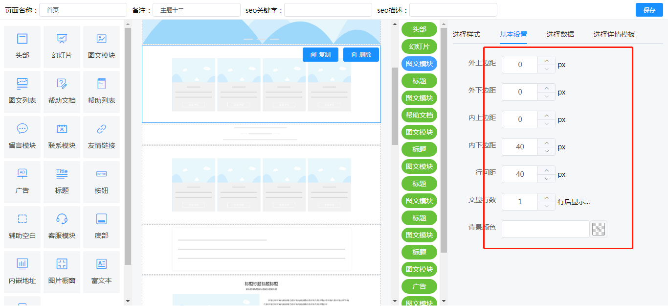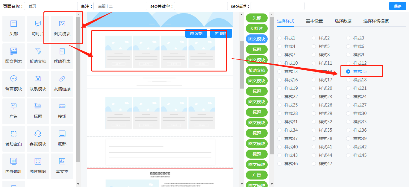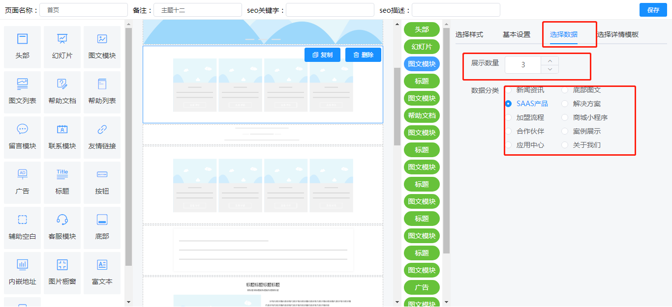 进入装修列表-添加页面-添加组件-设置基本属性-选择样式-选择数据(数据处理列表添加)-提交保存即可完成一个页面制作(下面以图文组件内容为例演示) **1.新建页面** (此处我们直接使用已有的页面)-进入装修页面  **2.填写页面相关信息**  **3.添加一个图文组件-选择组件样式**  **4.基本设置可以不用设置,也可根据自己实际需求就行调整(默认是已经设置好了的)**  5.选择数据(展示数量:前端这个样式下总显示个数;数据分类:后台数据处理处对应图文组件增加的分类)-选择数据分类后,数据就在对应分类下增加既可**  a、这里的展示数据为3,则前端显示三个图文信息  b、数据分类:后台数据处理处对应图文组件增加的分类  c、选择数据分类后,数据就在对应分类下增加既可  其他类型的组件,数据添加方式跟这个一样! ==温馨提示: *标题类的组件内容,直接在DIY装修页面添加即可==