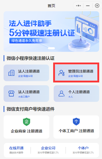 ### 法人进件助手极速申请认证 #### 1.进入法人进件助手 .识别图中二维码或微信搜索 法人进件助手 进入微信小程序。  #### 2.进入管理员注册通道  #### 3.填写企业和法人信息 进入小程序后,点击==管理员通道==进入填写信息,提交订单,并支付费用。  #### 4.支付费用  `法人进件助手战略合作伙伴请使用预存的卡密激活码进行支付` `其他合作伙伴和用户请选择微信支付 #### 5.我的订单 支付完成后自动跳到我的订单中心请点击”查询详情“按钮  #### 6.管理员扫码  需要保存到相册用摄像头扫码(也可以发到电脑版微信扫码或直接电脑上打开法人进件助手小程序) #### 7.创建试用小程序 微信摄像头扫码后请按提示点击确定   #### 8.快速认证 然后返回”法人进件助手“小程序,订单中心-订单详情点击下快速认证  点击转正申请  确定后由微信公众号”微信公众平台“下发模板消息,  点击模板消息  根据微信公众平台提示进行法人人脸识别认证  验证通过后,微信公众平台 会给您下发一条确认的模板消息,请点击详情确认  点击确定即可  确定以后即可完成小程序企业认证  9.绑定邮箱 进入小程序”小程序助手“微信搜索”小程序助手“即可进入  点击您刚才认证的小程序  点击名称后面的 >  设置登录邮箱  注意一定要填写一个没有被微信绑定过的邮箱,然后点击保持  保存后去您的邮箱中点击验证链接  点击链接后即可修改邮箱成功  #### 10.修改头像和介绍 由管理员通道快速认证的小程序需要先修改头像 打开https://mp.weixin.qq.com/ 用微信或刚才设置的邮箱账号密码登录 点击小程序信息,前往填写  上传小程序头像  上传头像和小程序介绍后点击提交  #### 11.设置小程序类目  管理员扫码添加类目 #### 12.修改小程序名称 设置完头像小程序介绍以及类目后即可修改小程序头像  按需修改