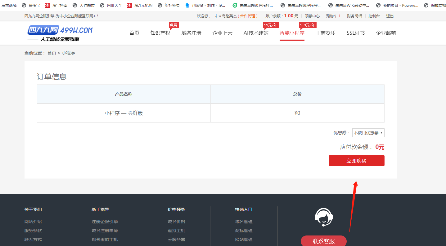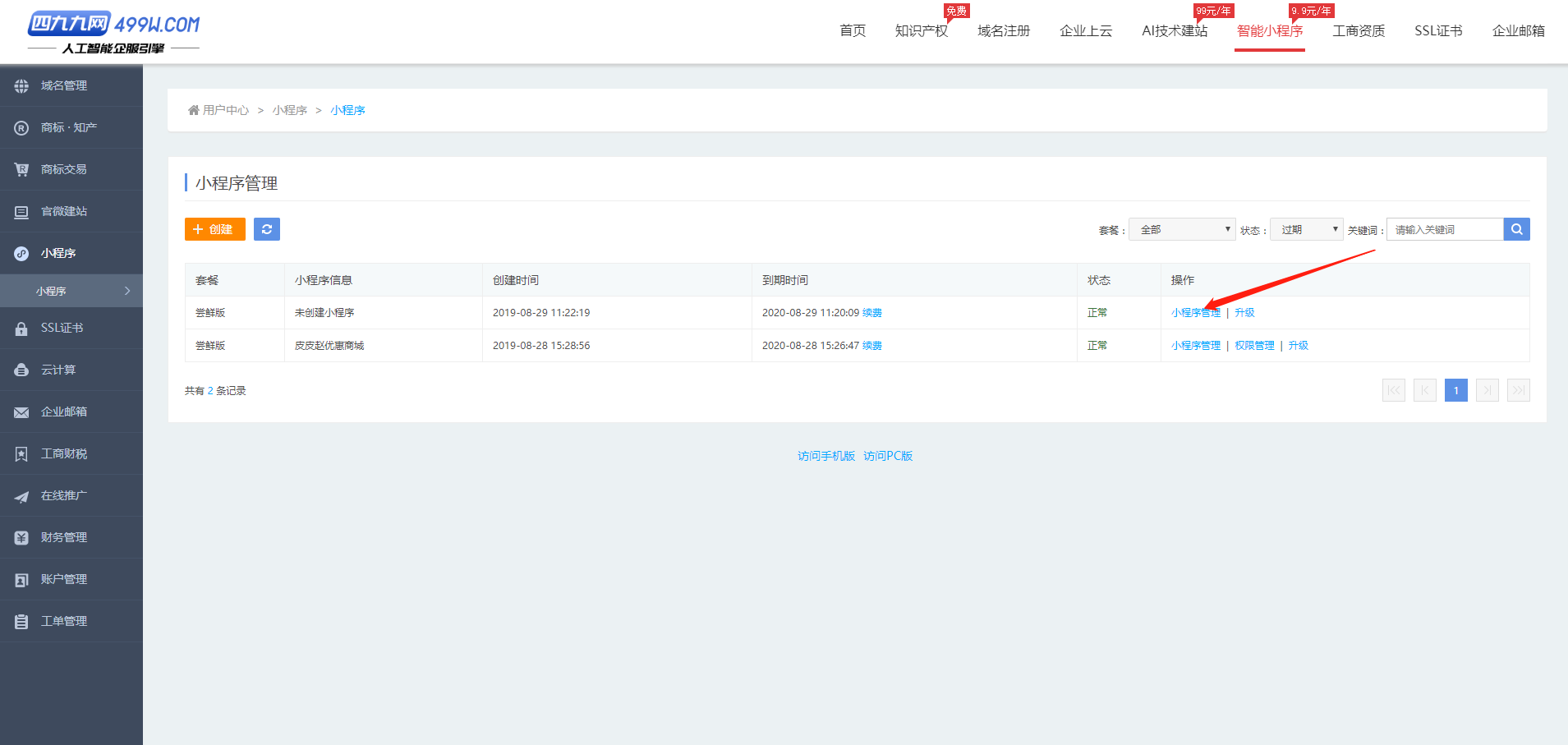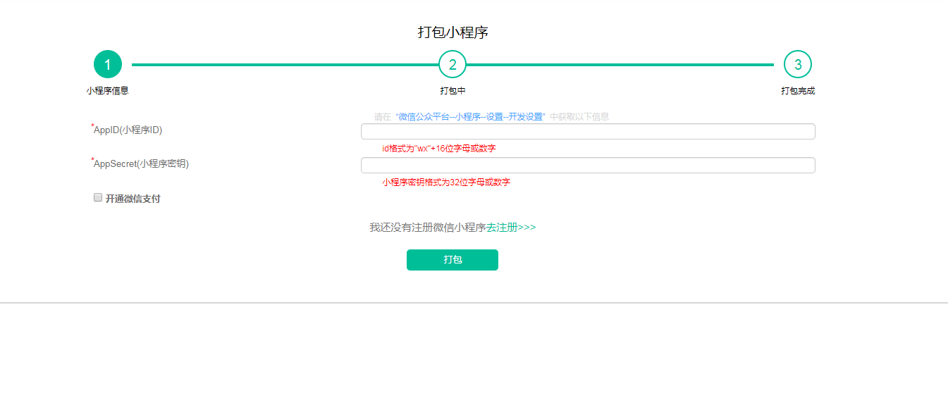 # 一、进入499网https://499w.com/,注册、登陆  ### 注册  ### 登陆  # 二、申请小程序  ### 1、选择你要申请的小程序点击立即购买  然后付款  进入小程序管理  创建小程序  选择你想要创建的小程序类型相近的模板  填写信息  创建成功,进入小程序  这里可以进行类容填充小程序设置  设置完成后点击生成小程序   输入在微信公众平台注册的小程序的APPID和APPsecret然后打包  具体步骤点击链接https://wiki.8ad.top/docs/xcxgk/499wxcxfb 打包完成后就下载前端包到微信开发者工具里面导入项目 # 二、用开发者工具导入项目 1、下载安装开发者工具: https://pan.baidu.com/s/1Dq8u43Ji_XJoLrhH9Q9P0w 根据你电脑的系统版本下载: 2、安装完成后打开开发者工具  3、这里注意是导入项目,不是新建项目   4、项目名称自己填,目录就选择之前下载的压缩包解压后的文件夹  appid与前面的appid一致 5、上传版本  6、上传完成后到微信公众平台提交审核,审核通过后,然后上线就可以了