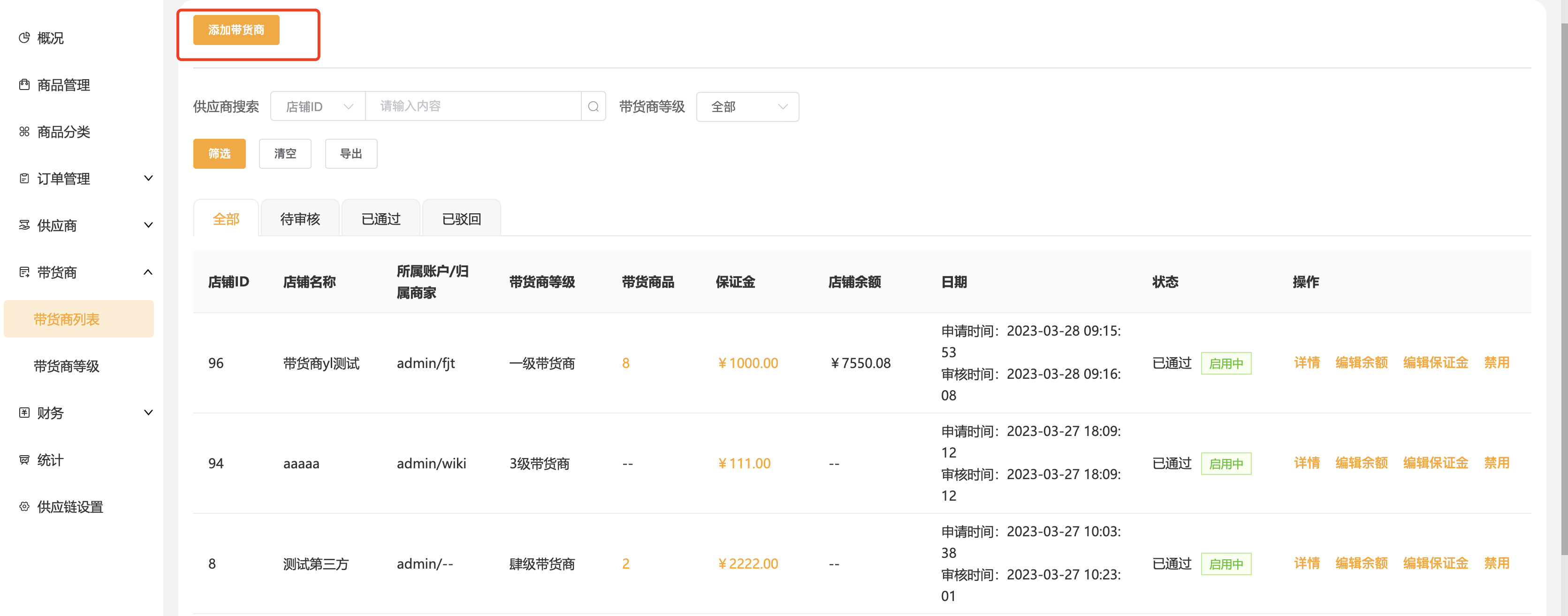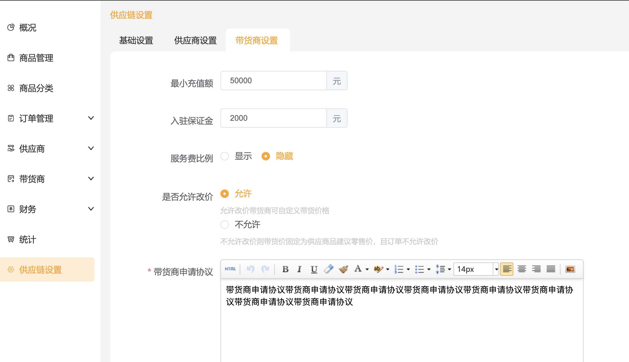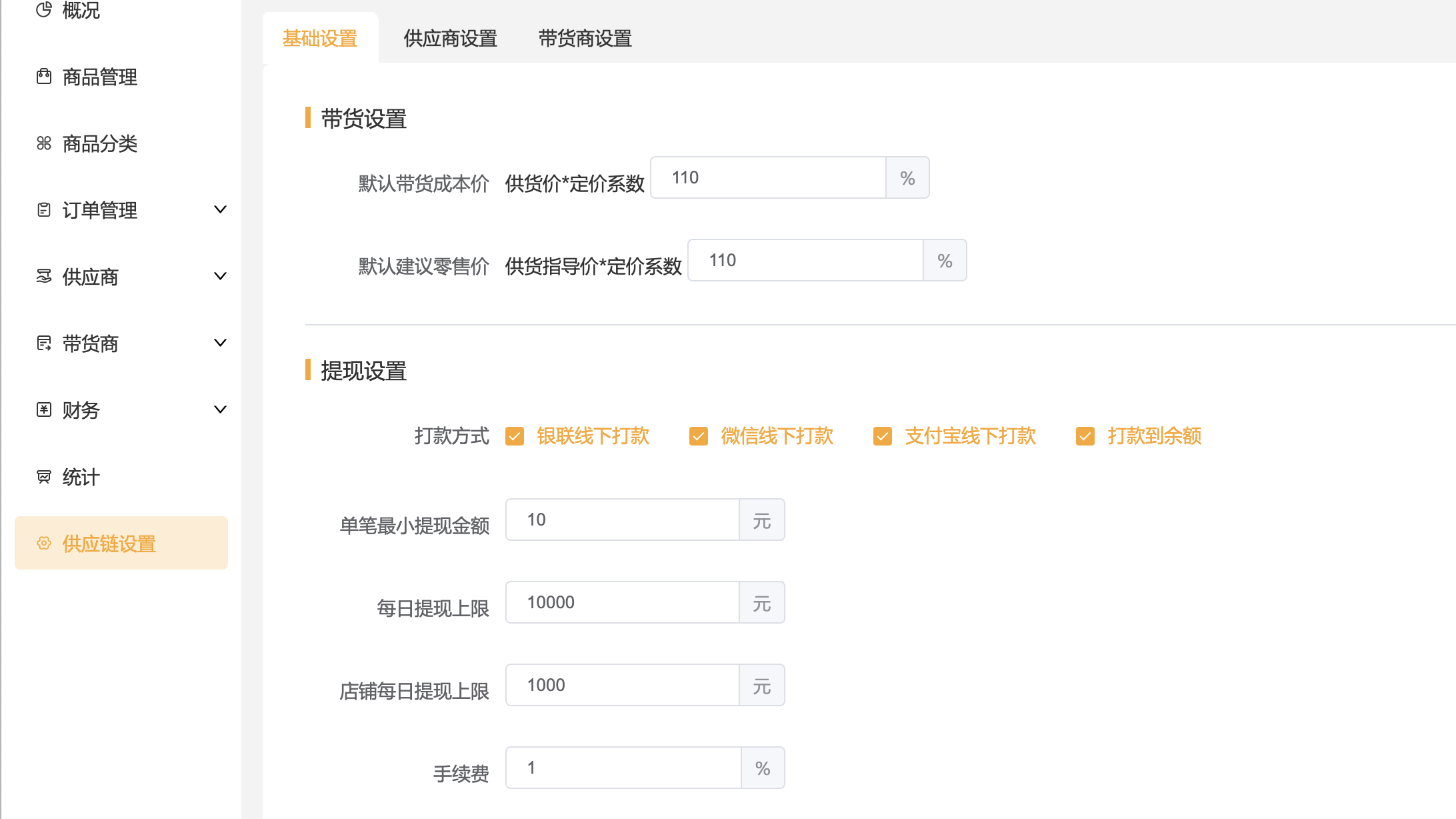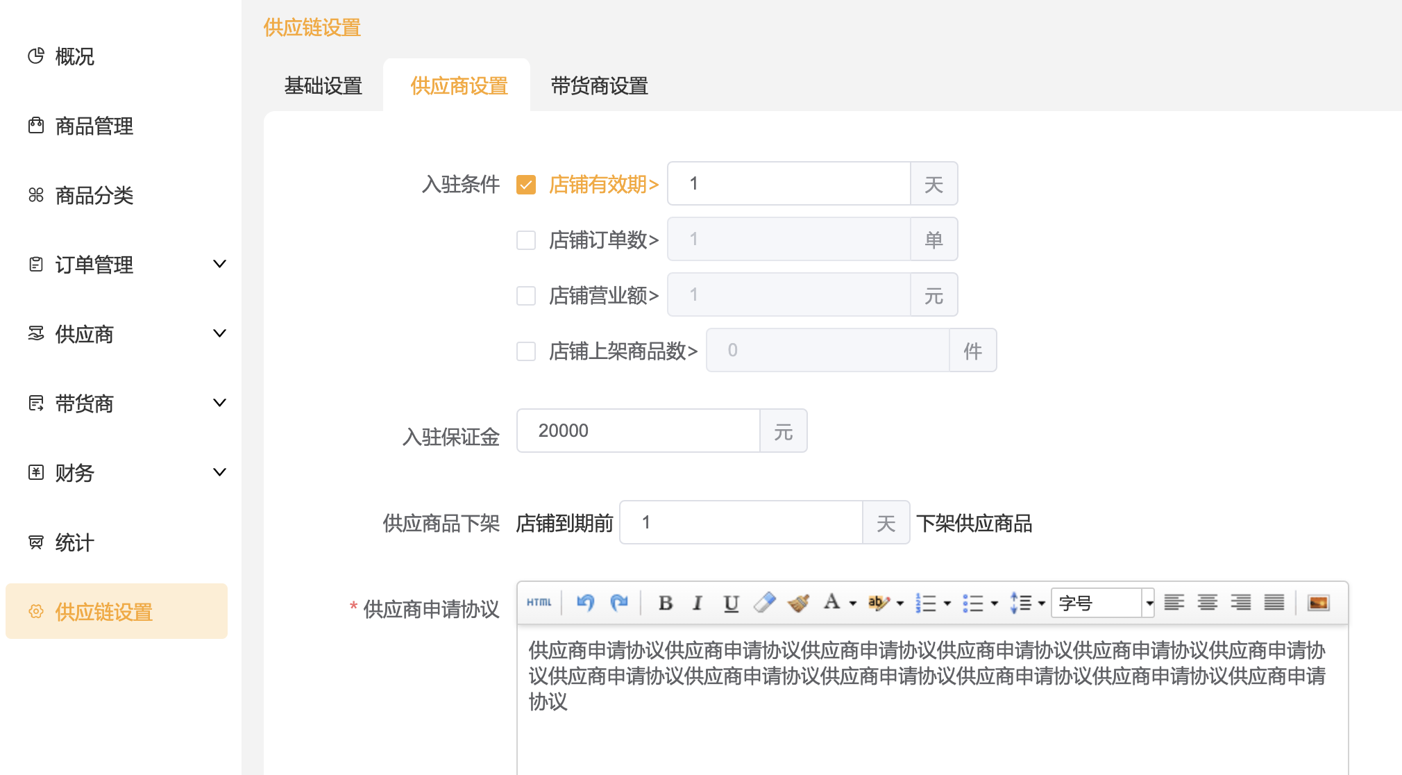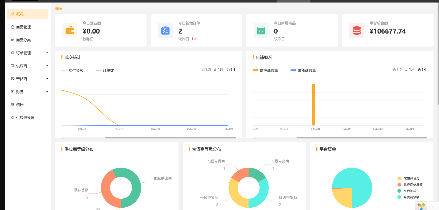 ### 供应链简介 供货商提供商品,平台作为审核,信息中转可从中抽成将商品信息传达给带货商,平台可设置商品的带货价格,从中赚取差额,带货商利用自身渠道售卖商品,订单由平台再次订单抽成后转达给供应商,订单由供应商来处理。 ### 供应链价值 1)对于供货商:增加了店铺商品的销售渠道,节省了商品推广费用。 2)对于带货商:带货商利用本身售卖渠道资源售卖商品,且无需线下仓库,即丰富了商城商品品类有增加了可靠货源,同时实现了渠道变现。 3)对于平台:平台可从供应商/带货商商品、订单中抽成,增加收入。 ### 链路说明 ***(当前仅支持私有化部署的ABEESHOP超级商城)***  ### 操作指南 1、进入平台工具中,购买供应链插件,点击供应链进入  2、概况中展示供应链中所有带货商、供应商的基本数据情况  3、商品管理中平台可查看并审核供应商申请供应的商品,同时也可编辑商品的分类、带货成本价格与建议零售价。带货成本价作为带货商售卖商品的商品成本用于支付;建议零售价为终端销售的价格(允许改价的带货商可修改售卖价格)  4、供应商申请供应商品时需选择平台的商品分类,带货商从不同商品分类中选择商品带货销售,建议平台尽可能的完善商品分类以供不同类型供应商申请供应商品 **分类说明:**分类下子分类与商品不可同时存在,举个例子:生鲜大类下增加了水产的子分类,那么生鲜下不可添加商品,仅可添加在水产下,或是再增加不同的子分类在生鲜下。  5、订单管理中展示订单列表与售后订单。 1)订单列表中展示所有的带货订单,可查看订单当前状态,待抵扣为带货商余额不足,当前余额不足以支付用户购买商品的成本价时的状态,此时订单将不会同步给供应商,以避免供应商不必要的损失 2)售后订单中展示所有带货商同步售后的订单,并同步售后信息提交给供应商后,供应商的售后状态  6、供应商 1)供应商列表展示所有供应商,供应商入驻方式有两种:第一种是供应商在自己商城插件中进入供应商插件申请入驻通过后缴纳保证金,平台在此处审核申请入驻的供应商;第二种是平台直接选择店铺将店铺添加为供应商。   2)供应商分类是为供应商设置的商家分类,不同分类可设置单独的服务费比例,举个例子,生鲜类商家本身利润少可设置低一些的服务费比例,服装类商家利润高,可设置高一些的服务费比例  、 3)供应商可设置不同等级,不同等级可设置不同的服务费比例与可供货数量  7、带货商 1)带货商列表展示所有带货商,带货商入驻方式同供应商,可在自己商城的带货商插件中申请,平台在此处审核申请入驻的带货商,或是由平台添加店铺为带货商  2)带货商可设置不同等级,不同等级可设置不同的服务费比例与可带货数量  8、财务中展示带货商的充值余额明细、供应商的供货结算明细、平台的服务费收入明细以及供应商提现结算金额的记录      9、统计中展示商品数据统计、供应商数据统计与带货商数据统计    10、设置中包含价格设置、提现设置、供应商入驻设置与带货商入驻设置 1)价格说明: 供货价:供应商供应的商品的货源价格,用于平台与供应商结算货款使用 供货指导价:供应商根据商品价值,提供给平台参考用的建议售卖价格 带货成本价:带货商售卖商品的商品成本,用于用户下单后带货商的充值余额抵扣商品货款使用; 建议零售价:平台建议带货商的终端销售的价格 带货价:带货商的终端销售价格,带货商不允许改价时,带货价=平台设置建议零售价  2)供应商入驻可设置入驻条件,店铺需满足条件后方可申请入驻  3)带货商可设置最小充值额与保证金