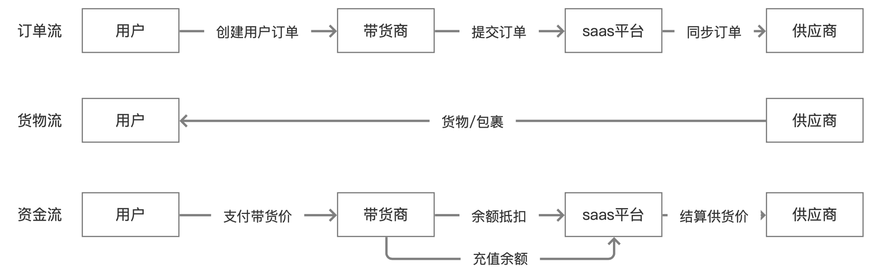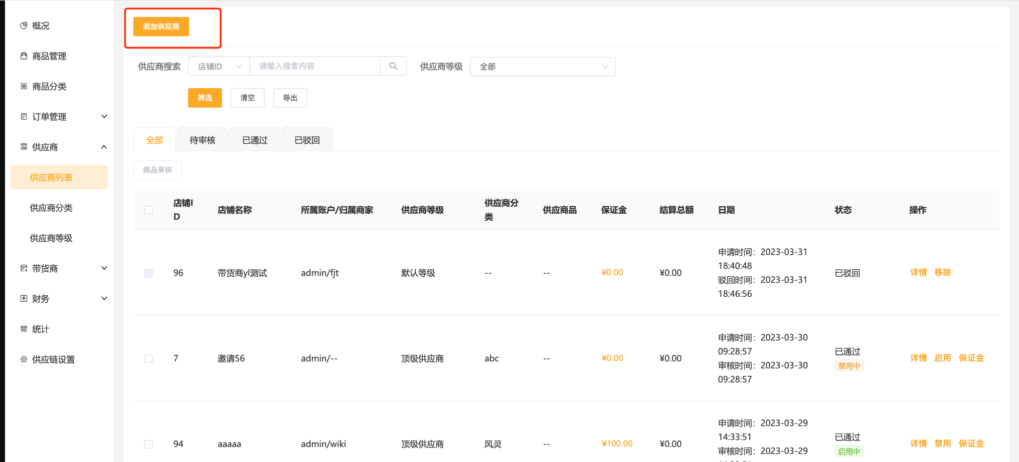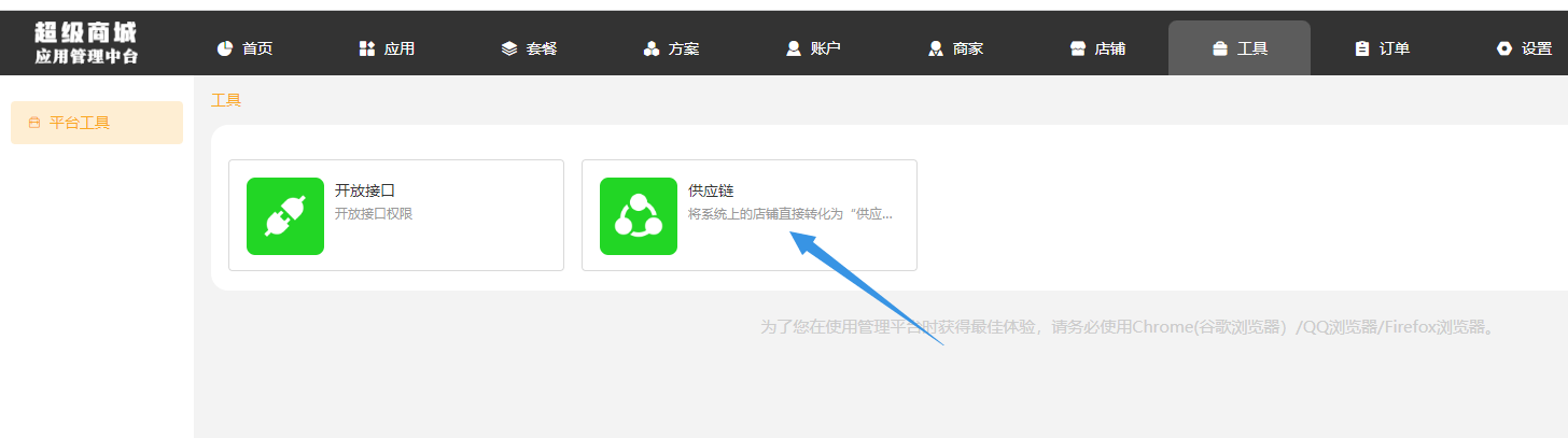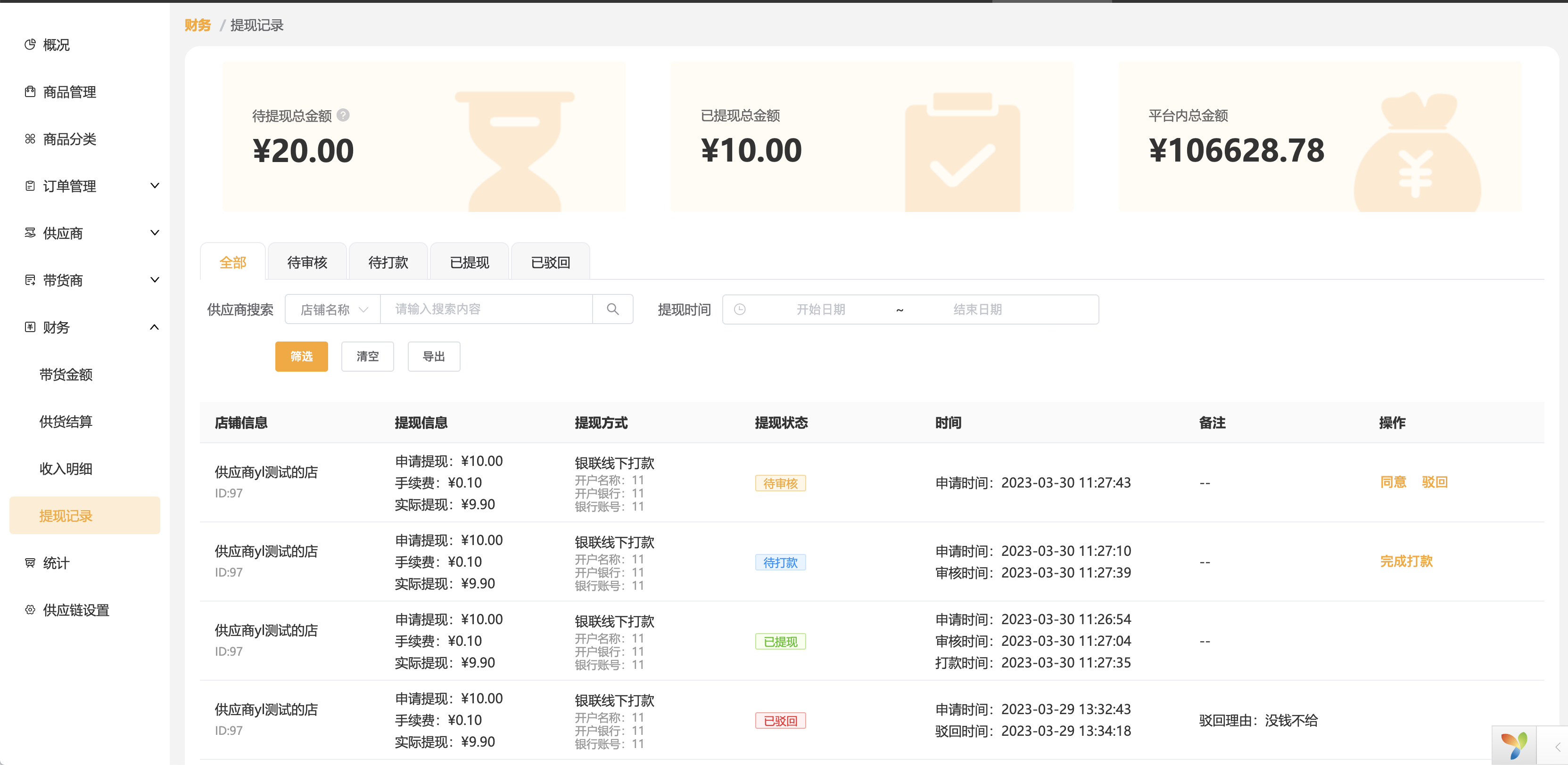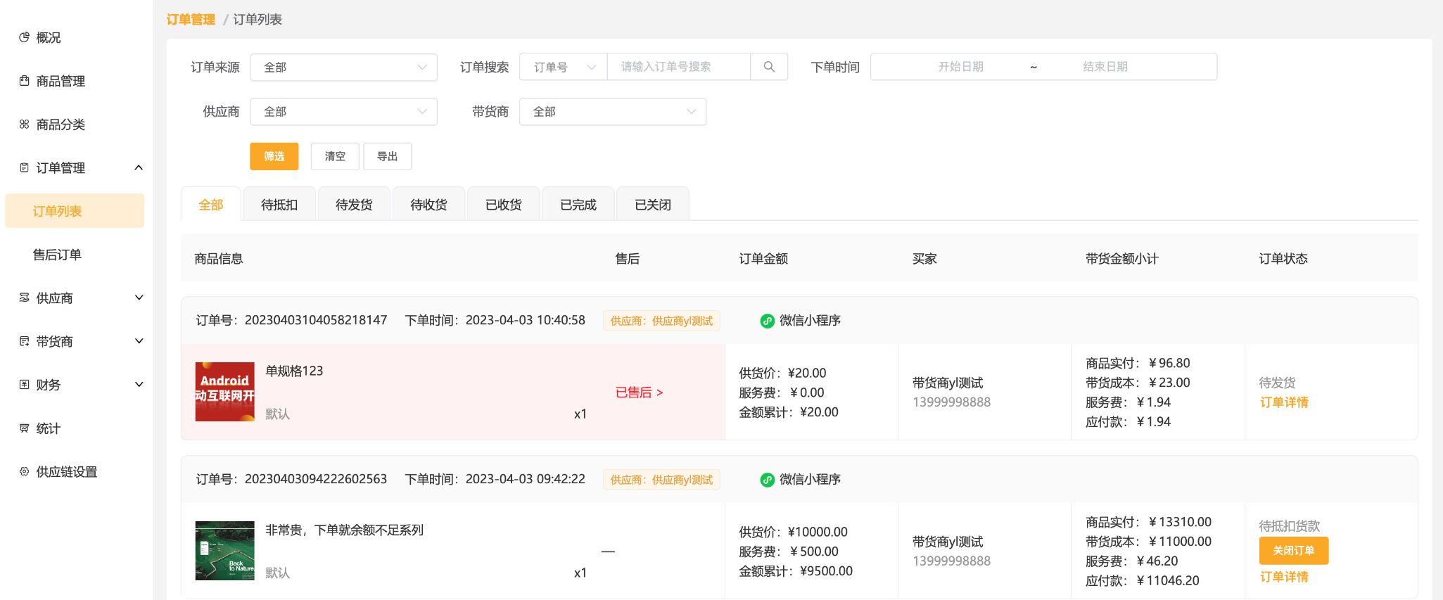 ### 供应链简介 供货商提供商品,平台作为审核,信息中转可从中抽成将商品信息传达给带货商,平台可设置商品的带货价格,从中赚取差额,带货商利用自身渠道售卖商品,订单由平台再次订单抽成后转达给供应商,订单由供应商来处理。 ### 供应链价值 1)对于供货商:增加了店铺商品的销售渠道,节省了商品推广费用。 2)对于带货商:带货商利用本身售卖渠道资源售卖商品,且无需线下仓库,即丰富了商城商品品类有增加了可靠货源,同时实现了渠道变现。 3)对于平台:平台可从供应商/带货商商品、订单中抽成,增加收入。 ### 链路说明 ***(当前仅支持私有化部署的ABEESHOP超级商城)***  ### 操作指南 1、进入平台工具中,购买供应链插件,点击供应链进入  2、概况中展示供应链中所有带货商、供应商的基本数据情况  3、商品管理中平台可查看并审核供应商申请供应的商品,同时也可编辑商品的分类、带货成本价格与建议零售价。带货成本价作为带货商售卖商品的商品成本用于支付;建议零售价为终端销售的价格(允许改价的带货商可修改售卖价格)  4、供应商申请供应商品时需选择平台的商品分类,带货商从不同商品分类中选择商品带货销售,建议平台尽可能的完善商品分类以供不同类型供应商申请供应商品 **分类说明:**分类下子分类与商品不可同时存在,举个例子:生鲜大类下增加了水产的子分类,那么生鲜下不可添加商品,仅可添加在水产下,或是再增加不同的子分类在生鲜下。  5、订单管理中展示订单列表与售后订单。 1)订单列表中展示所有的带货订单,可查看订单当前状态,待抵扣为带货商余额不足,当前余额不足以支付用户购买商品的成本价时的状态,此时订单将不会同步给供应商,以避免供应商不必要的损失 2)售后订单中展示所有带货商同步售后的订单,并同步售后信息提交给供应商后,供应商的售后状态  6、供应商 1)供应商列表展示所有供应商,供应商入驻方式有两种:第一种是供应商在自己商城插件中进入供应商插件申请入驻通过后缴纳保证金,平台在此处审核申请入驻的供应商;第二种是平台直接选择店铺将店铺添加为供应商。   2)供应商分类是为供应商设置的商家分类,不同分类可设置单独的服务费比例,举个例子,生鲜类商家本身利润少可设置低一些的服务费比例,服装类商家利润高,可设置高一些的服务费比例  、 3)供应商可设置不同等级,不同等级可设置不同的服务费比例与可供货数量  7、带货商 1)带货商列表展示所有带货商,带货商入驻方式同供应商,可在自己商城的带货商插件中申请,平台在此处审核申请入驻的带货商,或是由平台添加店铺为带货商  2)带货商可设置不同等级,不同等级可设置不同的服务费比例与可带货数量  8、财务中展示带货商的充值余额明细、供应商的供货结算明细、平台的服务费收入明细以及供应商提现结算金额的记录      9、统计中展示商品数据统计、供应商数据统计与带货商数据统计    10、设置中包含价格设置、提现设置、供应商入驻设置与带货商入驻设置 1)价格说明: 供货价:供应商供应的商品的货源价格,用于平台与供应商结算货款使用 供货指导价:供应商根据商品价值,提供给平台参考用的建议售卖价格 带货成本价:带货商售卖商品的商品成本,用于用户下单后带货商的充值余额抵扣商品货款使用; 建议零售价:平台建议带货商的终端销售的价格 带货价:带货商的终端销售价格,带货商不允许改价时,带货价=平台设置建议零售价  2)供应商入驻可设置入驻条件,店铺需满足条件后方可申请入驻  3)带货商可设置最小充值额与保证金