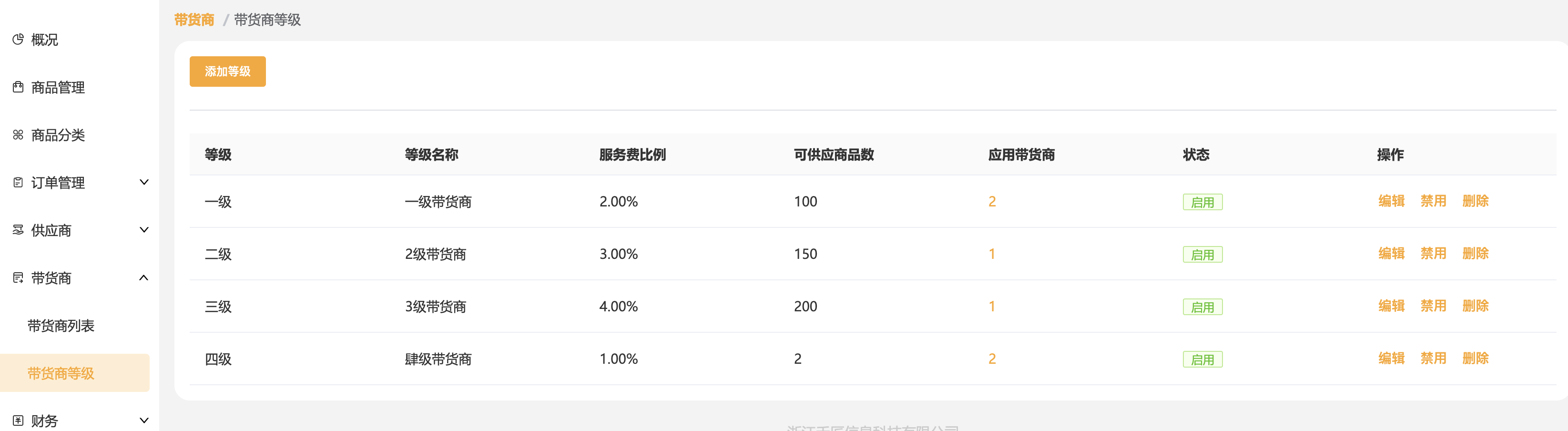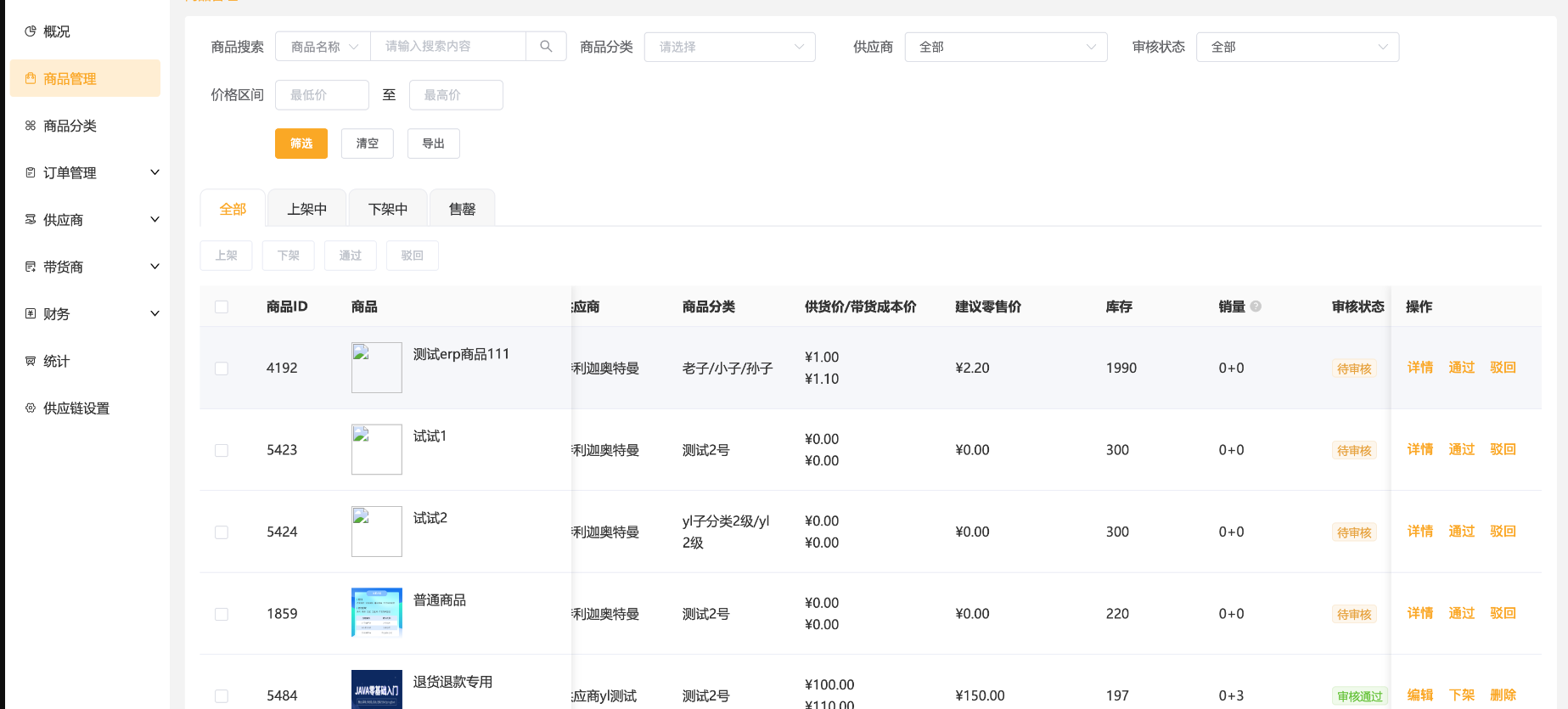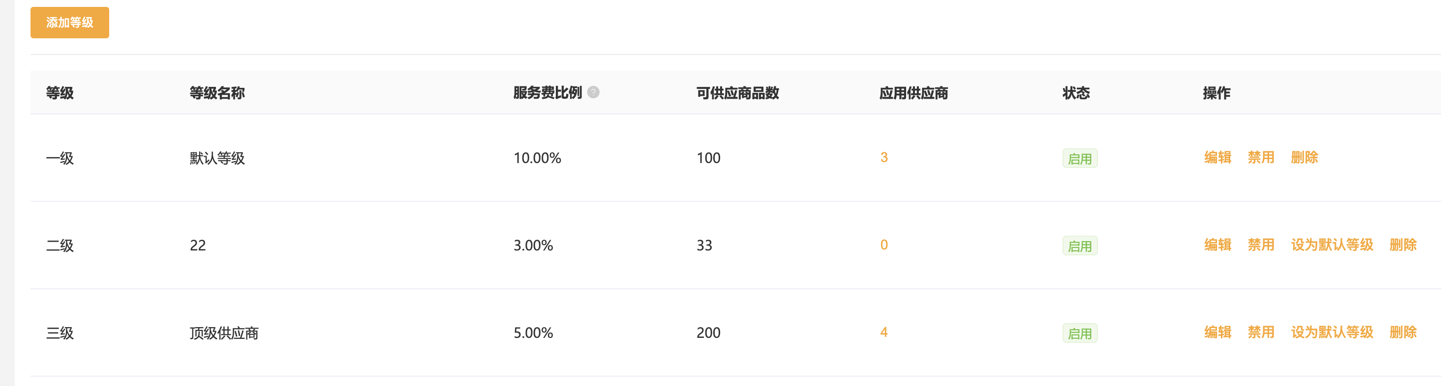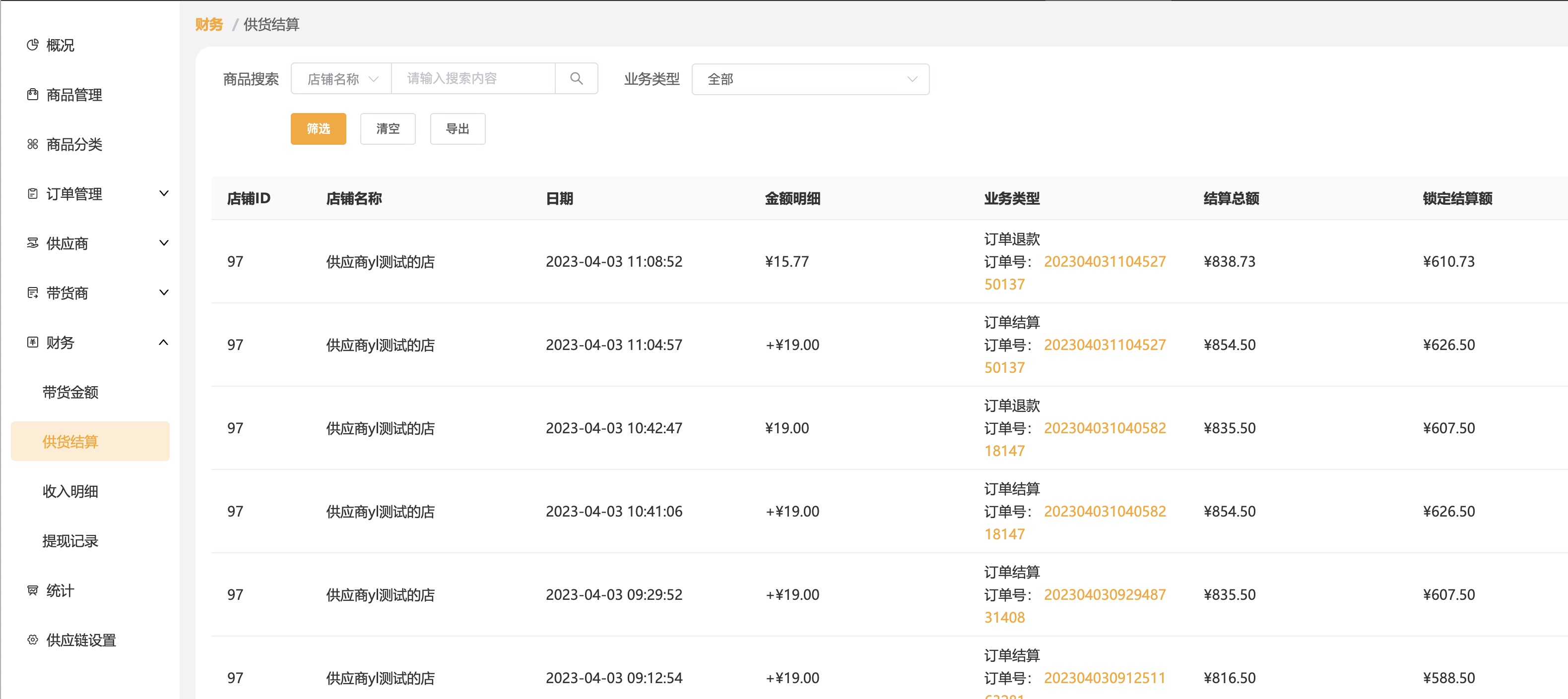 ### 供应链简介 供货商提供商品,平台作为审核,信息中转可从中抽成将商品信息传达给带货商,平台可设置商品的带货价格,从中赚取差额,带货商利用自身渠道售卖商品,订单由平台再次订单抽成后转达给供应商,订单由供应商来处理。 ### 供应链价值 1)对于供货商:增加了店铺商品的销售渠道,节省了商品推广费用。 2)对于带货商:带货商利用本身售卖渠道资源售卖商品,且无需线下仓库,即丰富了商城商品品类有增加了可靠货源,同时实现了渠道变现。 3)对于平台:平台可从供应商/带货商商品、订单中抽成,增加收入。 ### 链路说明 ***(当前仅支持私有化部署的ABEESHOP超级商城)***  ### 操作指南 1、进入平台工具中,购买供应链插件,点击供应链进入  2、概况中展示供应链中所有带货商、供应商的基本数据情况  3、商品管理中平台可查看并审核供应商申请供应的商品,同时也可编辑商品的分类、带货成本价格与建议零售价。带货成本价作为带货商售卖商品的商品成本用于支付;建议零售价为终端销售的价格(允许改价的带货商可修改售卖价格)  4、供应商申请供应商品时需选择平台的商品分类,带货商从不同商品分类中选择商品带货销售,建议平台尽可能的完善商品分类以供不同类型供应商申请供应商品 **分类说明:**分类下子分类与商品不可同时存在,举个例子:生鲜大类下增加了水产的子分类,那么生鲜下不可添加商品,仅可添加在水产下,或是再增加不同的子分类在生鲜下。  5、订单管理中展示订单列表与售后订单。 1)订单列表中展示所有的带货订单,可查看订单当前状态,待抵扣为带货商余额不足,当前余额不足以支付用户购买商品的成本价时的状态,此时订单将不会同步给供应商,以避免供应商不必要的损失 2)售后订单中展示所有带货商同步售后的订单,并同步售后信息提交给供应商后,供应商的售后状态  6、供应商 1)供应商列表展示所有供应商,供应商入驻方式有两种:第一种是供应商在自己商城插件中进入供应商插件申请入驻通过后缴纳保证金,平台在此处审核申请入驻的供应商;第二种是平台直接选择店铺将店铺添加为供应商。   2)供应商分类是为供应商设置的商家分类,不同分类可设置单独的服务费比例,举个例子,生鲜类商家本身利润少可设置低一些的服务费比例,服装类商家利润高,可设置高一些的服务费比例  、 3)供应商可设置不同等级,不同等级可设置不同的服务费比例与可供货数量  7、带货商 1)带货商列表展示所有带货商,带货商入驻方式同供应商,可在自己商城的带货商插件中申请,平台在此处审核申请入驻的带货商,或是由平台添加店铺为带货商  2)带货商可设置不同等级,不同等级可设置不同的服务费比例与可带货数量  8、财务中展示带货商的充值余额明细、供应商的供货结算明细、平台的服务费收入明细以及供应商提现结算金额的记录      9、统计中展示商品数据统计、供应商数据统计与带货商数据统计    10、设置中包含价格设置、提现设置、供应商入驻设置与带货商入驻设置 1)价格说明: 供货价:供应商供应的商品的货源价格,用于平台与供应商结算货款使用 供货指导价:供应商根据商品价值,提供给平台参考用的建议售卖价格 带货成本价:带货商售卖商品的商品成本,用于用户下单后带货商的充值余额抵扣商品货款使用; 建议零售价:平台建议带货商的终端销售的价格 带货价:带货商的终端销售价格,带货商不允许改价时,带货价=平台设置建议零售价  2)供应商入驻可设置入驻条件,店铺需满足条件后方可申请入驻  3)带货商可设置最小充值额与保证金