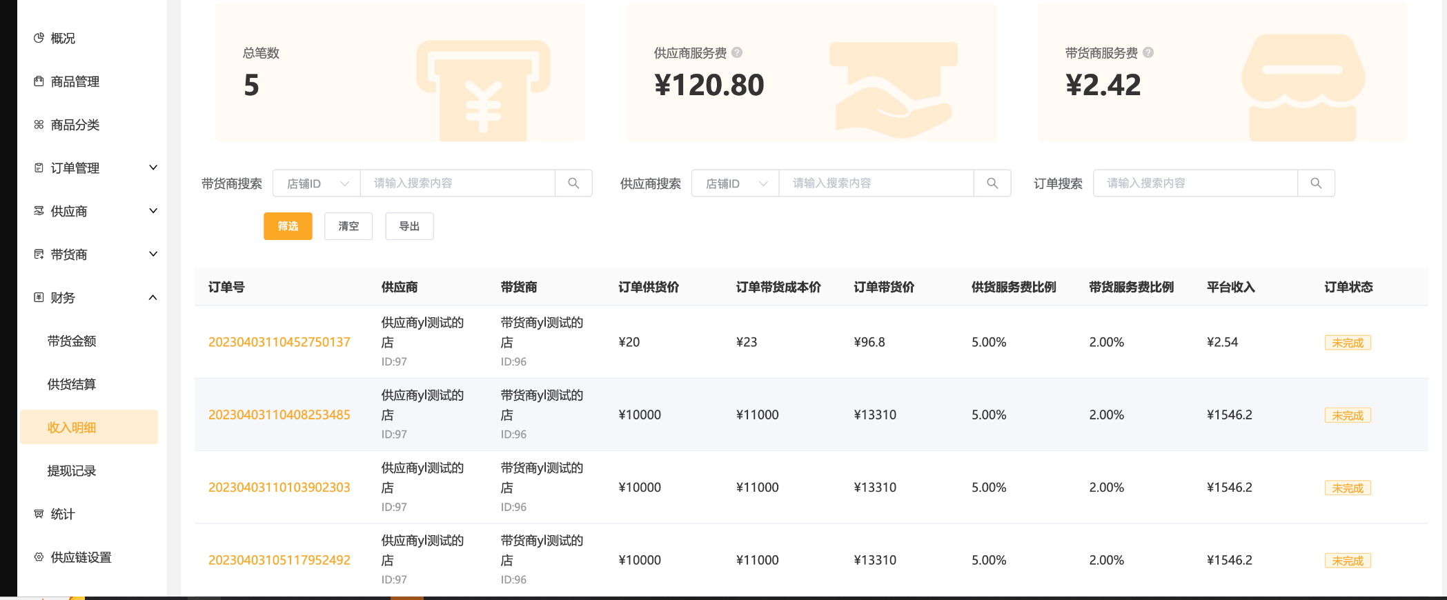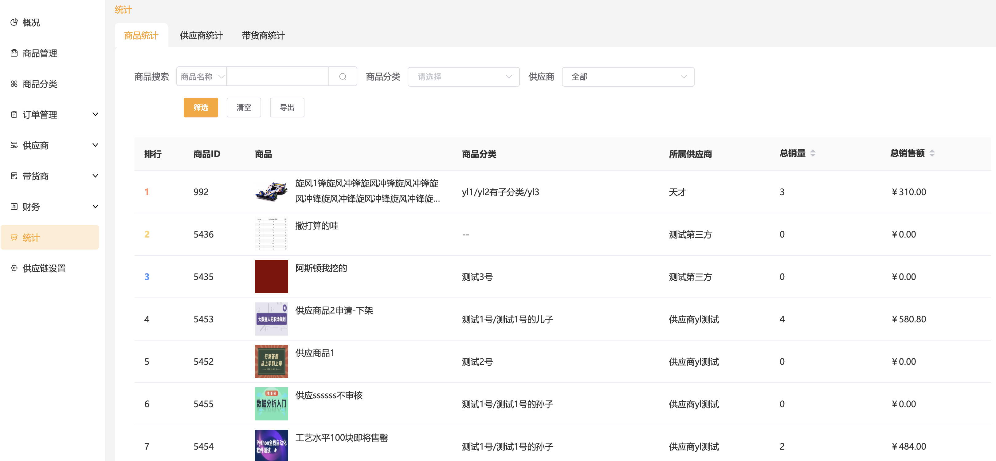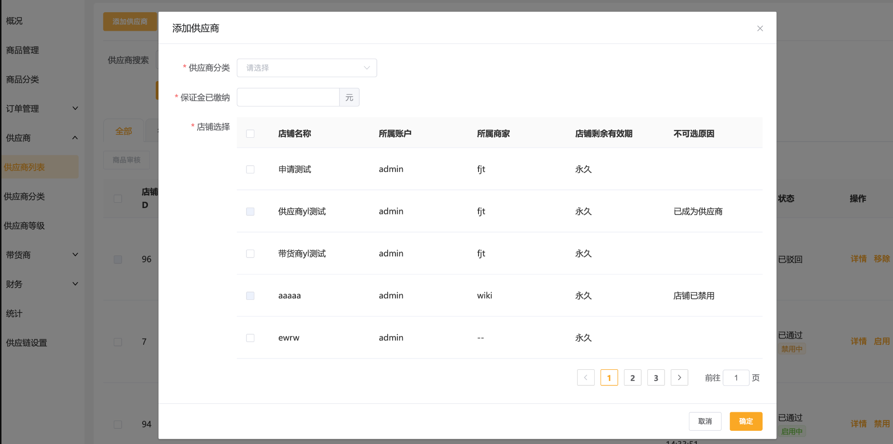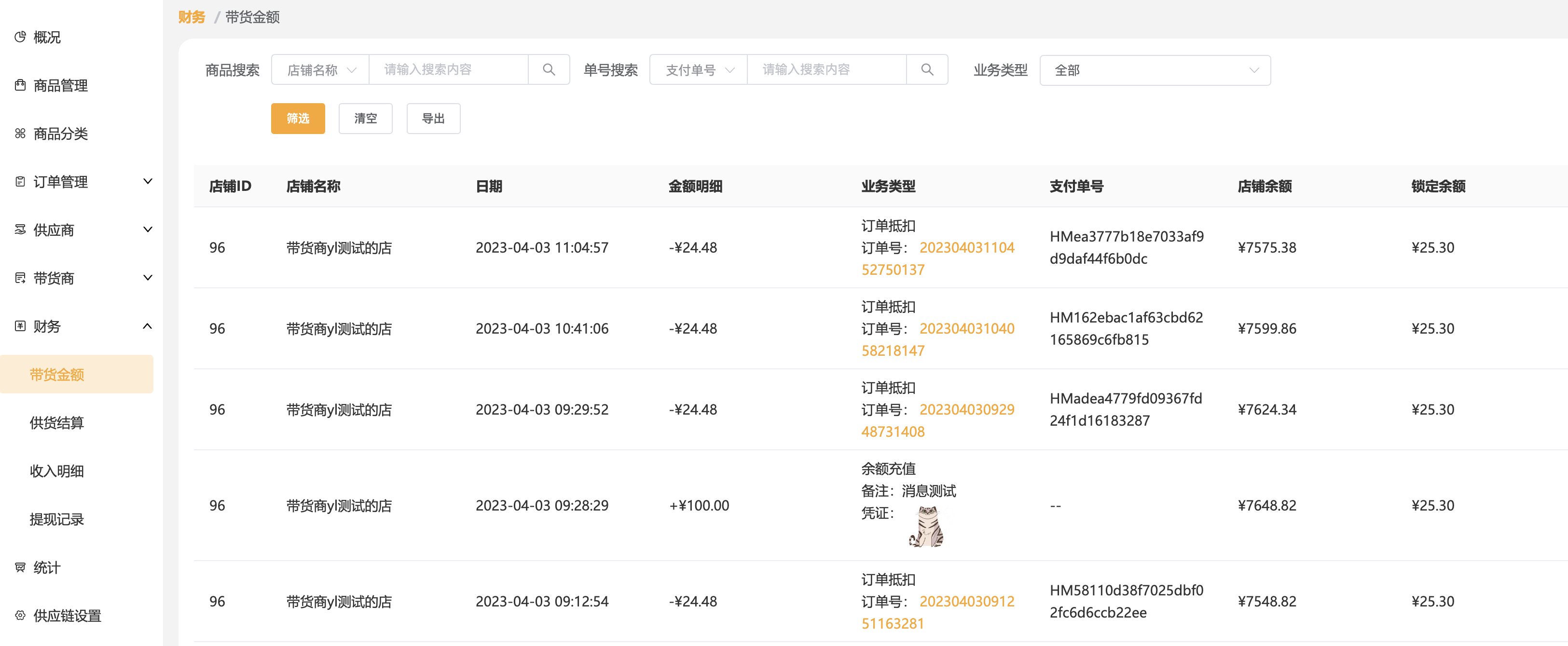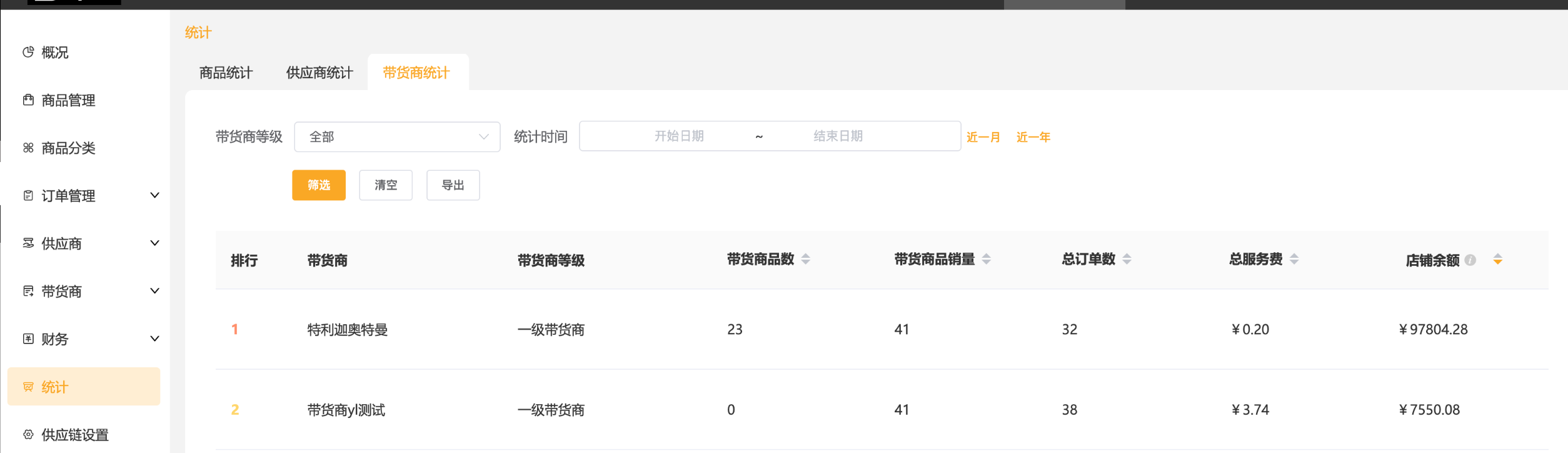 ### 供应链简介 供货商提供商品,平台作为审核,信息中转可从中抽成将商品信息传达给带货商,平台可设置商品的带货价格,从中赚取差额,带货商利用自身渠道售卖商品,订单由平台再次订单抽成后转达给供应商,订单由供应商来处理。 ### 供应链价值 1)对于供货商:增加了店铺商品的销售渠道,节省了商品推广费用。 2)对于带货商:带货商利用本身售卖渠道资源售卖商品,且无需线下仓库,即丰富了商城商品品类有增加了可靠货源,同时实现了渠道变现。 3)对于平台:平台可从供应商/带货商商品、订单中抽成,增加收入。 ### 链路说明 ***(当前仅支持私有化部署的ABEESHOP超级商城)***  ### 操作指南 1、进入平台工具中,购买供应链插件,点击供应链进入  2、概况中展示供应链中所有带货商、供应商的基本数据情况  3、商品管理中平台可查看并审核供应商申请供应的商品,同时也可编辑商品的分类、带货成本价格与建议零售价。带货成本价作为带货商售卖商品的商品成本用于支付;建议零售价为终端销售的价格(允许改价的带货商可修改售卖价格)  4、供应商申请供应商品时需选择平台的商品分类,带货商从不同商品分类中选择商品带货销售,建议平台尽可能的完善商品分类以供不同类型供应商申请供应商品 **分类说明:**分类下子分类与商品不可同时存在,举个例子:生鲜大类下增加了水产的子分类,那么生鲜下不可添加商品,仅可添加在水产下,或是再增加不同的子分类在生鲜下。  5、订单管理中展示订单列表与售后订单。 1)订单列表中展示所有的带货订单,可查看订单当前状态,待抵扣为带货商余额不足,当前余额不足以支付用户购买商品的成本价时的状态,此时订单将不会同步给供应商,以避免供应商不必要的损失 2)售后订单中展示所有带货商同步售后的订单,并同步售后信息提交给供应商后,供应商的售后状态  6、供应商 1)供应商列表展示所有供应商,供应商入驻方式有两种:第一种是供应商在自己商城插件中进入供应商插件申请入驻通过后缴纳保证金,平台在此处审核申请入驻的供应商;第二种是平台直接选择店铺将店铺添加为供应商。   2)供应商分类是为供应商设置的商家分类,不同分类可设置单独的服务费比例,举个例子,生鲜类商家本身利润少可设置低一些的服务费比例,服装类商家利润高,可设置高一些的服务费比例  、 3)供应商可设置不同等级,不同等级可设置不同的服务费比例与可供货数量  7、带货商 1)带货商列表展示所有带货商,带货商入驻方式同供应商,可在自己商城的带货商插件中申请,平台在此处审核申请入驻的带货商,或是由平台添加店铺为带货商  2)带货商可设置不同等级,不同等级可设置不同的服务费比例与可带货数量  8、财务中展示带货商的充值余额明细、供应商的供货结算明细、平台的服务费收入明细以及供应商提现结算金额的记录      9、统计中展示商品数据统计、供应商数据统计与带货商数据统计    10、设置中包含价格设置、提现设置、供应商入驻设置与带货商入驻设置 1)价格说明: 供货价:供应商供应的商品的货源价格,用于平台与供应商结算货款使用 供货指导价:供应商根据商品价值,提供给平台参考用的建议售卖价格 带货成本价:带货商售卖商品的商品成本,用于用户下单后带货商的充值余额抵扣商品货款使用; 建议零售价:平台建议带货商的终端销售的价格 带货价:带货商的终端销售价格,带货商不允许改价时,带货价=平台设置建议零售价  2)供应商入驻可设置入驻条件,店铺需满足条件后方可申请入驻  3)带货商可设置最小充值额与保证金