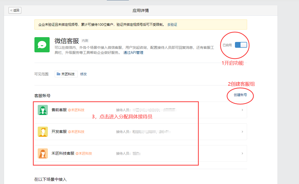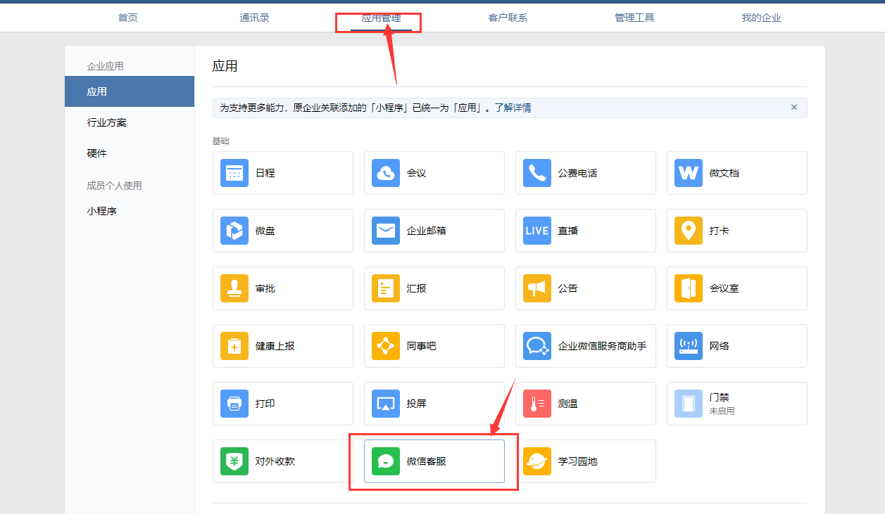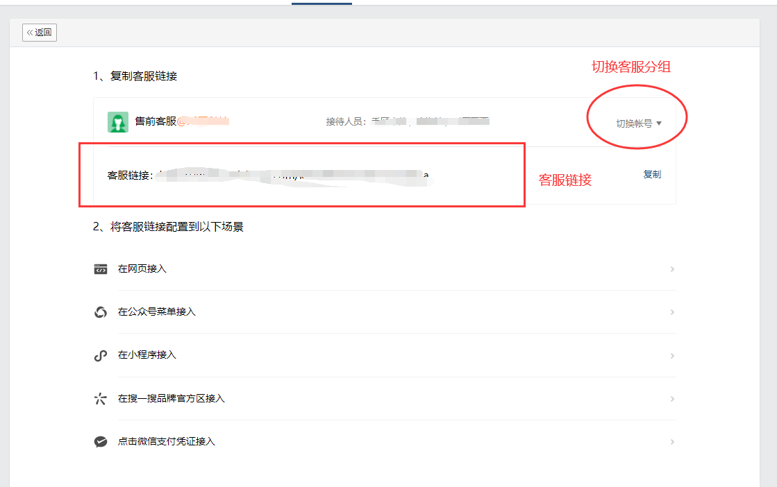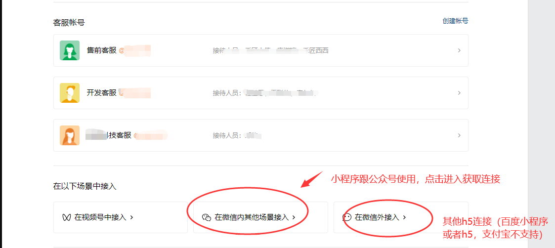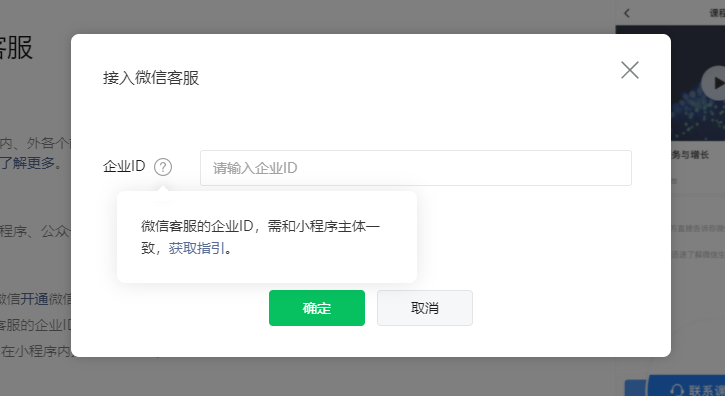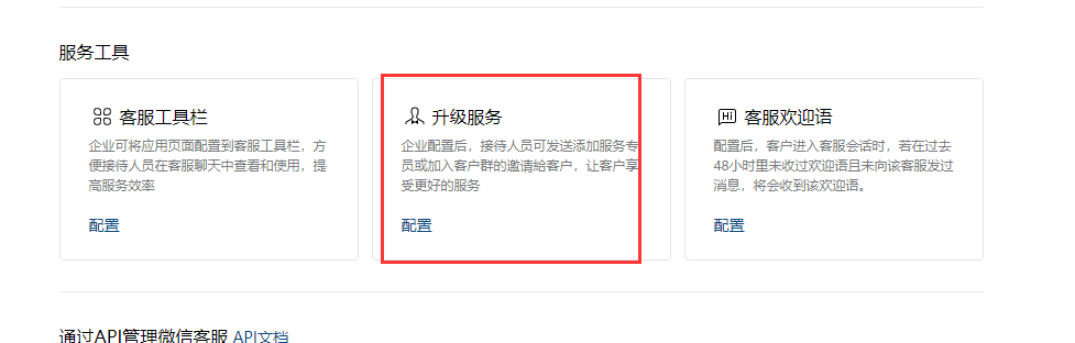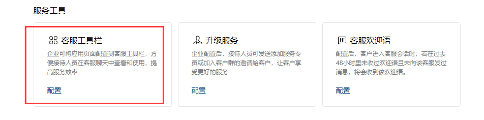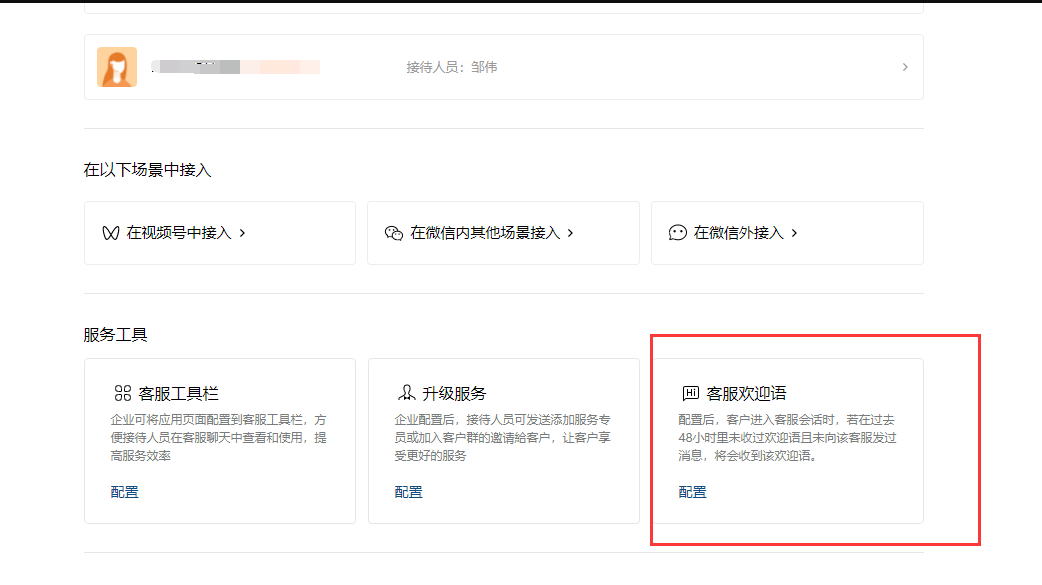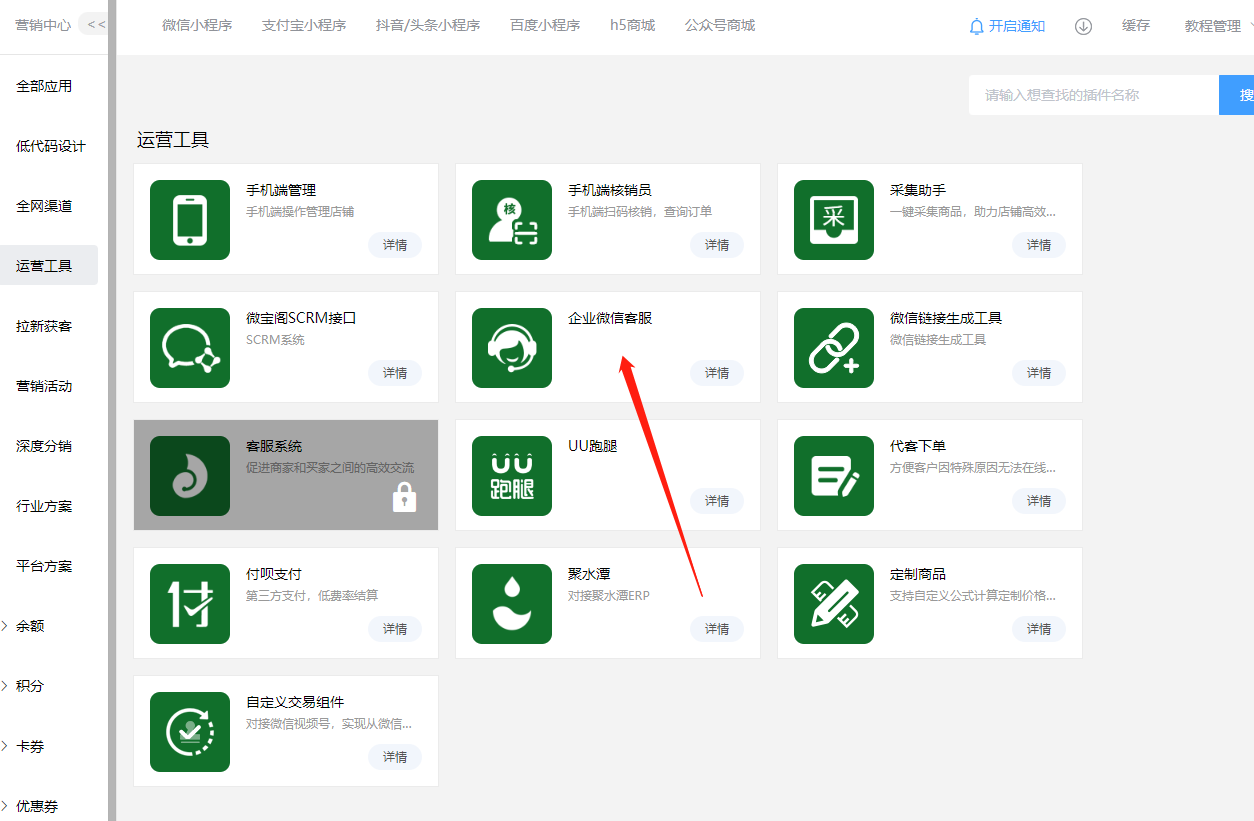 ## 部署手册 ### 1.获取企业id 登录到微信小程序官方后台-客服-微信客服-选择接入   登录-微信客服 (qq.com) 这个需要企业总管理员扫码 点击企业信息获取企业id   复制企业id填入之后就绑定成功  ### 2.分配客服 登录企业微信-企业微信 (qq.com)    ### 3.获取客服连接    ### 4.配置到商城使用     然后就可以在企业微信中沟通来自商城的微信客户了 ### 5.其他企业微信功能 #### 5.1 欢迎语设置   #### 5.2.客户栏设置   #### 5.3 专员跟群聊