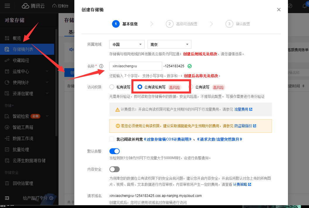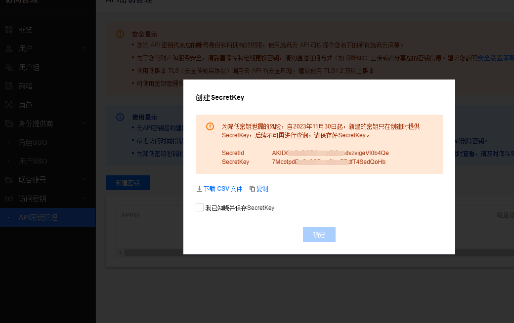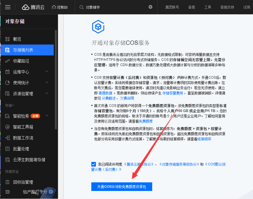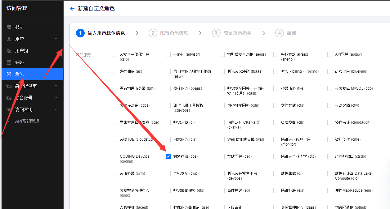 ==优点:无需备案域名,域名由腾讯云提供。缺点:费用比七牛云稍微高一点== ### 第一步:注册和认证腾讯云账号 **[腾讯云注册链接:](https://curl.qcloud.com/eYwqnmAw "腾讯云注册链接:")** #### 1.注册腾讯云账号 点击以下链接 https://curl.qcloud.com/eYwqnmAw  #### 2.认证账号 点击右上角注册,注册成功以后,点击有右上角账号头像,在认证状态中选择提交认证  没有特殊需求,请用个人认证即可,扫脸识别一分钟左右即可完成 ### 第二步:COS对象储存桶开通 #### 1.领取免费额度包 在控制台后面搜索框输入 “对象储存” 选择,对象储存/储存通列表  开通并领取 COS免费额度包  #### 2.创建储存桶 访问权限务必选择公有读私有写  高级可选配置,没有特殊需求默认即可  确认配置后创建  #### 3.复制储存桶和 +访问域名地址 到TXT文档  ### 第三部:AK和SK秘钥获取 #### 1.点击右上角头像-点击访问管理  #### 2.新建角色 新建一个有对象储存权限的角色  选择admin策略  输入角色名称并完成  #### 3.点击API秘钥管理  然后把AK和SK复制到TXT文档,然后点击确定 ### 4.第四步,填写腾讯云COS信息到数字官网远程附件后台