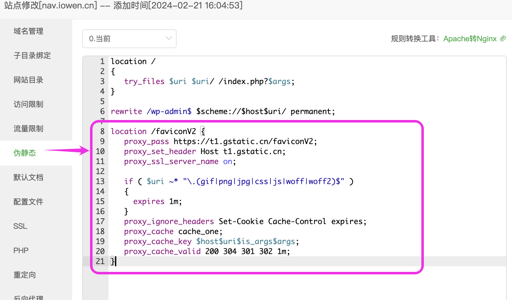 创建一个gstatic.cn的图标 favicon 反代服务,主要就是配置 Nginx 反向代理或者设置宝塔面板相关配置,本文重要以宝塔配置为例,其他的请自行处理。 ### 宝塔替换 1、在宝塔站点管理里新建一个站点,或者使用现有站点(如我的 nav.iowen.cn) 2、打开宝塔的【站点设置】->「伪静态」,如下图。  3、添加下面代码 ``` location /faviconV2 { proxy_pass https://t1.gstatic.cn/faviconV2; proxy_set_header Host t1.gstatic.cn; proxy_ssl_server_name on; if ( $uri ~* "\.(gif|png|jpg|css|js|woff|woff2)$" ) { expires 1m; } proxy_ignore_headers Set-Cookie Cache-Control expires; proxy_cache cache_one; proxy_cache_key $host$uri$is_args$args; proxy_cache_valid 200 304 301 302 1m; } ``` 注意: location /faviconV2 这行的 faviconV2 可以改为其他不影响原站业务的路径。 t1.gstatic.cn 可以改为 t0.gstatic.cn t1.gstatic.cn t2.gstatic.cn t3.gstatic.cn (请任选一个) 如果服务器在境外,.cn 可以改为 .com 选择就可以通过你的域名访问图标了,比如我的:https://nav.8wq.com/faviconV2?client=SOCIAL&type=FAVICON&fallback_opts=TYPE,SIZE,URL&size=128&url=https://iotheme.cn 4、配置主题设置 使用5.0版本的主题只需要到【主题设置】【其他功能】【favicon 图标源】里填写下面代码即可,注意域名换成你的。 `https://nav.8wq.com/faviconV2?client=SOCIAL&type=FAVICON&fallback_opts=TYPE,SIZE,URL&size=128&url=%url%` ### 进阶用法 比如想这样访问:https://nav.8wq.com/faviconV2?&url=https://8wq.com 比如想限制只能 *.8wq.com 访问 规则如下,自己看着修改一下吧 ``` location /faviconV2 { # 校验 Referer 或 Origin(防止跨站滥用) if ($http_referer !~* "^https?://([a-z0-9-]+\.)*8wq\.com(/|$)") { return 403 "Access denied"; } # 自动补全参数并拼接原始请求中的 $arg_url set $args "client=SOCIAL&type=FAVICON&fallback_opts=TYPE,SIZE,URL&size=128&url=$arg_url"; proxy_pass https://t1.gstatic.cn/faviconV2; proxy_set_header Host t1.gstatic.cn; proxy_ssl_server_name on; if ( $uri ~* "\.(gif|png|jpg|css|js|woff|woff2)$" ) { expires 1m; } proxy_ignore_headers Set-Cookie Cache-Control expires; proxy_cache cache_one; proxy_cache_key $host$uri$is_args$args; proxy_cache_valid 200 304 301 302 1m; } ```