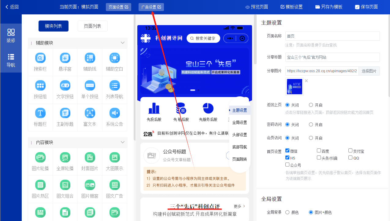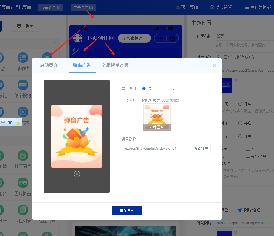 ### 1.进入页面装修编辑入口  ### 2.点击进入广告设置  ### 3.选择广告和链接  在这里,您可以根据运营场景去设置,启动页面,弹窗广告和全局背景音乐等!