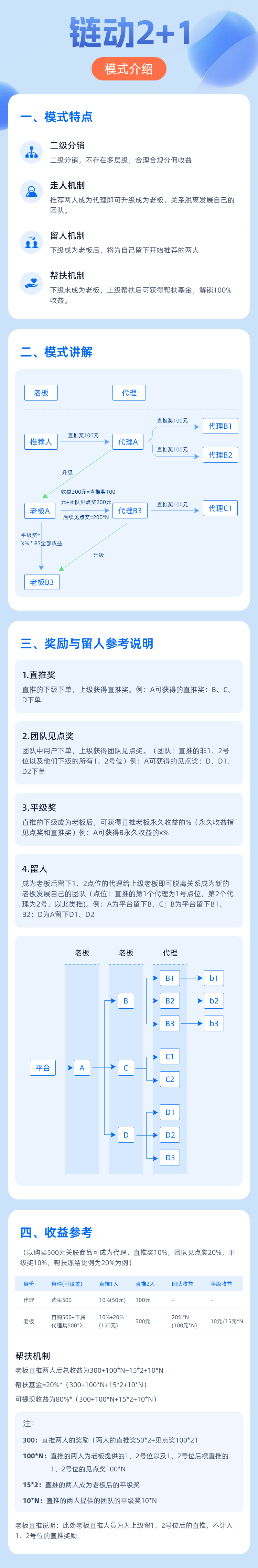 ## 一、功能介绍 ### 1、模式说明 链动2+1模式可以满足消费者既想拿到物美价廉的工厂直销产品,又想实现互利共赢的需求,这种模式是对消费者和工厂双方互利共赢的一种方式。通过2+1链动模式,省去中间商环节的直销模式,厂家可以直接接触到消费者,从而让消费者成为推广的主要力量。 ### 2、模式介绍 链动模式共两种身份用户即代理与老板,代理可获得直推奖,老板可获得直推奖、见点奖、平级奖。详细介绍见下图