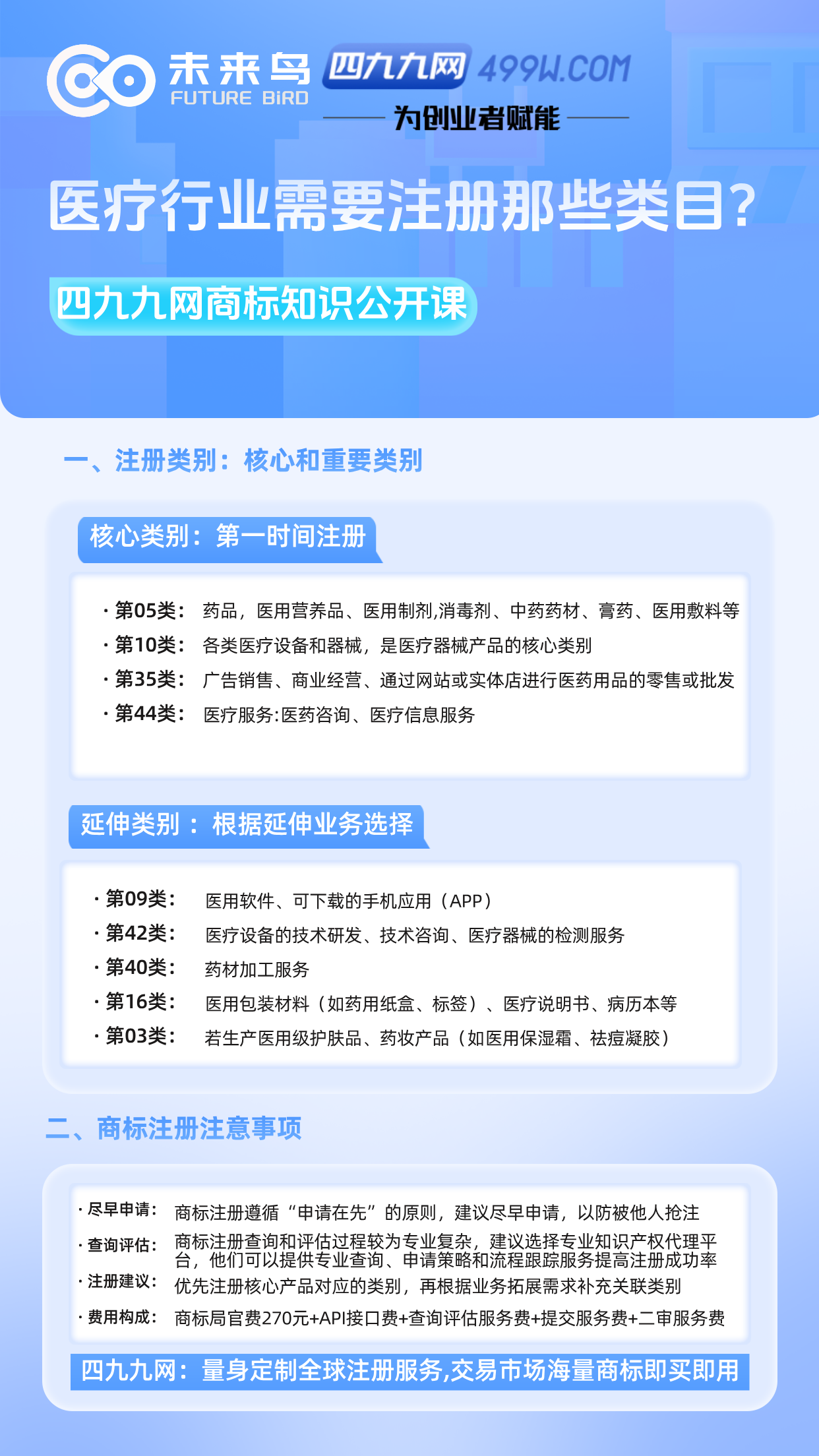 在竞争激烈的医疗健康市场,一个好的品牌名称和logo是赢得患者信任、脱颖而出的关键。但很多创业者只专注于产品研发,却忽略了商标布局这一重要环节。今天,我们就来聊聊医疗行业商标注册的那些“必选项”和“加分项”。 ****一、 医疗商标注册,先抓“核心四大类”**** 商标注册遵循“一类别一申请”原则,选对类别是成功的第一步。对于医疗行业,以下四类是必须优先注册的核心类别: * 第05类:药品及医用制剂涵盖范围:药品、医用营养品、医用制剂、消毒剂、中药药材、膏药、医用敷料等。这是制药和基础医疗产品的根基类别。 * 第10类:医疗设备器械涵盖范围:各类医疗仪器和器械,如手术刀、注射器、监护仪等。这是所有医疗器械产品的核心类别。 * 第35类:广告销售涵盖范围:广告宣传、商业经营、线上线下(网站或实体店)的医药用品零售或批发服务。即使你不生产产品,只要做销售推广,这个类别就必不可少。 * 第44类:医疗服务涵盖范围:医疗服务、医药咨询、医疗信息服务、康复中心等。这是医院、诊所、健康管理平台等服务型机构的标配。 **行动建议:**在创业初期,资源有限的情况下,应**优先确保这四大核心类别**的注册,为品牌建立最基础的护城河。 ****二、 业务拓展,这些“延伸类别”要考虑**** 当核心业务稳定后,如果想拓展版图,以下延伸类别可以帮助你构建更全面的品牌保护网: * 第09类:医用软件、可下载的健康管理APP。 * 第42类:医疗设备的技术研发、技术咨询、检测服务。 * 第40类:药材加工、制剂生产等服务。 * 第16类:医用包装袋、药品标签、医疗说明书、病历本等。 * 第03类:若业务涉及药妆(如医用保湿霜、祛痘凝胶),此类目是关键。 **行动建议:**可根据业务发展规划,**分阶段、有步骤地补充注册**相关延伸类别,实现品牌保护与业务发展的同步。 ****三、 商标注册,这些“坑”千万别踩!**** 除了选对类别,流程上的细节也直接关系到注册的成败。 1. 尽早申请,抢占先机商标注册遵循“申请在先”原则。想到一个好名字,应立即着手查询和申请,切勿犹豫,以免被他人抢注,造成巨大损失。 2. 专业查询,评估风险商标查询和评估专业复杂,自行判断容易出错。建议选择像四九九网这样的专业知识产权代理平台,他们能提供专业的查询分析、申请策略和全流程跟踪,能显著提高注册成功率。 3. 费用明晰,心中有数商标注册费用通常由以下几部分构成:商标局官费(270元)+ API接口费 + 查询评估服务费 + 提交服务费 + 二审服务费。选择服务时,要确认费用构成,避免隐形消费。 **结语:** 品牌建设,商标先行。对于医疗这一严谨的行业,完善的商标布局不仅是法律要求,更是企业长远发展的战略投资。 如果您对商标注册还有疑问,或希望获得量身定制的注册方案,欢迎联系**四九九网**。我们提供**全球商标注册服务**,并拥有**海量商标现货市场**,助您的创业之路一步到位,安全启航!