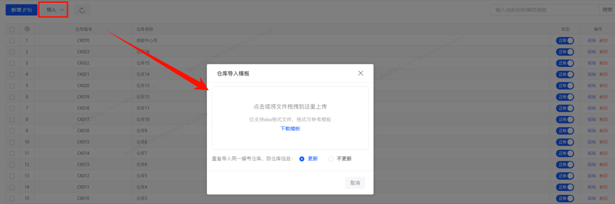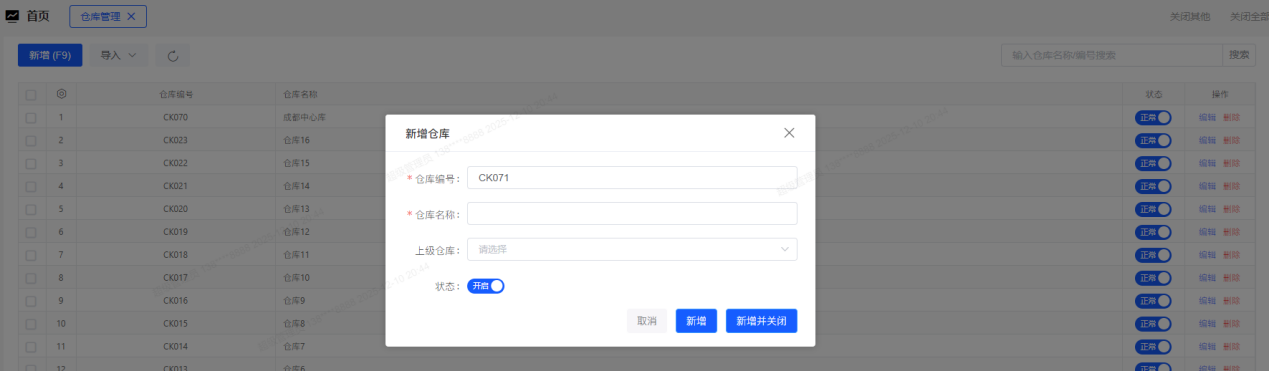 ## 仓库管理 1、【资料】→【仓库管理】,点击“新增”打开仓库界面;录入仓库编号、仓库名称并保存,仓库编号和名称为必录项,可选择上级仓库及仓库的状态。  2、点击仓库列表的修改图标,可打开编辑界面进行修改;点击删除图标可删除仓库;若仓库已被使用过,则不能被删除。 3、点击某个仓库状态栏的“已启用”,将状态变为“已禁用”。状态为“已禁用”的仓库在录入单据时不能选择。 4、点击导入可以快速用模板导入所有仓库