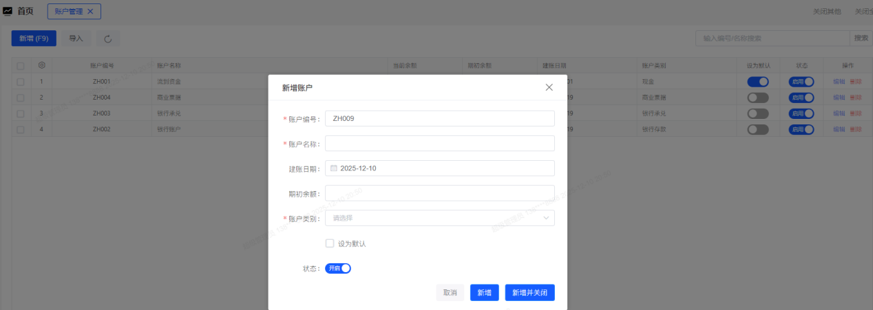 ## 账户管理 1. 【资料】→【账户管理】,点击“新增”打开账户界面,账户管理可以大致理解为是用于维护管理商家的结算账户,如:收款单和付款单的结算账户选择、开单页面的结算账户选择;  1. 输入账户编号、账户名称、账户余额及账户类别并保存;账户编号、名称、类别为必录项;建议录入准确的账户余额,现金银行报表的数据才会准确。 2. 账户列表中显示该账户的“当前余额”;点击列表左侧的的修改图标,可打开编辑界面进行修改;点击删除图标可删除账户;若账户已被使用过,则不能被删除。