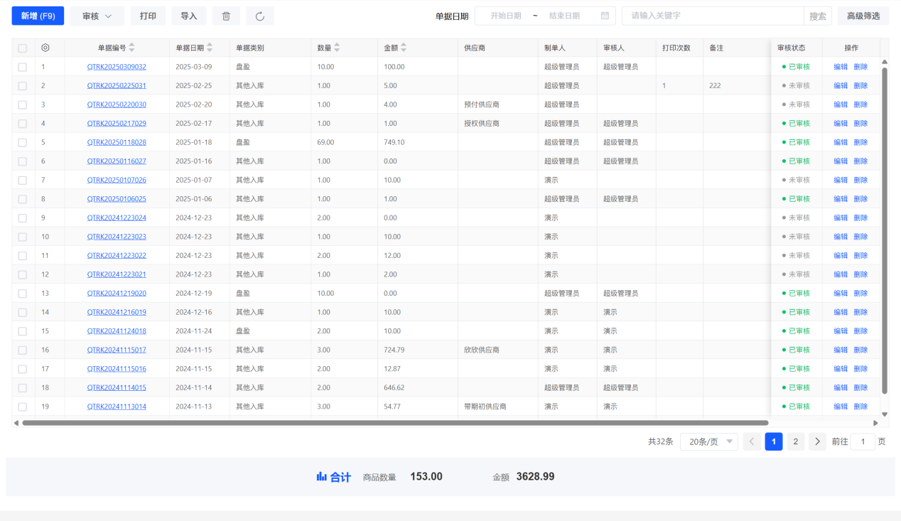 ## 其他入库  1. 【仓库】→【其他入库】:新增→选择业务类别(盘盈/其他入库)→录入商品信息(仓库、数量、入库单价)→审核/保存/保存并新增。选择商品后仓库会回填首选仓库,可根据实际情况选择其他仓库; 2. 其他入库单用于处理购货之外的增加商品库存的业务,比如盘盈,借入,接受捐赠等等。 3. 其他入库单保存后,商品的库存数量及成本增加; 4. 单据列表:可按照单据编号、供应商名称等关键字查询,也可以设置单据日期范围进行单据查找;在“高级搜索”中,可按仓库、业务类型、商品、制单人、审核人等条件设置查找; 5. 修改、删除:选中一笔单据可以修改、删除,特殊情况下,如有强关联业务的情况下,可能无法操作; 6. 审核:开启审核后工具栏才会显示操作按钮,可批量选择当前列表中的单据审核; 7. 导入:下载模版,按要求填写数据后导入,自动生成单据; 8. 打印:可批量打印当前列表中已勾选的单据。可选择已预设的模板打印。