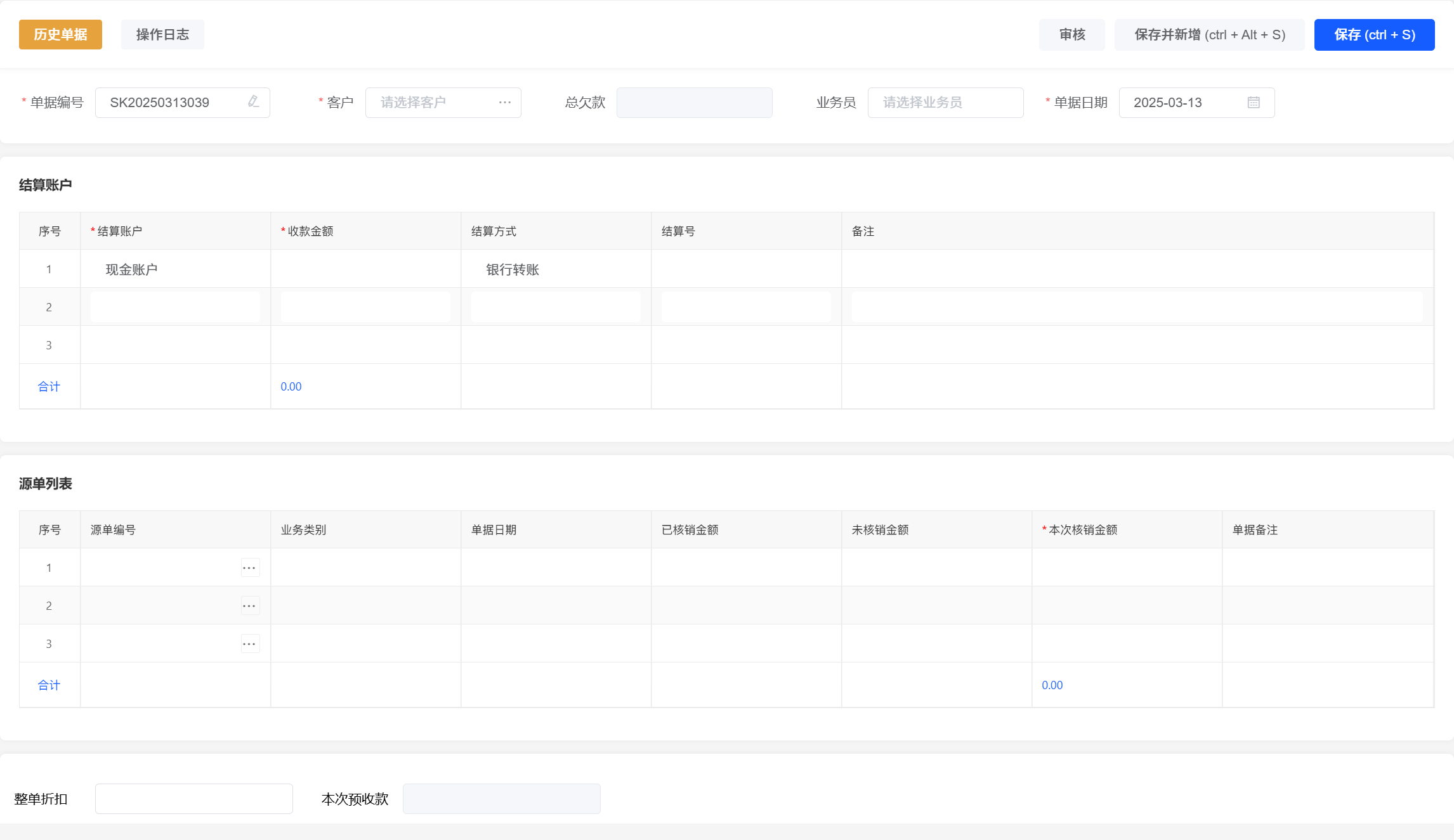 收款单是向客户收取如商品赊销货款或预收货款的业务行为,此单据可处理企业销售收款、销售预收款、销售退款等收款业务,同时支持单个销货单多次收款,或单个收款单同时处理多个销货单的业务。 点击【资金】→【收款单】,新增收款单。
