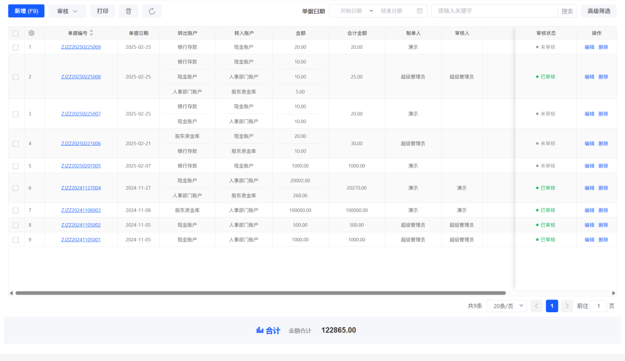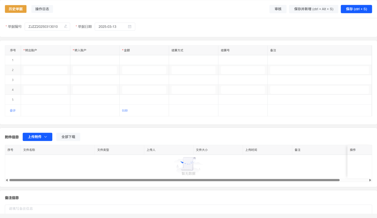 ## 资金转账单 1、资金转账单是用来处理公司内部资金转账、存现、提现的业务单据。 2、转出账户和转入账户为必录项,转出账户与转入账户不能相同。 3、这里选择的账户都是“资料\-账户管理”里维护的账户; 4、资金转账会统计记录在“现金银行报表”;  3、点击“新增”添加资金转账单;