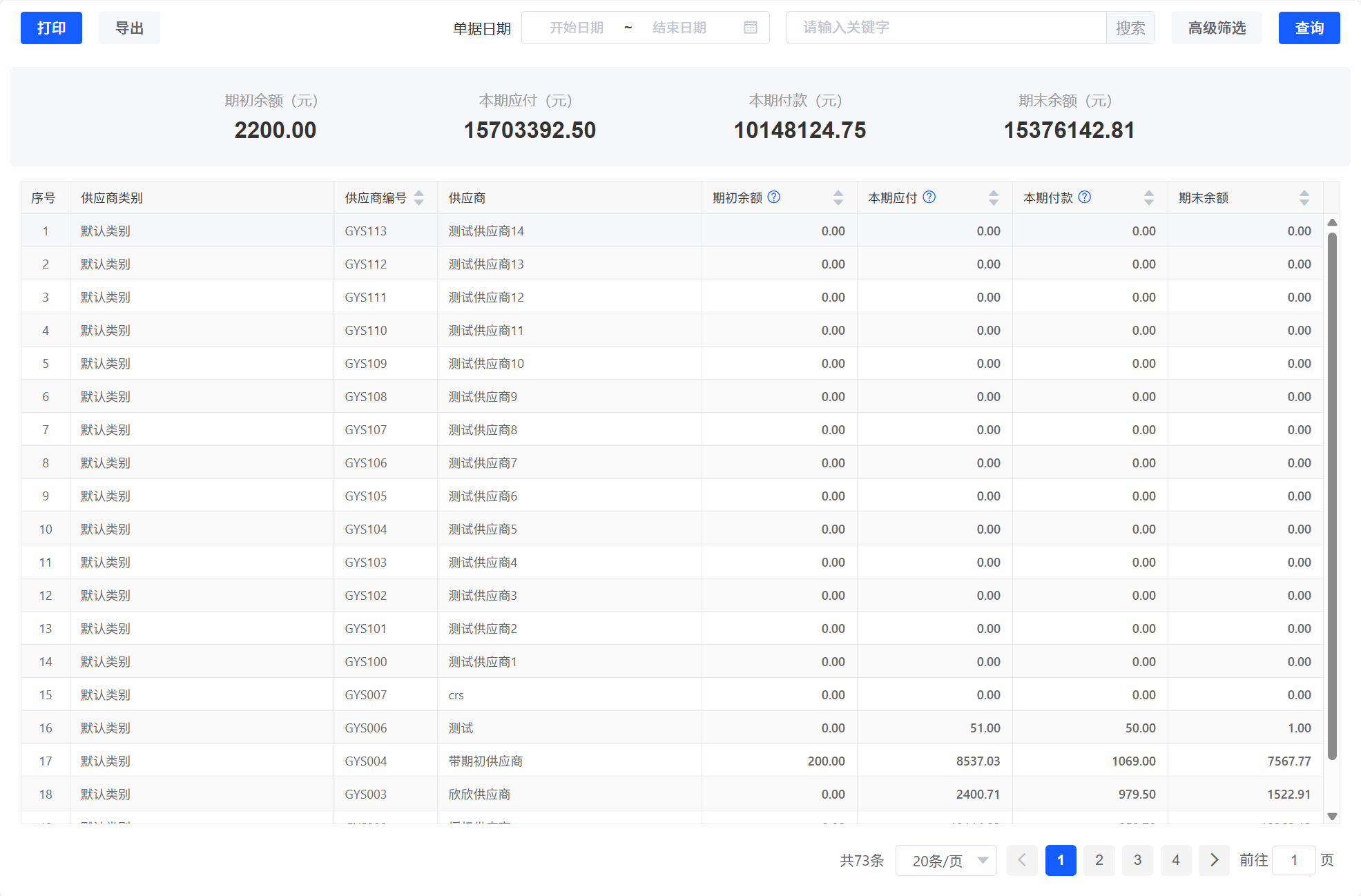 ### 应付账款汇总表 应付账款汇总统计一段时期内供应商的期初/期末余额,本期应付和本期付款情况,可按照供应商或供应商类别进行汇总。  1. 期初余额(表体):查询日期前一天的期末余额; 2. 本期应付(表体): 查询日期内,取所有购货单的优惠后金额\-购货退货单的优惠后金额\+ 其他支出单的金额\-付款单的整单折扣\+核销单中转入供应商的本次核销金额(业务类型:应付转应付)\-核销单中转出供应商的本次核销金额(业务类型:应付转应付和应收冲应付); 3. 本期付款(表体): 查询日期内,取所有购货单的本次付款\-购货退货单的本次退款\+ 付款单的付款金额合计\+其他支出单的付款金额; 4. 期末余额(表体):\=期初余额\+本期应收\-本期收款; 5. 顶部的汇总是所有数据的汇总,不会随查询时间变更;