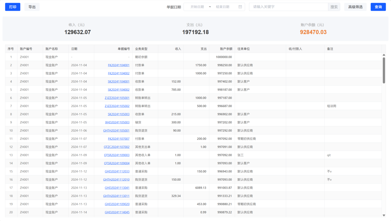 ### 现金银行报表 现金银行报表用于查询各银行账户及现金的收入、支出及结余情况,可以按客户、供应商、结算账户、收付款人查询。  1. 期初余额(表体):指各个账户截止查询日期前一天的账户余额,合并计算查询时间段的资金数据后就是查询时间段末的账户余额,即“期末余额”;(即查询日期1号\-5号的期末余额和查询时间在6号之后的期初余额是一致的) 2. 如果账户设置了期初余额,则未产生任何业务数据的时候,账户的期初余额始终是设置的余额,后续就是根据查询时间内的实际业务情况计算; 3. 单据按照单据日期排序,为计算核对方便,时间越早的越排前; 4. 账户余额:查询时间段末的余额,余额会随切换时间变更;