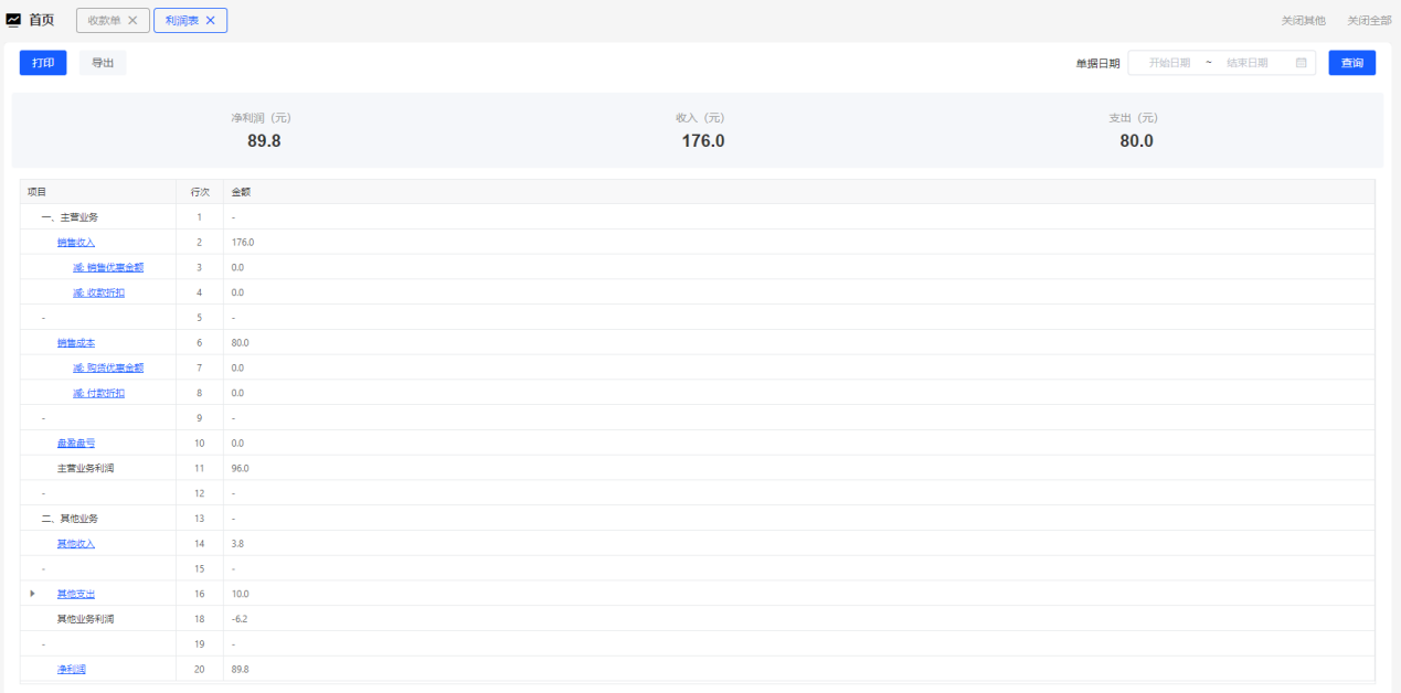 ### 利润表 利润表是按照业务维度出具的统计企业主营业务、其他业务的收入、成本、利润情况的综合报表。  **利润表分两部分,主营业务及其他业务,各项目计算公式如下(括号数字为列表的行次,业务名称前的“减”指减少利润的意思,计算公式的时对应“\-”):** 1. 净利润(20)\=主营业务利润(11)\+其他业务利润(18) 2. 主营业务利润(11)\=销售收入(2)\-销售优惠金额(3)\-【销售成本(6) \- 收款折扣(4) \- 购货优惠金额(7)】\- 付款折扣(8) \+ 盘盈盘亏(10); 3. 其他业务利润(17)\=其他收入(14)\-其他支出(16); **利润表项目取数规则如下:** 1. 销售收入(2):取时间范围内所有销货单、销货退货单折扣后的金额合计(**表体商品合计**); a\-1:该收入是指商品实际销售的金额,不含整单优惠,值(基本都是正数)\=销货单“销售金额/”合计\-销售退货单“销售金额”合计; 1. 减:销售优惠金额(3):取时间范围内销货单、销货退货单的收款优惠合计(**表尾整单折扣**); b\-1:该金额指对应单据的整单折扣优惠,优惠额录入正数,那么销货单的优惠就可以认为是客户少付款,所以会减少利润,销货退货的优惠可以认为是商家少退款,所以会增加利润,则最终的合计如下; b\-2:值\=销货单“优惠额”\-销货退货单“优惠额”,为正则减少利润,为负则增加利润; b\-3:销售收入减去销售优惠金额\=一定时间内的实际的销货金额; 1. 减:收款折扣(4):取时间范围内收款单的整单折扣(**表尾整单折扣**); c\-1:收款单的整单折扣是手动录入的,会转为预收款。录入正数,对应减少利润; c\-2:值(显示正数)\=时间范围内所有收款单优惠额的和; 1. 销售成本(6):取时间范围内销售明细表里的销售成本合计(成本根据购货金额和存货计价方式计算成本); d\-1:其值来自于“销售明细表”里的成本统计,销售成本为正则利润减少,为负则利润增加; 1. 减:购货优惠金额(7):取时间范围内购货单、购货退货单的付款优惠合计(**表尾整单优惠**); e\-1:该金额指对应单据的整单折扣优惠,优惠额只能录入正数,那么购货单的优惠可以认为是商家少向供应商付款,所以会增加利润,购货退货的优惠可以认为是商家多向供应商退款,所以会减少利润,则最终的合计如下; e\-2:值\=购货单的“优惠额”\-购货退货单的“优惠额”,当这个值为正数的时候会增加利润,反正减少利润; e\-2:优惠额只能录入正数,购货单对应的会增加利润,购货退货单会减少利润; 1. 付款折扣(8):取时间范围内付款单的整单折扣(**表尾整单优惠**); f\-1:付款单的整单折扣是手动录入的,会转为预付款。录入正数,则对应增加利润; 1. 盘盈盘亏(10):取时间范围内商品收发汇总表的盘盈成本合计\-盘亏成本合计; g\-1:值\=盘盈的成本合计\-盘亏的成本合计,为正数的时候会增加利润,负数减少利润; 1. 其他收入(14):取时间范围内其他收支明细表的收入合计; 2. 其他支出(16):取时间范围内其他收支明细表的支出合计;  主营业务利润:【170\-(\-2)】\-【(\-91\.35)\-20\-(\-10)】\-20\+0\=253\.35;