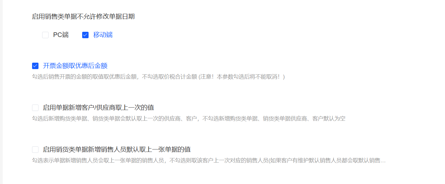 ### 功能参数 1. 启用税金:若勾选了启用税金,则购货单,销货单中增加“税率”“税额”“价税合计”列,需要填写增值税税率,设置的税率会自动带入单据中; 2. 商品价格是否含税:勾选后,商品资料中预设的采购和销售价格,对应购货、销货类单据中的含税单价列,不勾选则对应不含税单价列。 3. 启用辅助属性:勾选后,才可以设置商品的辅助属性,如颜色、尺寸等。 4. 启用序列号:勾选后,才可以对商品进行序列号管理。 5. 启用批次保质期管理:勾选后,才可以对商品进行批次保质期管理。 6. 启用货位:启用后将新增商品货位管理功能。 7. 启用审核:基础版不提供此设置,标准版中若勾选了启用审核,则购货单,销货单需审核后才会增加或减少库存。 8. 启用自动出库最早批次:启用后录入出库类单据时,会自动选择商品最早时间的批次 9. 启用分仓核算:启用后将商品的成本将根据各分仓核算, 未启用根据总仓核算。 **更多配置如下图:**