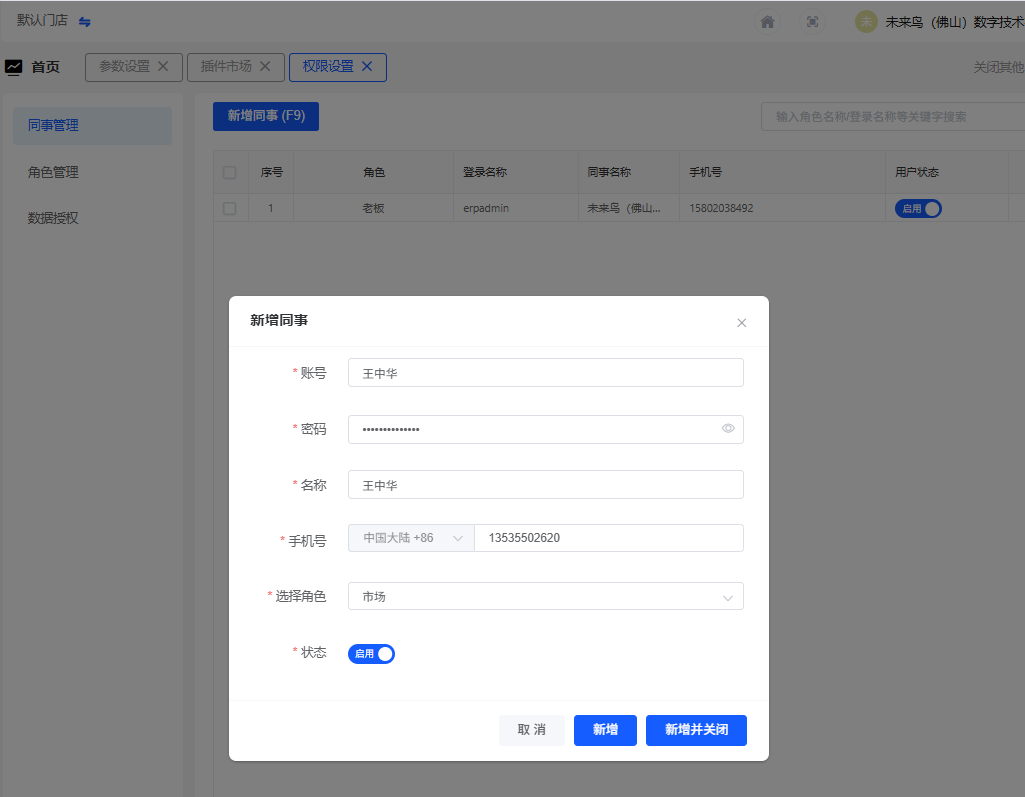 ### 同事管理(添加登录账号) 1. 【资料】→【权限设置】→新增同事:同事指可登录操作本系统的用户,由购买的用户数决定,用户数不足请加购后再添加同事。