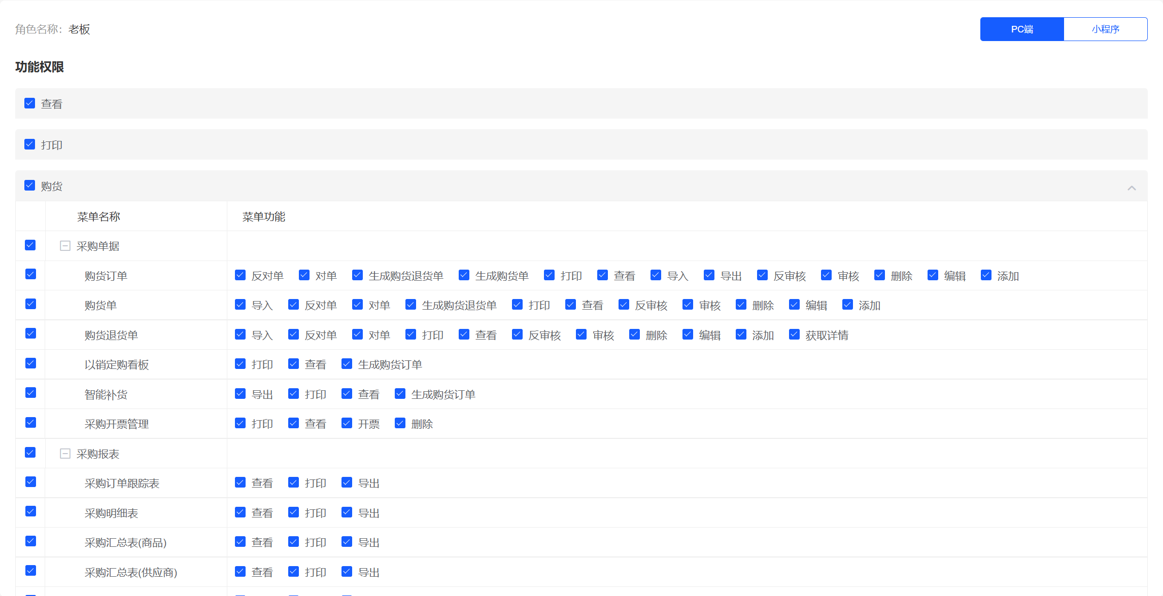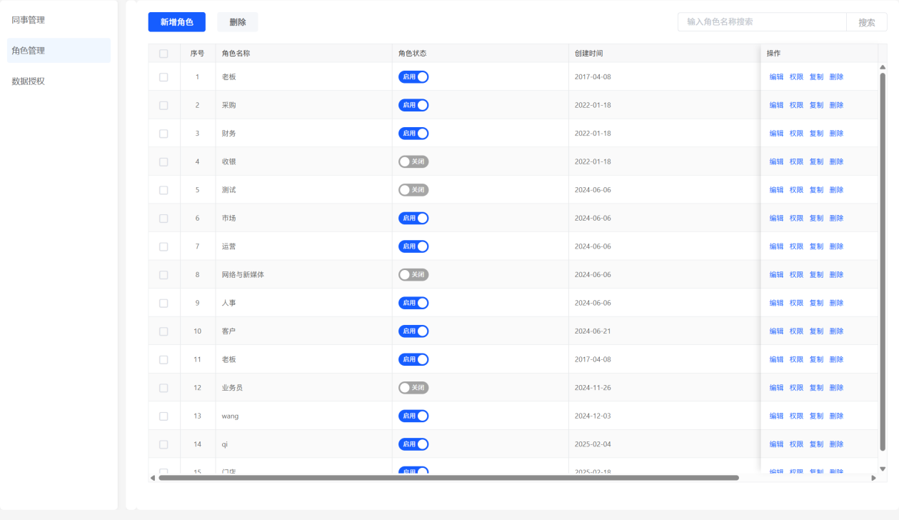 ### 角色管理(功能授权) 1. 管理员可根据企业实际情况,创建不同的角色,为角色设置对应的功能权限。   功能授权给同事:新增/编辑同事的时候选择对应的角色即可获取角色下的全部功能权限; 1. 系统提供:按功能模块授权(横向)、按操作组授权(纵向),用户也可自行勾选具体操作权限。