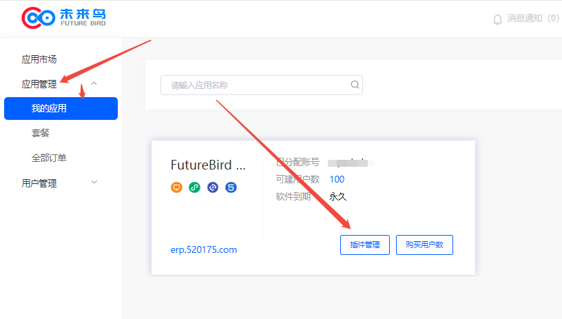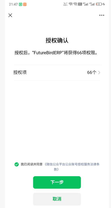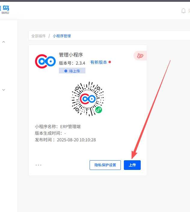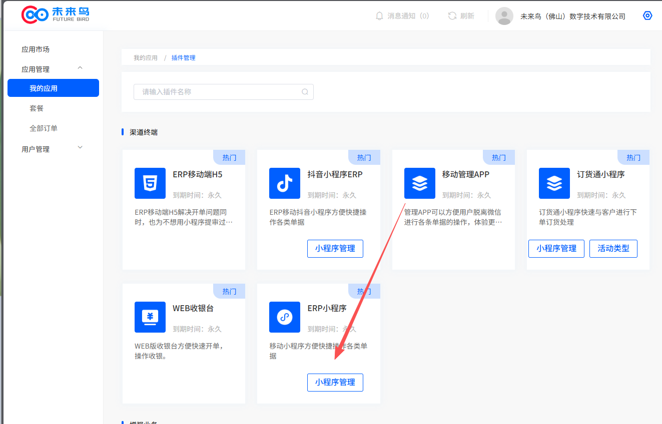### 一,前置已完成条件 >d **前置条件** > >- [ ] 1,小程序已完成微信认证 >- [ ] 2,小程序已完成ICP备案 >- [ ] 3,小程序地理位置相关接口已开通 >- [ ] 4,小程序隐私协议已完善 >- [ ] 5,微信支付已经申请认证完毕 >- [ ] 6,微信支付已和小程序授权关联完毕 >- [ ] 7,ERP系统已购买转正并购买了订货通小程序插件 >i **微信小程序代实施上线服务** > > 如果您没有时间或对应用软件操作不太熟练,请联系我司提供小程序付费上线服务。费用为每个小程序2980元/。7-15个工作日内完成实施上线服务。 >[**查看ERP应用增值服务明细和收费标准**](https://wln.wiki/doc/3624/) --- **前置条件相关教程** [全新小程序申请认证教程](https://wln.wiki/doc/18/) [小程序ICP备案教程](https://wln.wiki/doc/3643/) [微信支付商户号申请认证教程](https://wln.wiki/doc/31/) [微信支付和小程序绑定与授权教程](https://wln.wiki/doc/27/) [小程序地址位置申请教程很文案素材](https://wln.wiki/doc/3137/) [微信小程序隐私协议过审模板](https://wln.wiki/doc/2499/) ### 二,ERP管理端小程序对接 #### 1.登录ERP账户集中管理中心 登录地址:https://admin.520175.com/#/login  >w **登录账号信息** > > 这里的登录账号和您在ERP端注册的一样,输入相同的手机号/用户名/和密码即可成功登录。 > #### 2. 进入插件管理 应用管理—我的应用—FutureBirdERP—插件管理  #### 3. 点击ERP小程序管理  #### 4. 点击管理小程序授权 点击“授权”绑定即可  #### 5. 管理员在手机端需要点击授权授权,并成功授权  成功授权后刷新页面 #### 6. 直接上传新版然后等待审核即可,