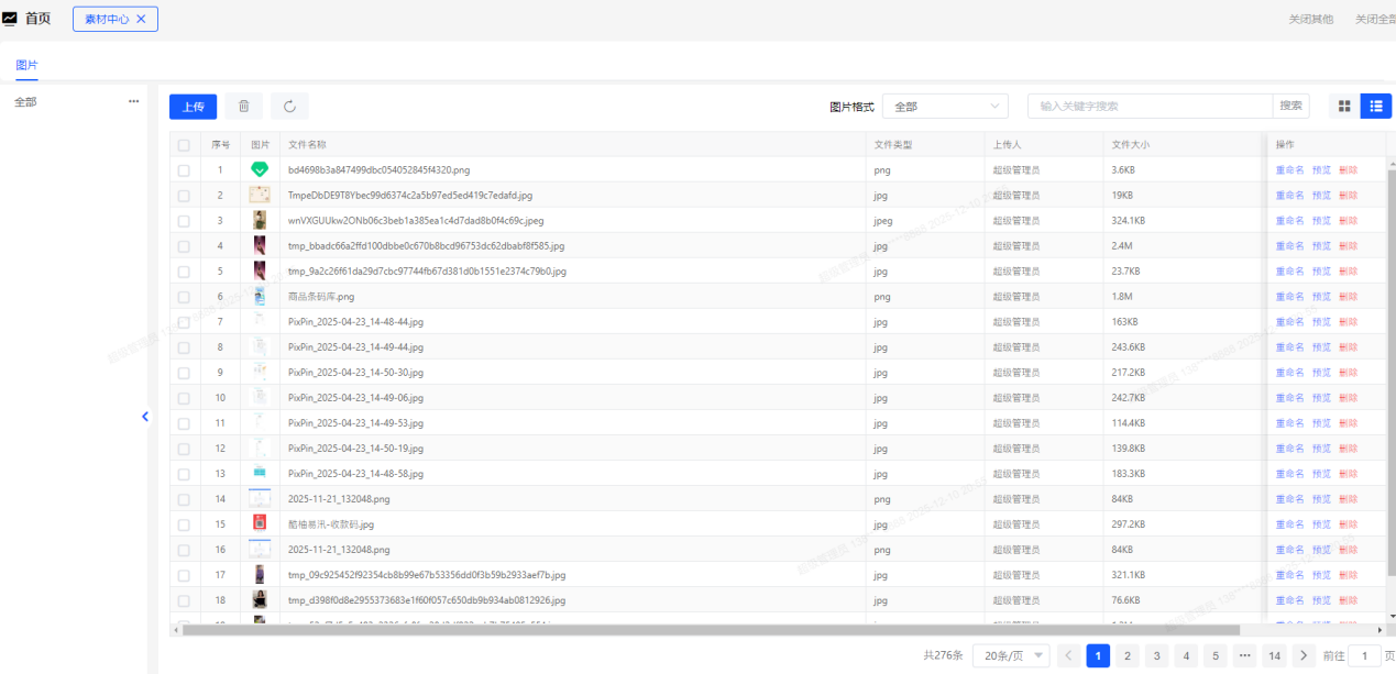 ### 素材中心 1、【资料】→【素材中心】,可上传图片作为商品编辑等功能的常用图片素材;  2、素材中心的图片常用于商品图片等需要上传图片的功能中,支持图片分类、编辑、预览等操作。