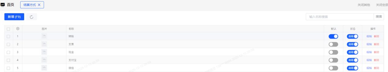 ### 结算方式 1、【资料】→【结算方式】,点击新增打开新增界面。输入结算方式名称保存。 2、结算方式用于录入资金类单据(收款单、付款单等)时使用。