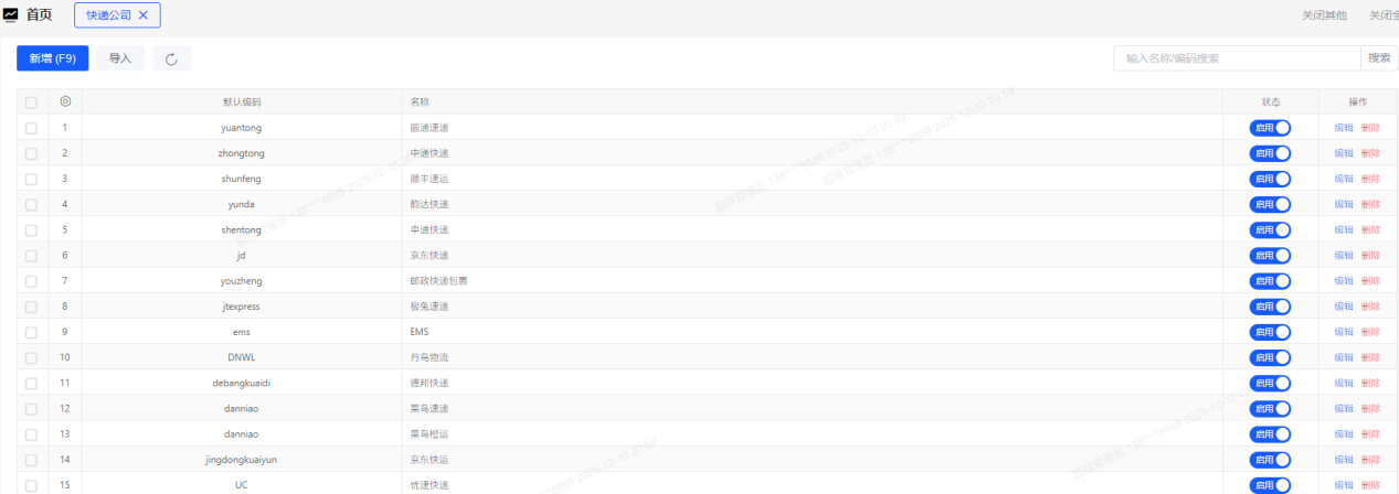 ### 快递公司 1、【资料】→【快递公司管理】,点击新增打开新增界面。输入快递公司名称、编码保存。 2、快递公司信息用途同车辆管理,其他功能适用请根据实际情况选择即可。