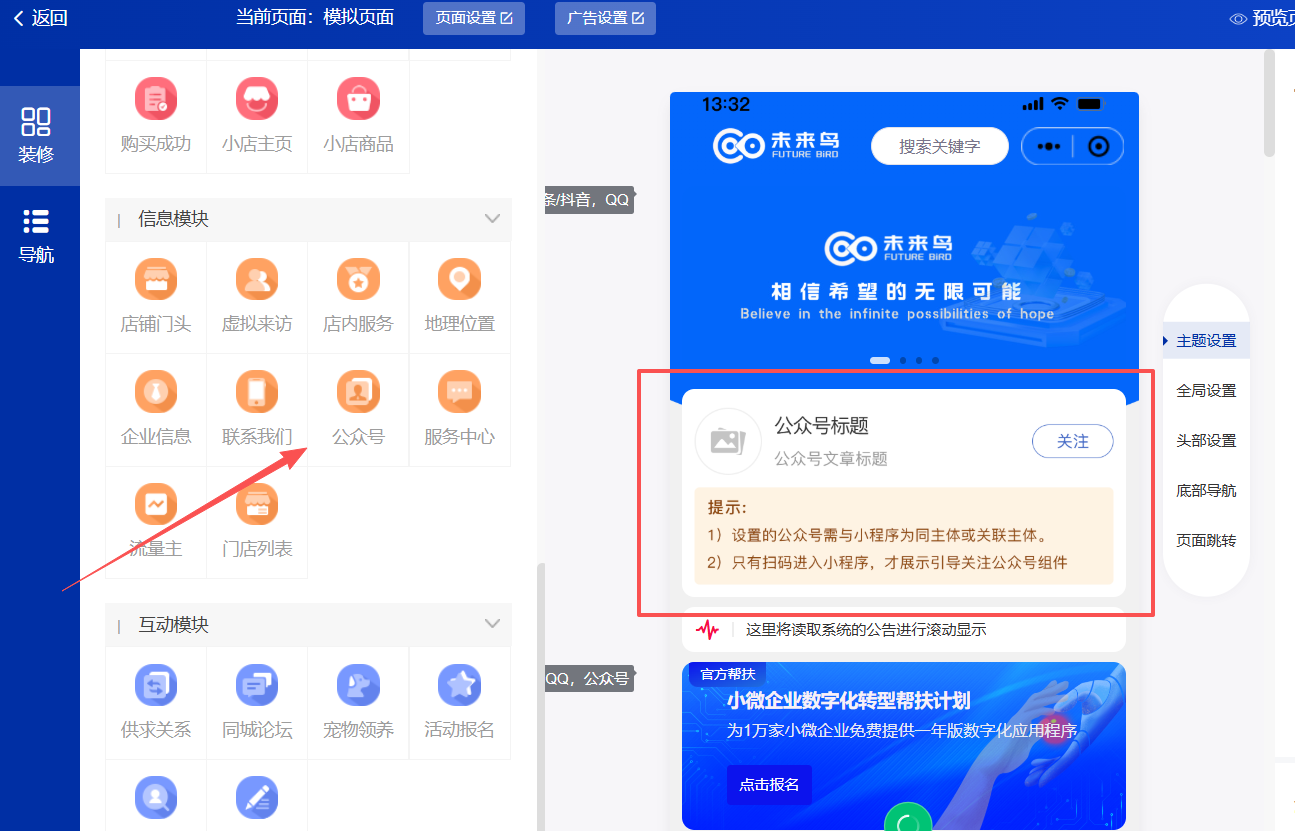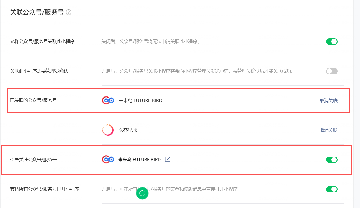 在小程序里想引导用户去关注公众号,一般是通过**“小程序内打开公众号文章/卡片 + 用户主动点击关注”**的方式实现,因为微信规则不允许自动帮用户完成关注动作。 可以按下面思路来做: ## 一、使用“公众号组件”(需要绑定关系) 前提是:**小程序主体要和公众号主体一致,且已完成绑定和小程序开启公众号关注功能**。 1. **在小程序中嵌入公众号组件** * 在数字云平台-设计-页面装修编辑中:  ``` 点击右边的公众号组件即可 ``` 该组件会展示公众号名片、头像、名称等信息,用户点击后即可自动关注,客户端端效果如下 ### 1.关注页面  ### 2.用户点击弹出关注界面  ### 3.用户点击关注后即可自动关注成功  >d **注意事项** > > 只能在已认证的服务号、且与小程序绑定的情况下使用; > 必须要在小程序设置中开启关联设置,开启引导关注公众号并设置 > 组件展示位置和样式受微信规范限制,不能完全自定义隐藏或伪装。 > 受微信规则影响只有在扫码访问的时候才会自动出现关注组件,正常访问和分享不会出现关注公众号组件 ### 4,小程序开启关注组件引导 #### 小程序后台设置关联设置  #### 打开关联公众号/服务号设置  ## 二、利用“公众号文章”间接引导关注 1. **在小程序里插入公众号文章链接** * 进入公众号后台 → 找到目标文章 → 点“复制链接”。 * 在小程序对应页面中,用按钮、图片或文字加上这个链接(比如 `navigateToMiniProgram`或 `<web-view>`等方式跳转)。 2. **文章里做好关注引导** * 在文章顶部或底部放明显的“关注提示”,例如: * “关注本公众号,第一时间获取活动通知” * 配一张带二维码或“关注”字样的头图。 * 用户点进文章后,如果愿意关注,就长按二维码或在公众号主页右上角手动关注。 * * * * * * ## 三、通过客服消息 / 模板消息引导 1. **在小程序内触发客服会话** * 页面上加一个“联系客服”按钮(`open-type="contact"`)。 * 用户点开后进入客服会话界面。 2. **在客服回复中给出关注入口** * 由人工或自动回复发送公众号名片、文章链接或二维码; * 用户点击名片可进入公众号主页,再自行关注。 * * * ## 四、常见合规提醒 * **不能自动关注**:任何方式都不能绕过用户主动点击、扫码、长按识别等操作。 * **不能诱导过度**:避免用“不关注就不能用功能”“必须关注才能领奖”等强强制话术,容易违规。 * **建议话术**:用“了解更多信息请关注公众号”“获取完整攻略可关注我们”等软性引导。