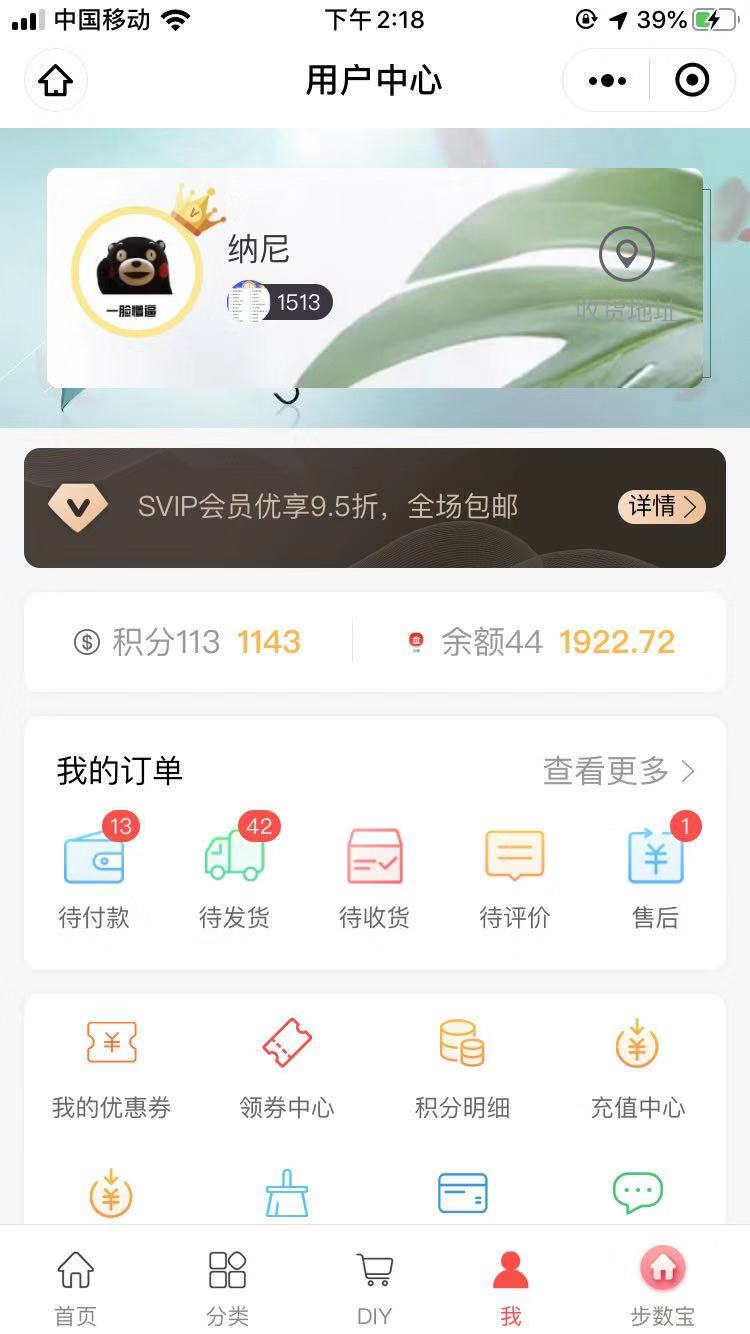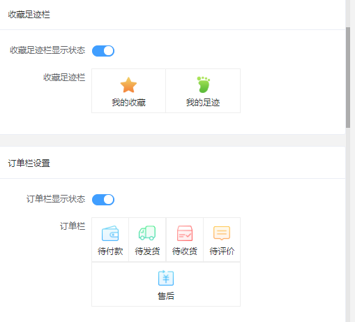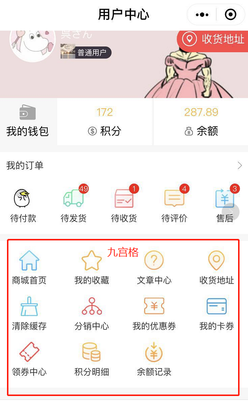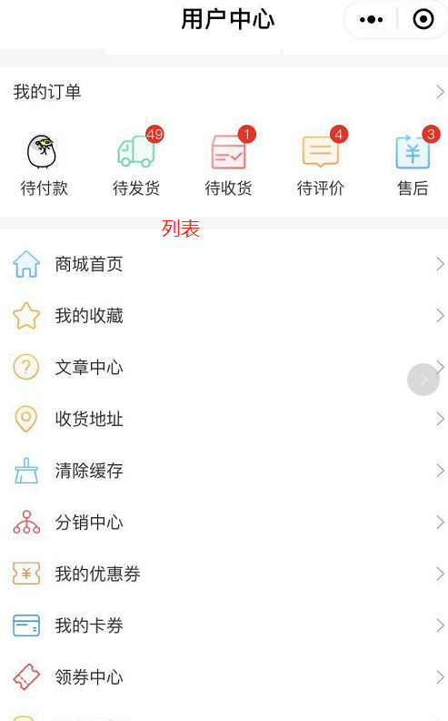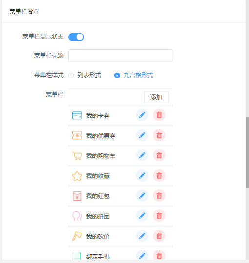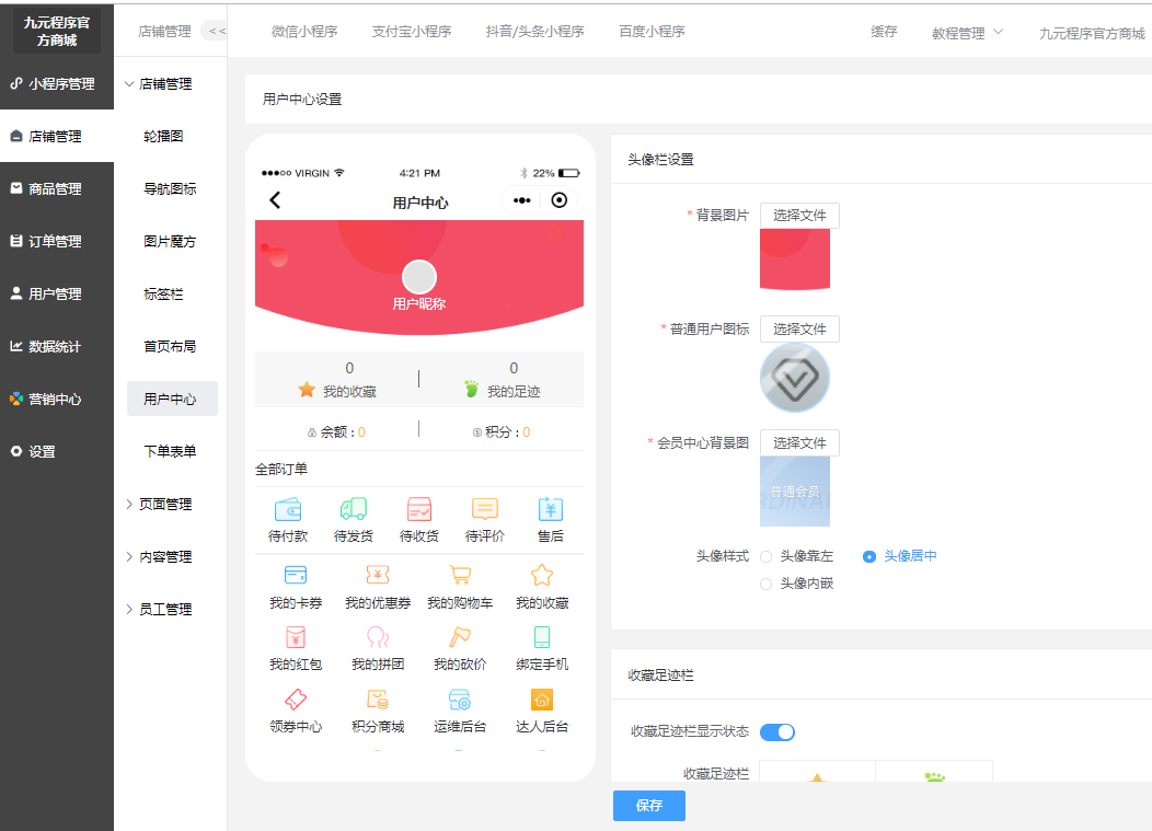 ### 用户中心 #### 用处: 可以根据需要添加用户中心所需要的功能。      - 菜单支持拖动排序 - 菜单支持显示隐藏 - 支持设置用户中心顶部背景图 - 订单栏支持显示隐藏 - 支持订单栏文字和图标自定义 - 我的钱包支持显示隐藏(积分和余额) - 手动授权手机号支持开启关闭 - 头部样式支持三种    - 支持自定义菜单名称 - 菜单栏支持列表形式和九宫格形式   - 小程序端效果图: