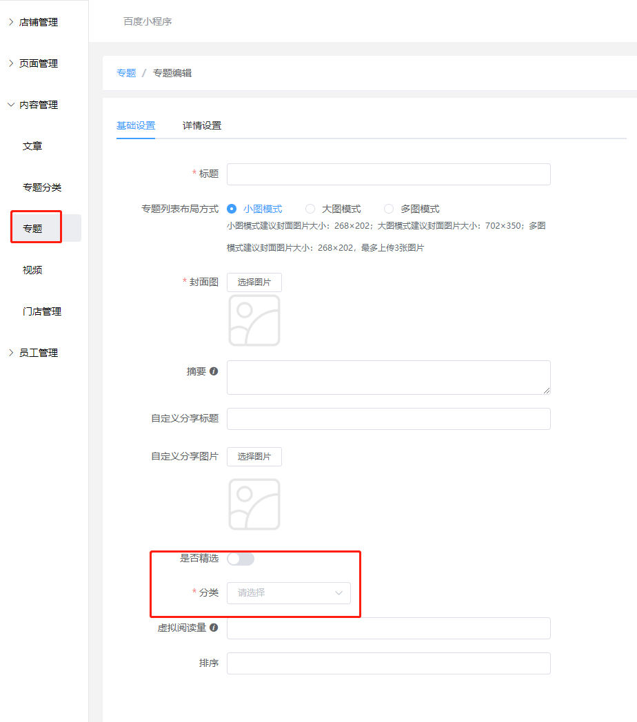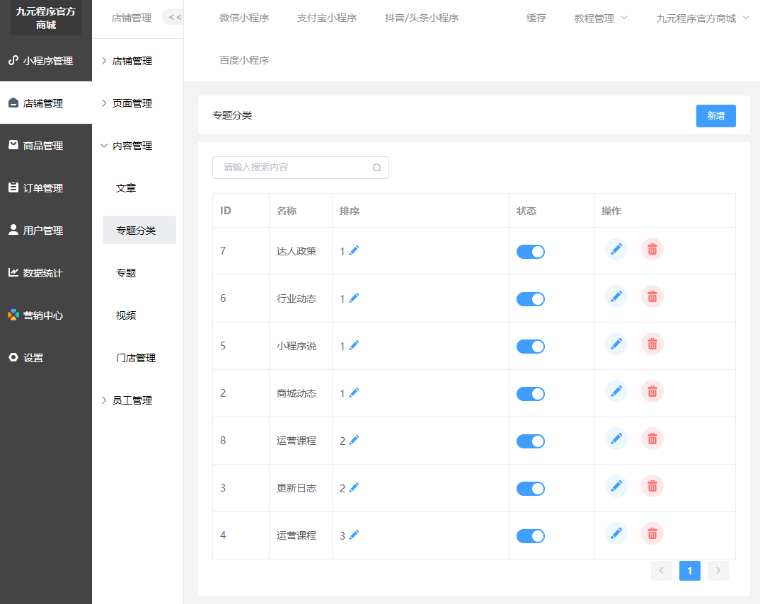 ### 专题分类 #### 用处: 主要用于专题的分类。  - 支持专题分类名称搜索 - 支持快捷排序 - 支持专题分类隐藏或者显示 - 在后台添加专题的时候选择分类  - 在小程序端专题里面显示