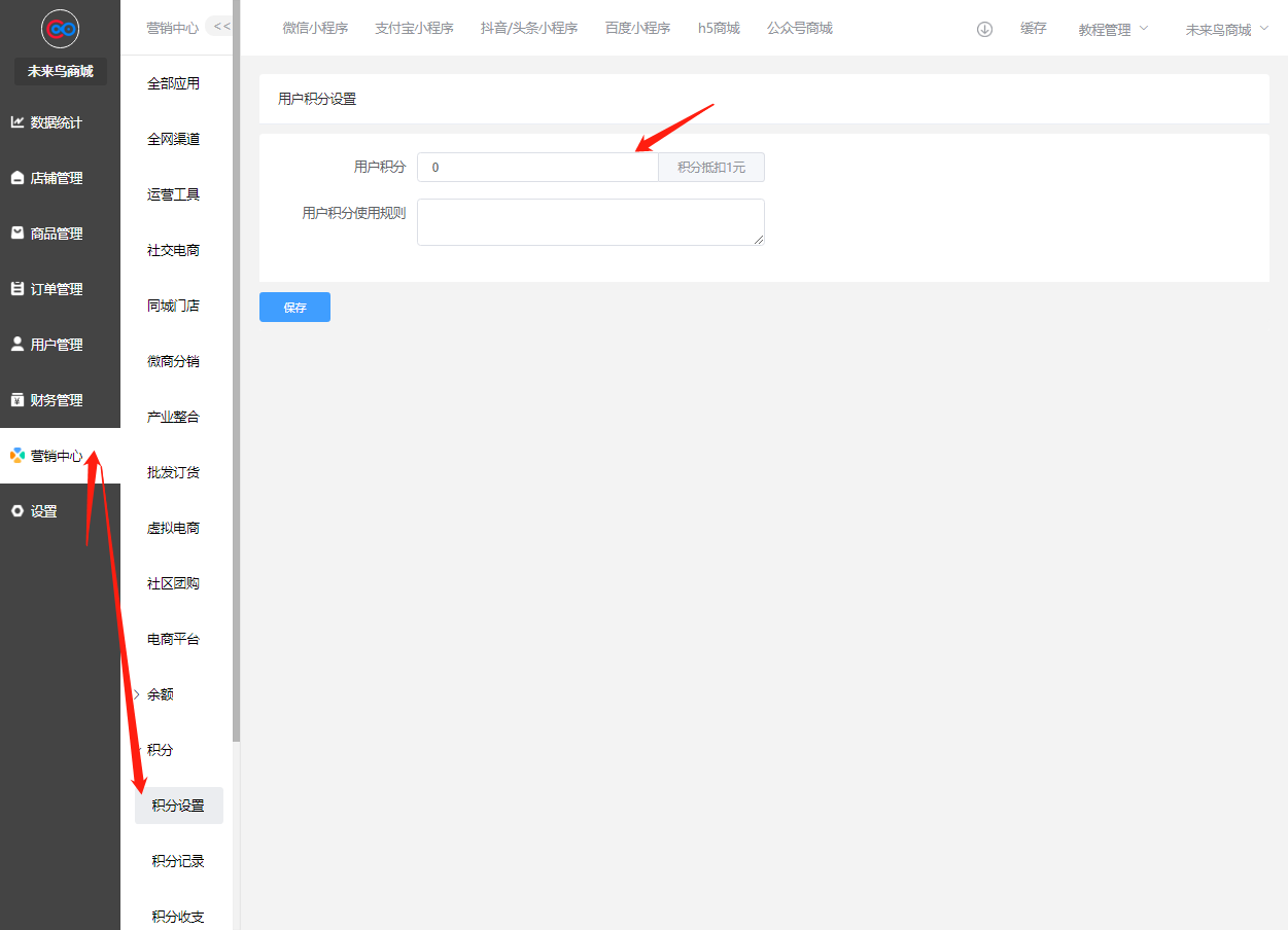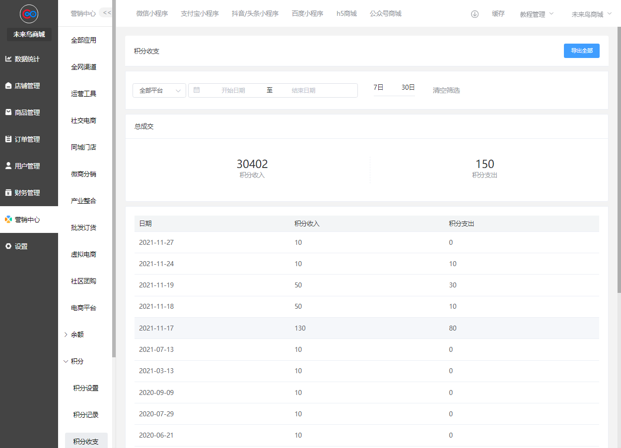 ### 积分 设置积分规则  查看用户积分记录  查看商城总积分收支记录