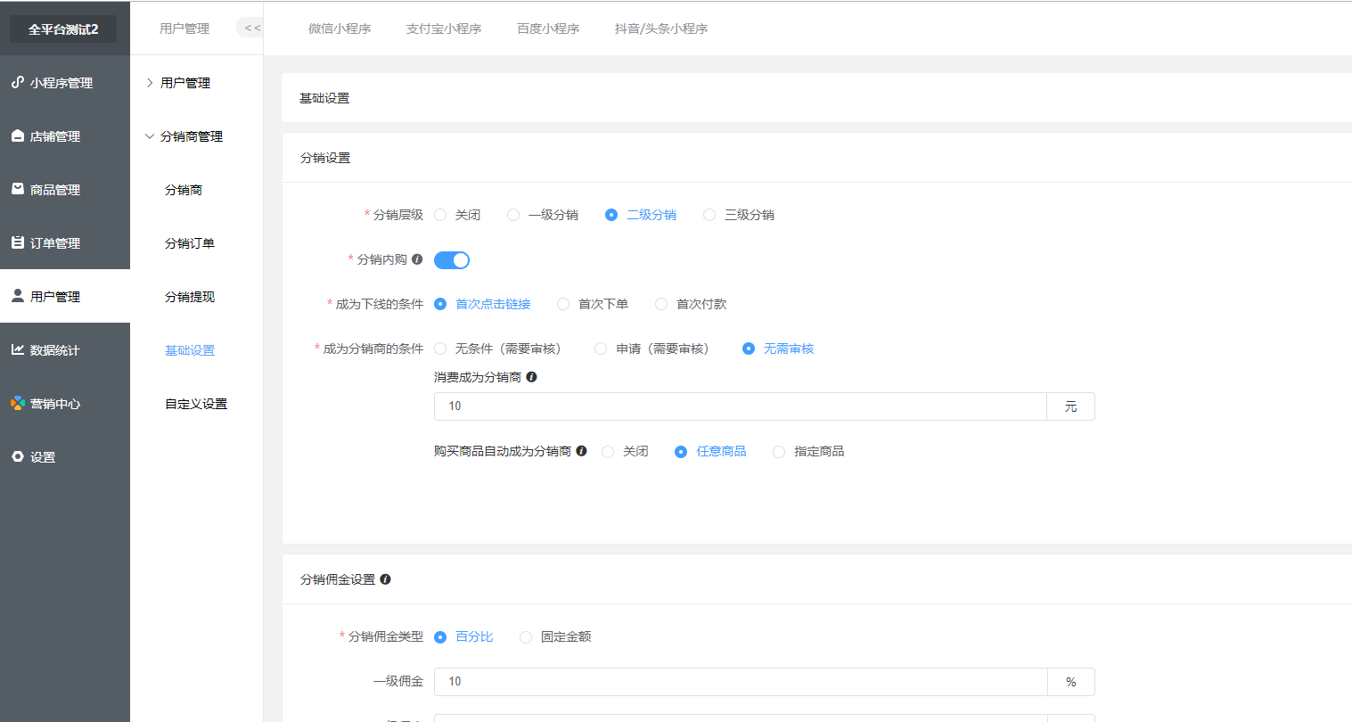 ### 分销商管理  开启使用说明 1.进入商城后台,进入用户管理-分销商管理-基础设置 2.若没有分销中心,请使用总管理员账号进入分配权限。