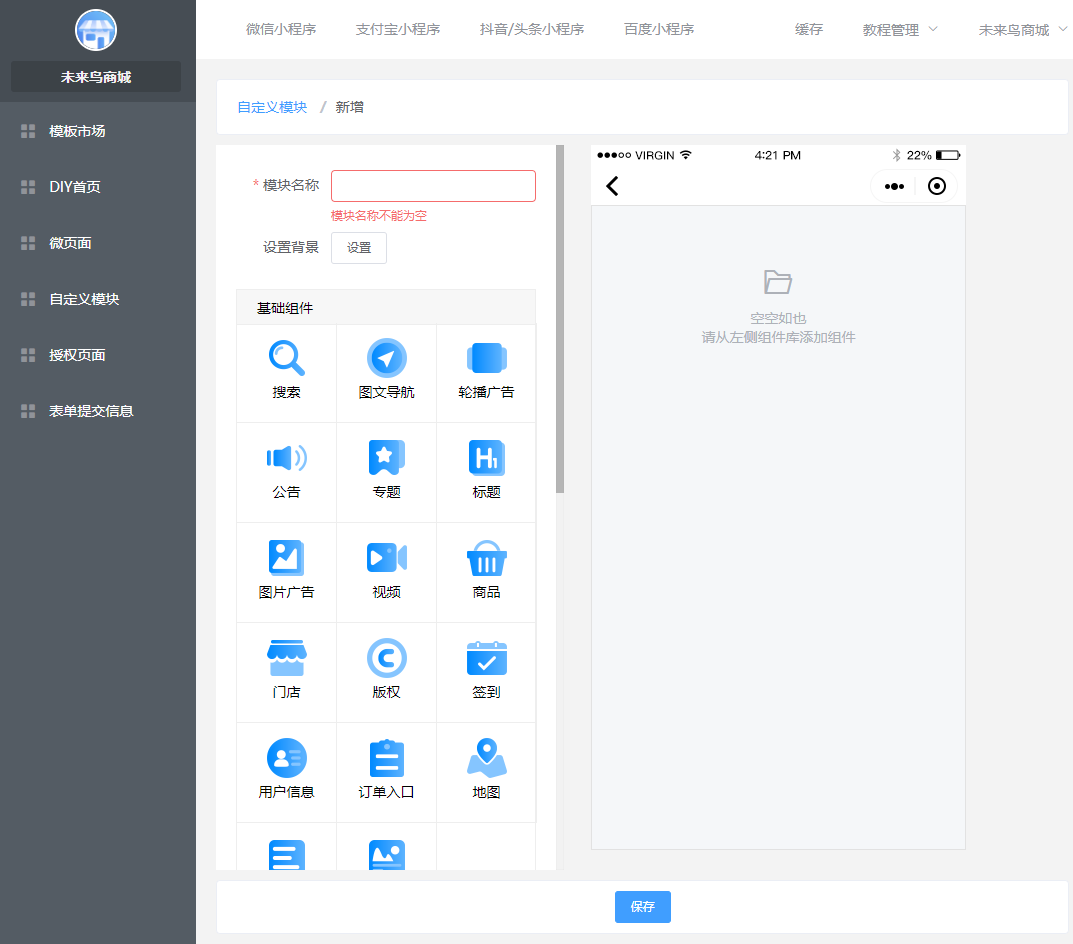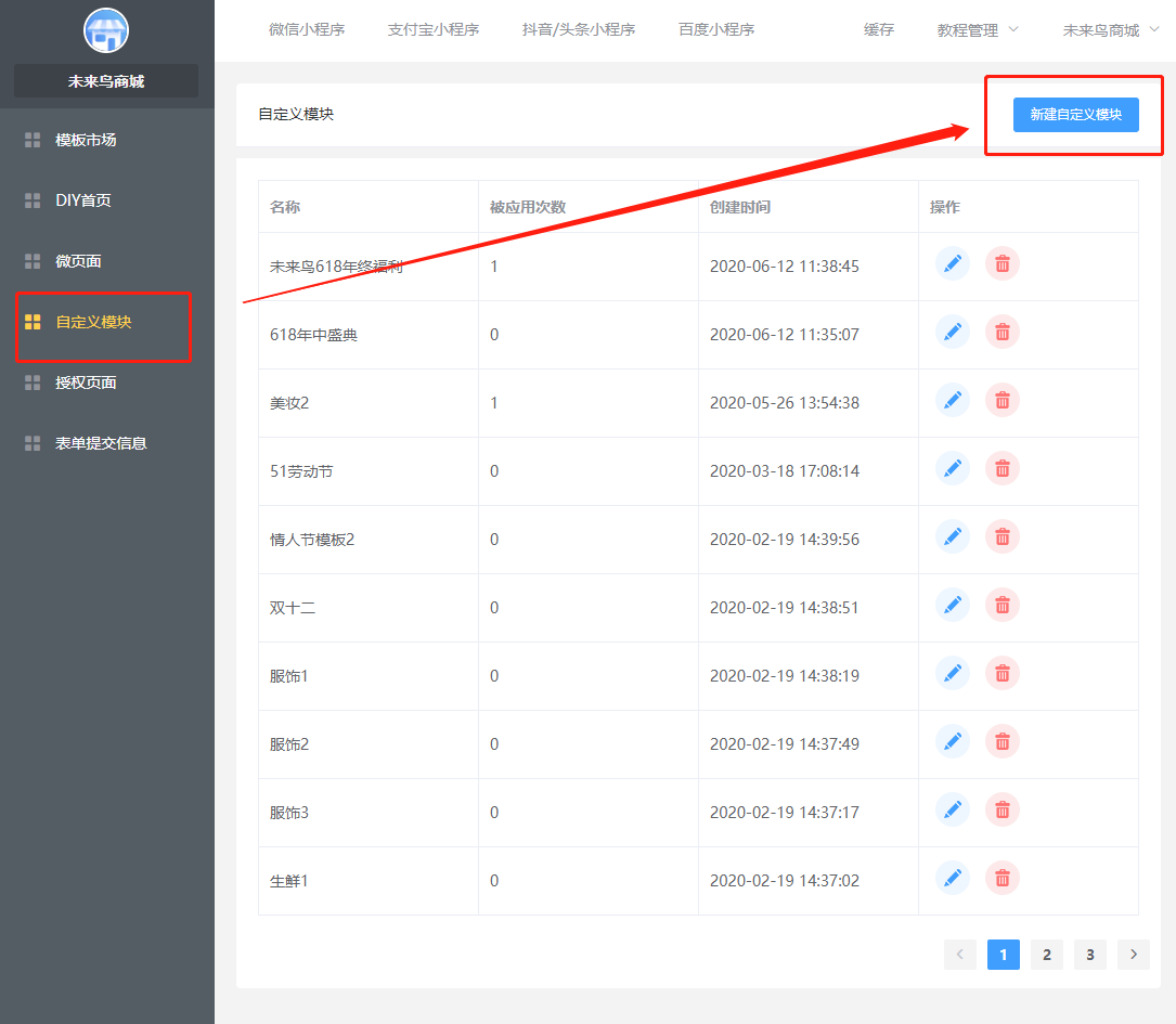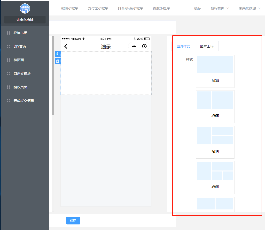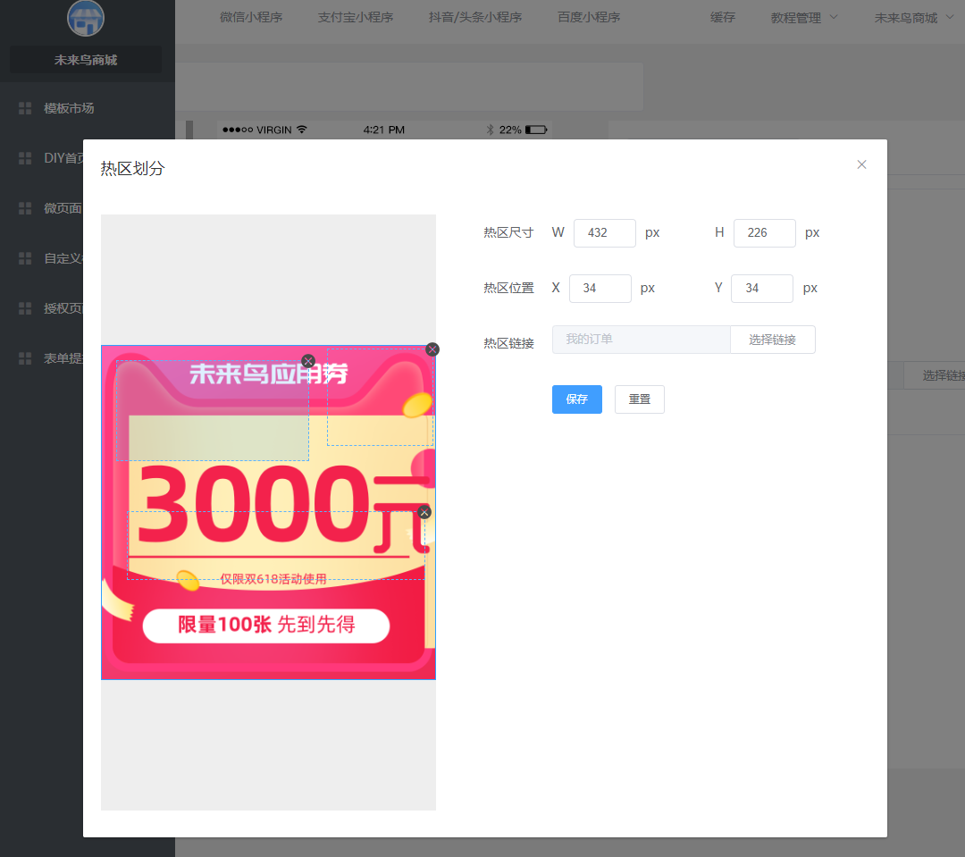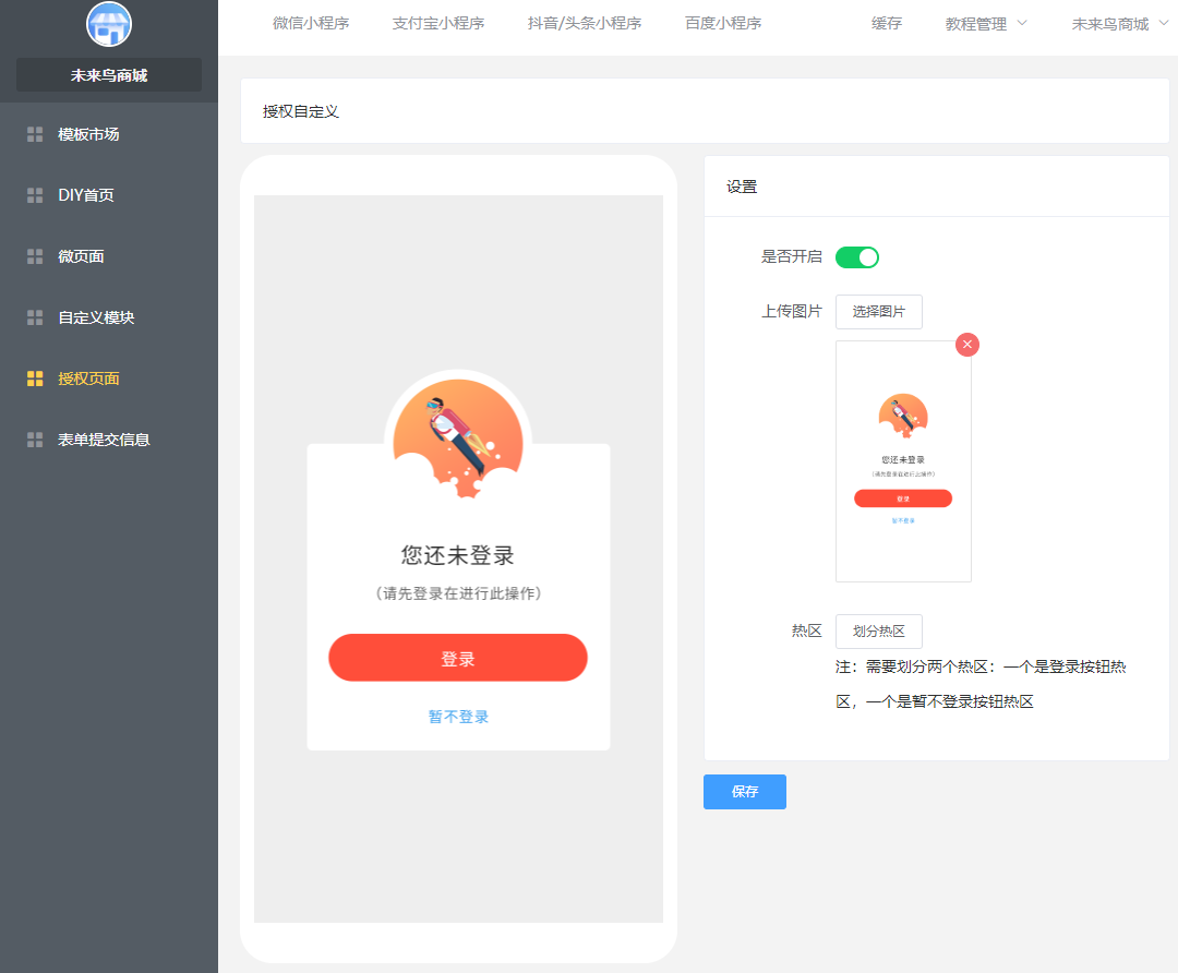 ## 一.商城UI的创建 ### 1.进入低代码设计插件  ### 2.创建或新建微页面  ### 3.选择模版  找到适合的模版,然后选择加载,如果是有一定UI设计基础,可以选择使用空白模版自定义设计。  加载成功以后,就可以去低代码DIY了 ### 4.编辑DIY页面  ==如果是第一次接触低代码DIY设计,请点击学习下新手引导== 左边可以选择:所有基础组件,营销组件,其他组件等,也可以做下页面设置和背景设置 右边可以选择:风格,细节调整,样式更换,以及链接的选择 整个编辑完,可以选择右下角的保存  ### 5.微页面设置首页UI 保存以后,返回微页面,设置首页  **当然了,您也可以在这里进行,UI的编辑,推广,首页设置渠道设置,设置浏览权限和分享设置等等**  到这里一般的低代码UI设计,就OK了,操作非常简单,就跟以前QQ空间DIY一样 ## 二.自定义模块使用(进阶)  ### 1 创建自定义模块   ** 注意:唯一性组件例如快捷导航,关注公众号这种在微页面中设置,要使用自定义模块 ** ### 2.设置首页 创建好微页面之后设置为首页  ### 3.其他地方调用 其他地方调用微页面(首页不需要) ### 4.链接器选择 在选择链接的地方,选择微页面  ### 5.页签设置 **在微页面使用自定义模块组件——添加模块(选择模板)——再次点击添加模块(添加页签)——编辑页签**   ## 三.图片广告热区使用方法 ### 1 选用图片广告组件 (右边选择图片样式,上传图片)   ### 2 划分热区 直接选择链接或者划分热区:热区功能表示可以在一个图片中点击不同的区域跳转不同的链接   ## 四.自定义授权页面使用规则  **当开启开关,可以使用自己上传的授权图片来替换默认的授权弹框图片,点击划分热区,设置登陆区域跟取消区域**  ## 五.模板市场使用  ## 六.关于DIY插件的介绍