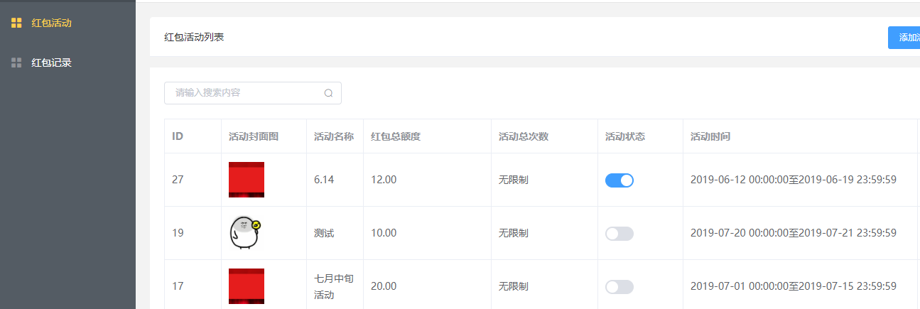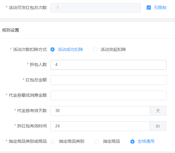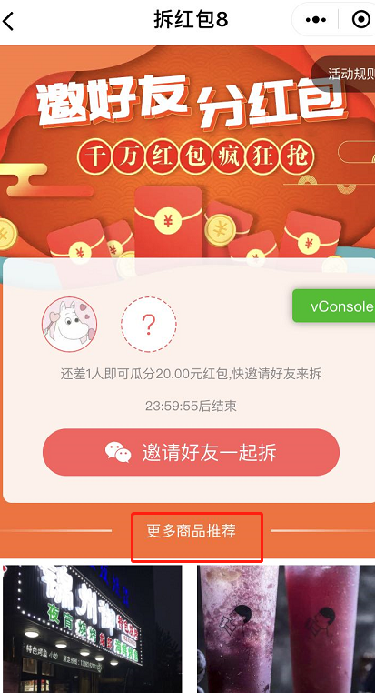 ### 关于裂变拆红包   #### 添加红包活动   #### 红包记录  #### 推荐设置 - 推荐商品状态开启,则用户拆开红包后有推荐商品 - 关闭自定义推荐商品的话,是按商品列表排序显示前10件商品;开启自定义推荐,根据添加的商品排序(最多显示20个商品)  #### 小程序端演示  #### 小程序端演示