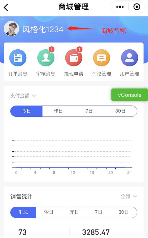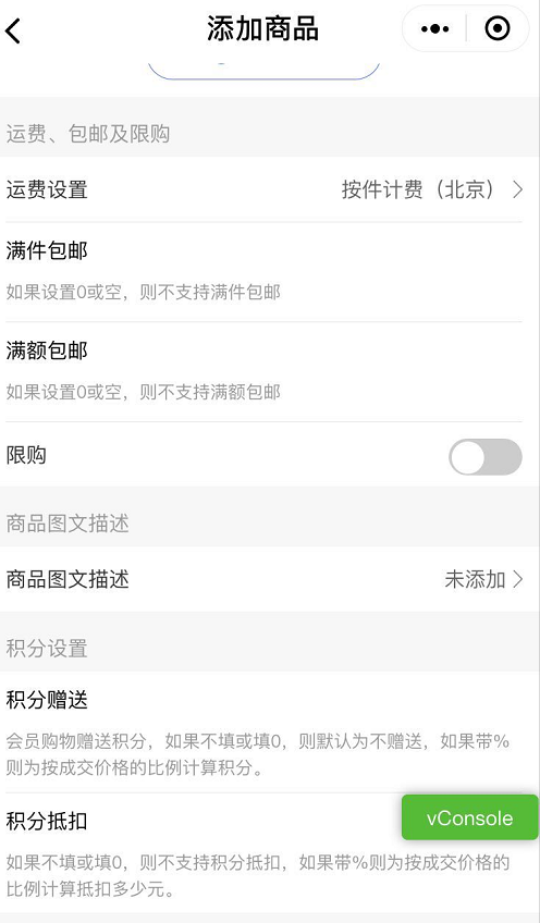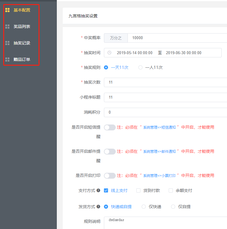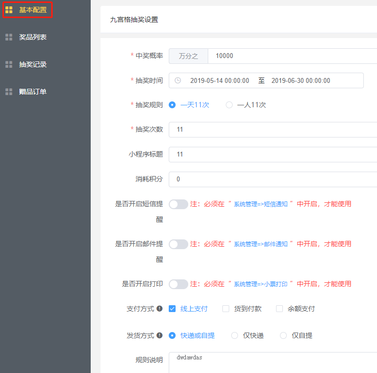 ### 关于九宫格抽奖   ### 基本配置 #### 九宫格抽奖设置  - 设置中奖几率:万分之xx - 注意:该中奖几率是指每次抽奖的中奖几率,先判断该次抽奖是否中奖,在中奖的情况下,从有库存的奖品中随机抽取,库存越大,几率越高。 - 抽奖规则设置: - 一天N次 指每个人每天的抽奖次数; - 一人N次 指每个人该次活动时间内一共能抽奖次数 - 消耗积分:每次抽奖需要消耗积分,不填或者填0不消耗积分 - 支持单独设置支付方式 - 支持单独设置发货方式 ### 奖品列表 #### 奖品列表  - 奖品可设置谢谢参与(默认),余额红包(余额),优惠券,积分,赠品(商城商品),必须要有一个谢谢参与 - 可设置库存,抽中既减少库存,注意:商品中奖之后发货是根据该商品管理中的库存去判断,诺该商品没有库存,会提示无法兑换 ### 抽奖记录 #### 抽奖记录 用户抽奖记录列表  ### 赠品订单 #### 订单列表  ### 手机端管理 #### 手机端管理 安装完插件后,在管理员列表添加管理员  添加完后去小程序管理-->用户中心选择插件-->商城管理。  #### 小程序端演示  #### 商城管理首页  - 可以筛选支付金额、支付订单数、支付人数、支付件数 - 支持全部、砍价、预约、积分、秒杀、拼团插件 #### 订单管理 - 首页的订单消息:用户下单、申请取消订单(也叫退款提醒)、申请售后的时候首页出现数字提醒,直到操作该笔订单。点击订单,可以直接进行查看处理   #### 订单管理 - 订单右侧显示订单状态。 订单列表  - 汇总:汇总里面有可以进行筛选,今日、昨日、7日、自定义  - 更多状态:待收货、待退款、已完成  - 售后订单  #### 审核消息 - 审核消息:有多商户插件的用户申请开店、开启分销中心后申请成为分销商,在这里显示。如果没有多商户插件只显示分销商审核消息,不开启分销中心有多商户插件则只显示多商户审核消息,如果两者都没有,整个审核消息关闭。 ##### 入驻商  - 入驻商审核详情  #### 分销商 - 分销商审核直接选择通过or拒绝  #### 提现申请 - 提现申请:多商户申请提现和分销商申请提现。如果只有多商户则只显示多商户的,只开启分销则只显示分销商的,如果两者都没有,整个提现申请关闭。  未审核里点击通过去未打款  #### 评论管理 - 评论管理:显示用户对商品的评价。  - 支持回复、隐藏。  - 回复的评论在已回复查看,支持修改、隐藏。  #### 用户管理 - 用户管理:如果没有开启分销,用户管理里面分销商不显示。 - 全部用户 - 支持充值、扣除积分和金额  #### 分销商  #### 核销员  #### 商品管理  #### 添加商品   - 多规格商品只支持一种规格比如 只有颜色、只有重量等。 #### 商城设置 - 短信通知跟邮件通知按钮如果后台不配置的话,那前端不显示整个按钮。