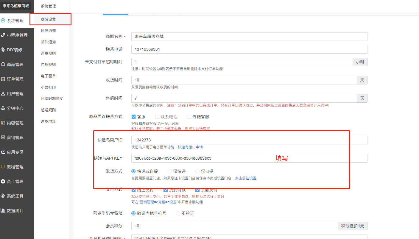 ### 快递单打印 https://player.youku.com/embed/XNDA2MzUyNDkyNA?client_id=70425dd755d80061&password=&autoplay=false#www.kancloud.cn - (1)电子面单接口是快递鸟提供给独立电商、仓储管理系统、物流供应链等物流系统平台使用的下单接口。 - (2)为客户解决在线发货需求,商户通过网络选择快递公司发送请求通知快递公司有快递要发货。 #### 请看配置的位置:  #### 用处: ###### 答:打印电子面单 #### 申请流程 - 申请快递鸟账号并通过实名认证,快递鸟信息配置具体教程如下 1、登录快递鸟进行注册 http://www.kdniao.com/ 2、进行实名认证  3、订购免费物流查询套餐  在这边查看到用户ID跟API key 返回 禾匠商城后台系统管理=》商城设置=》快递鸟填写信息  - 电子面单就是线下跟快递公司对接好之后,可以在线向快递公司下单,快递公司那边系统能收到下单信息并且提供一个对应的快递单号给我们,让我们自己打印,然后快递员会自己上门来取件 *设置发件人信息:  *添加设置项:  - 根据各自情况选择快递,电子面单账号信息需要找相对应的快递公司去获取 #### 使用场景: 在订单中待发货中订单,点击发货 选择设置好的快递公司,点击打印面单,快递单号自动从快递公司获取,不需要填写  也可以去快递鸟官网-->用户管理后台-->电子面单-->运单明细查看  选择批量打印,即可打印了 #### 效果: